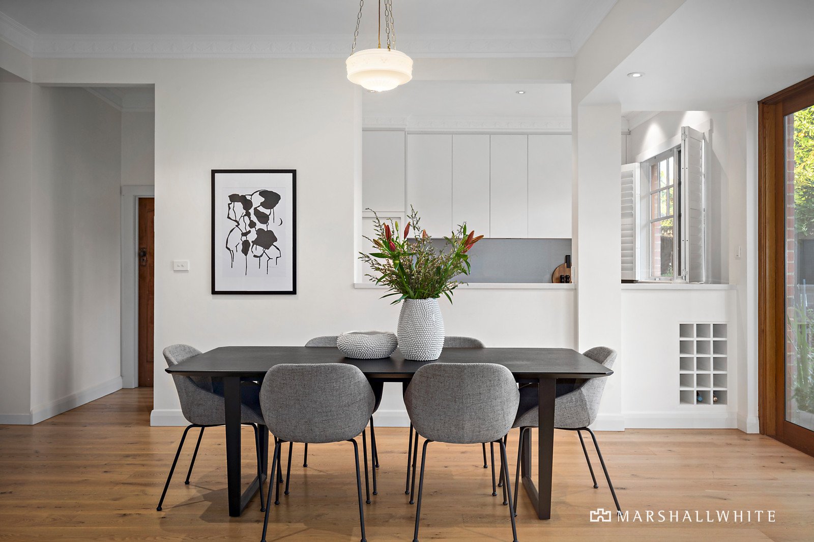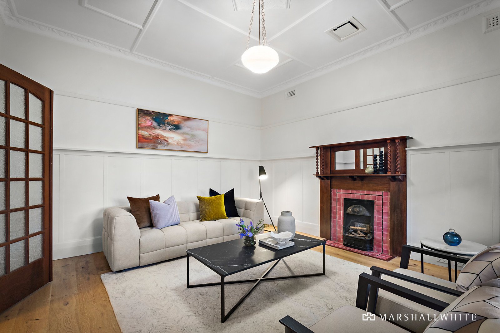 This classic early 20th-century solid brick home is set behind a private high wall and secure auto gates within established gardens featuring stunning magnolia trees. An undercover tiled verandah runs the width of the home, and the central entry doorway opens to reveal soaring ceilings adorned with intricate plaster roses and cornices, and light-filled, flowing, open-plan living/dining zones. Newly laid engineered oak flooring and well-positioned Velux skylights complement the rich character of original features including lead-light box-bay windows and an ornate fireplace. The central gourmet kitchen looks out to the pool and has stone benchtops and a 900mm ILVE freestanding cooker, while the adjoining living/dining space features custom joinery and there is an abundance of in-built storage and cabinetry throughout the versatile layout. French doors open out to the rear alfresco zone, with a rain-sensor vergola over the outdoor dining area, and the solar-heated swimming pool is set within red brick-paved surrounds and edged with lush gardens that feature citrus trees and herb beds. There is a built-in barbecue area in front of the home's original garage which has been converted to a studio/workshop.