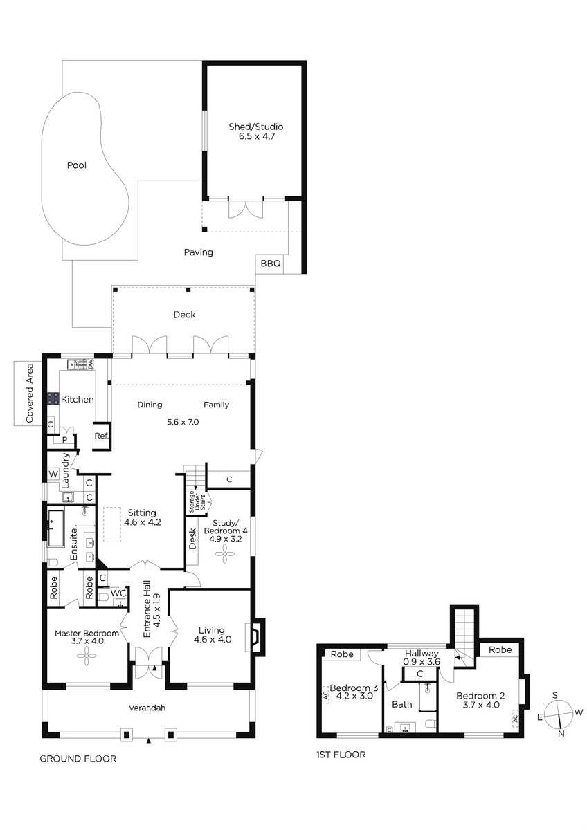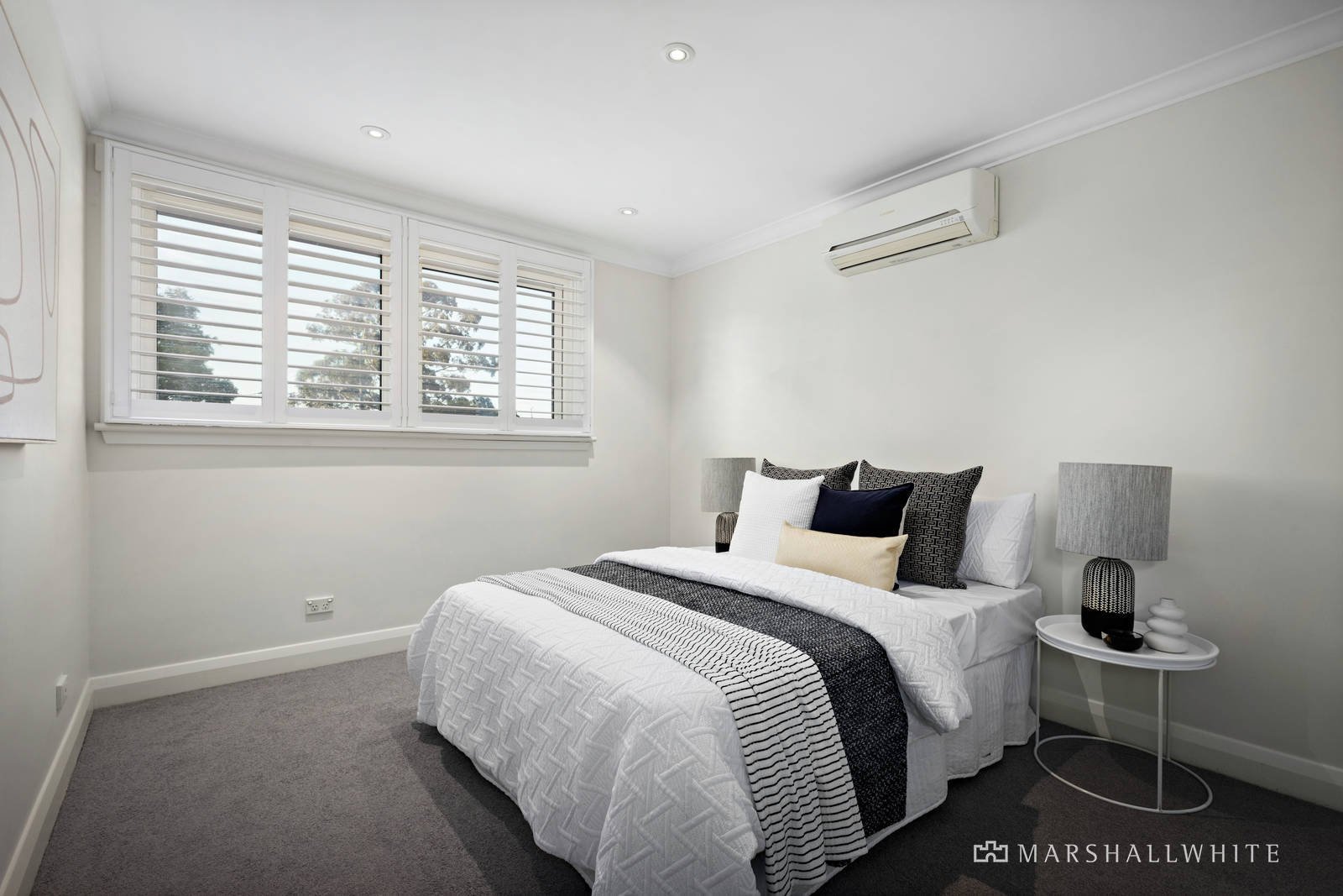 Positioned at the front of the home, the master bedroom has a walk-through robe and ensuite bathroom. Another ground-floor bedroom/study has an under-stair built-in robe and built-in custom desk, and the formal front living room with fireplace would also work well as a guest bedroom. The two bedrooms upstairs are bathed in northerly light, have built-in robes, and are serviced by the main bathroom with a walk-in shower.