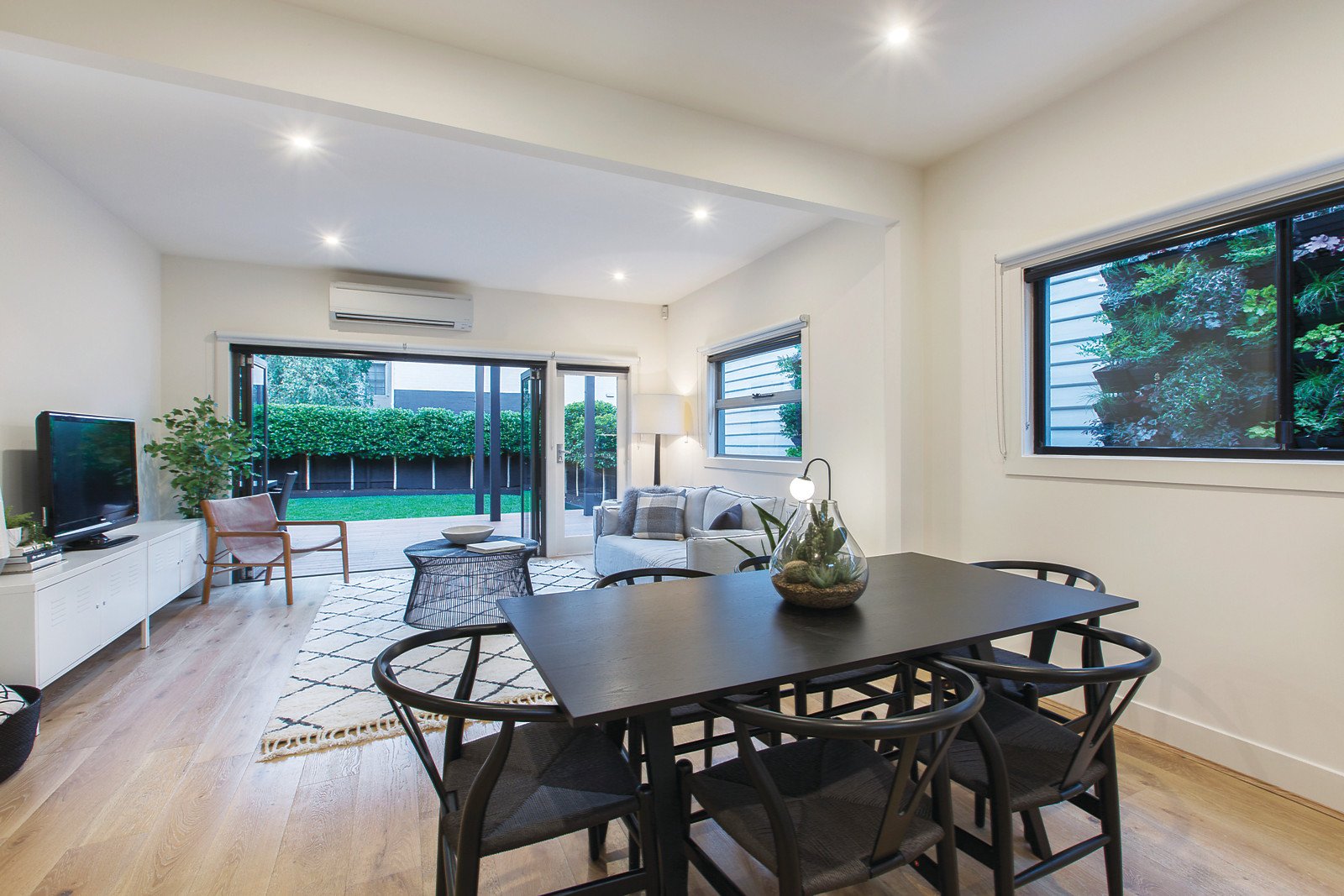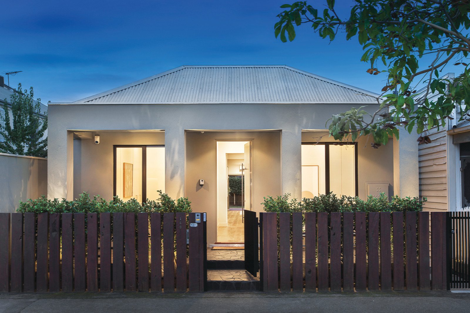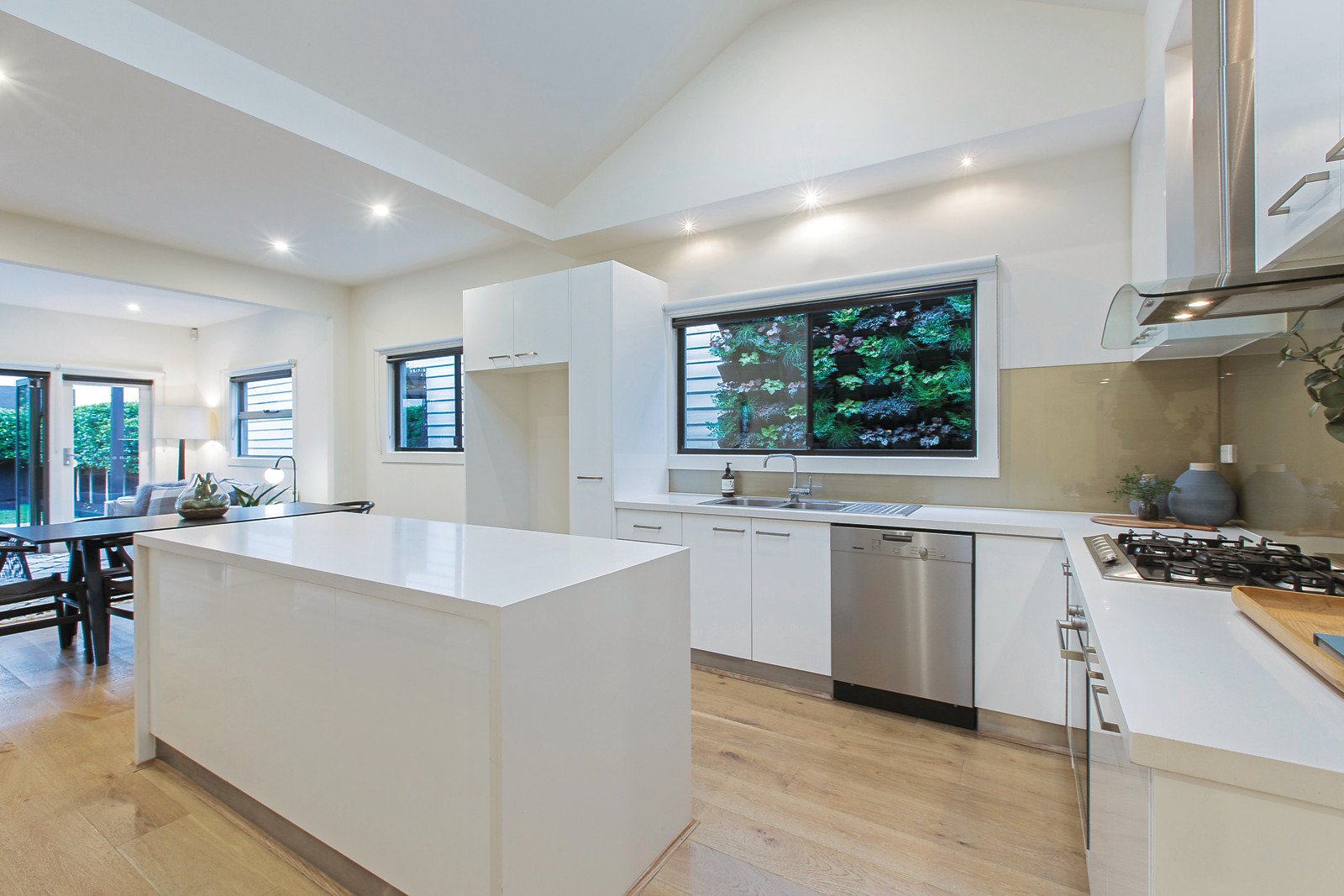 Behind a striking row of solid timber uprights, a wide central hall featuring high ceilings and oak floors leads to three beautiful double bedrooms with built-in robes and an elegant bathroom. Vaulted ceilings soar above the sleek white stone gourmet kitchen boasting Miele appliances. The sun-drenched and spacious living and dining room opens fully through bi-fold doors to a rare picturesque landscaped north-facing garden oasis with pergola covered entertaining deck.
