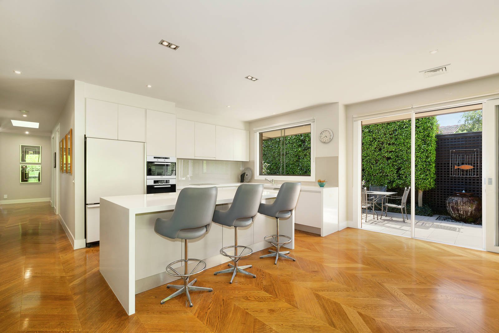 A wide hallway with solid European Oak herringbone parquetry floors flows to an elegant formal living room and four bedrooms, three with WIRs, main with fully tiled ensuite; a family bathroom, powder room and laundry with drying cupboard. Preceding an expansive north-east facing family living and dining domain with a concealed computer station/office and adjacent rumpus/media room. Enhanced by a superb, gourmet kitchen with CaesarStone benchtops, island bench and prestige Miele appliances. Opening to a northern paved alfresco dining and entertaining area with water feature - ideal for indoor/outdoor relaxation and entertaining both family and friends in complete privacy.