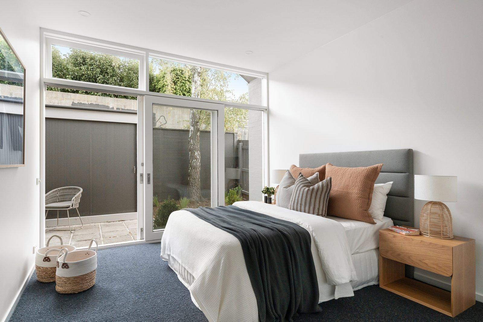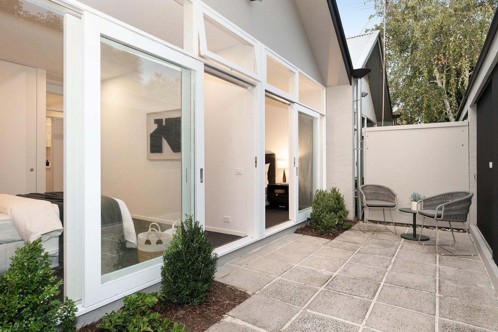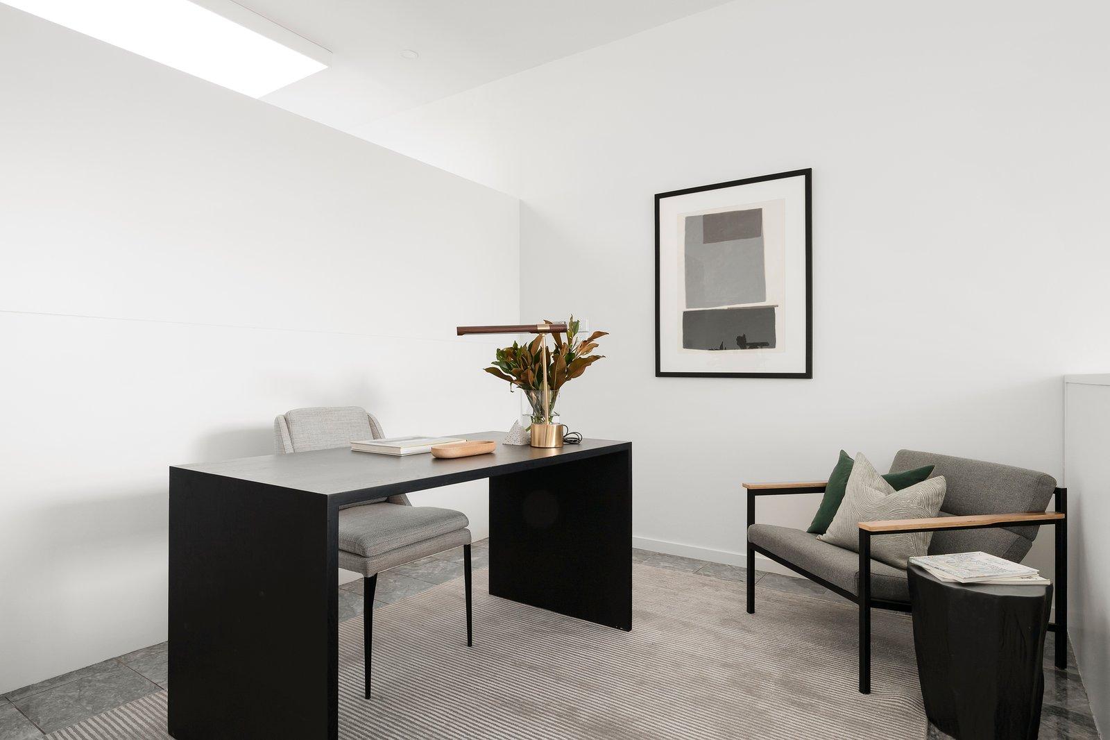 Extra high ceilings and marble floors define the generous living room and an elevated home office. The living room opens through glass sliders to a high walled north-facing garden. The modern well-appointed kitchen and inviting dining room overlook a private central west-facing courtyard. The main bedroom with en suite and built in robes complements two additional bedrooms (BIRs) opening to a rear private courtyard and a second bathroom and laundry, and separate powder-room.