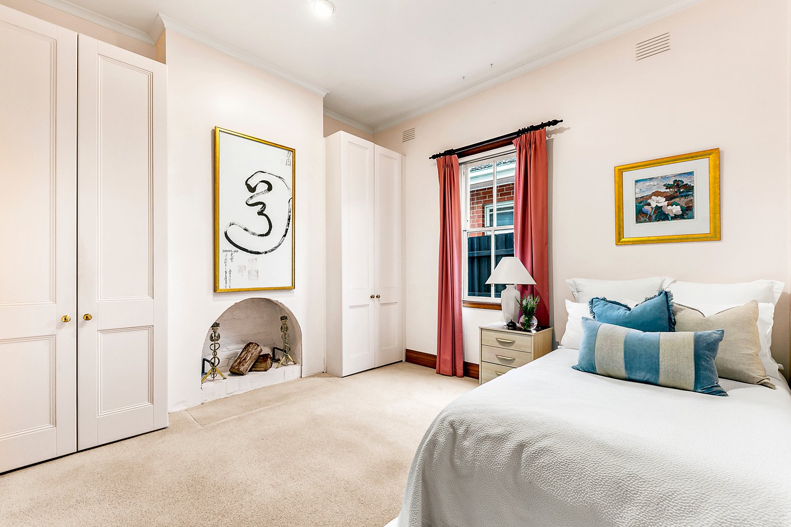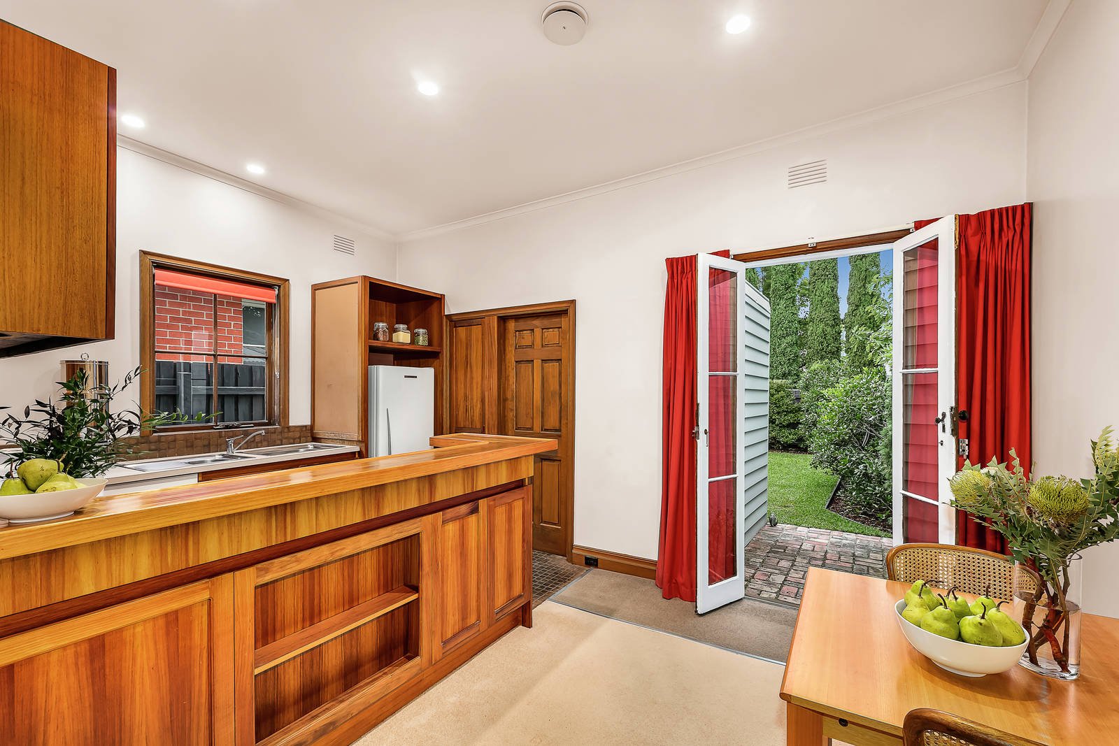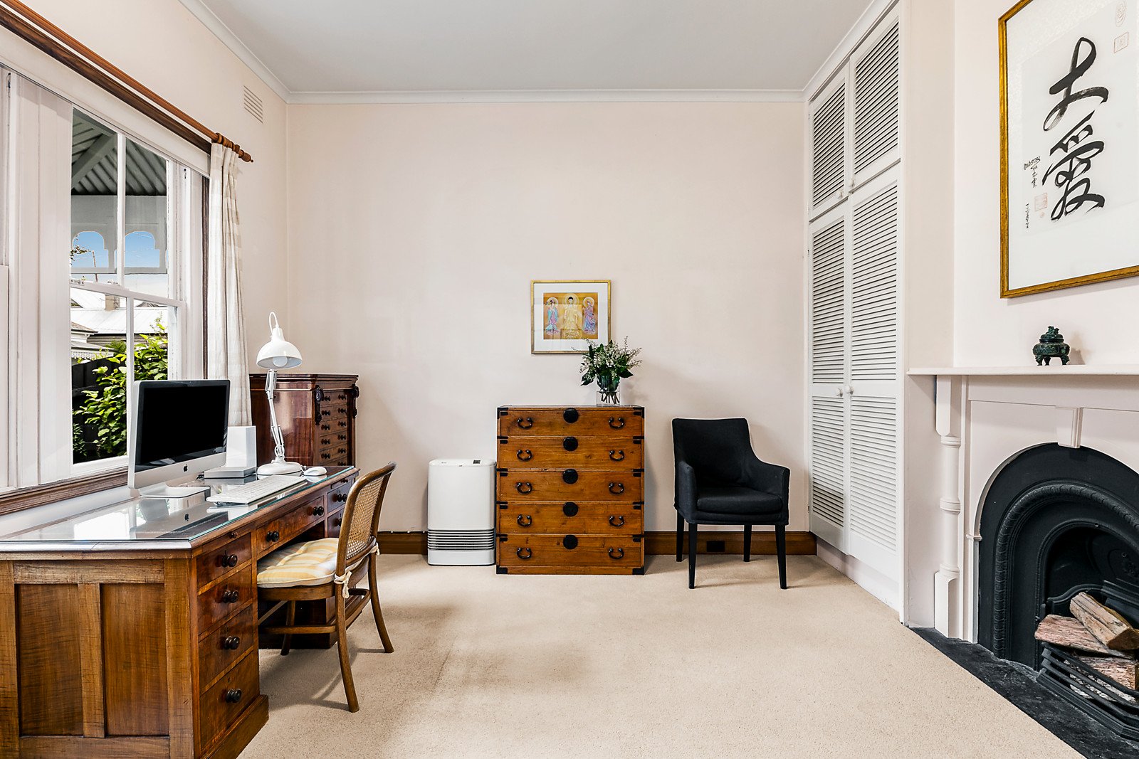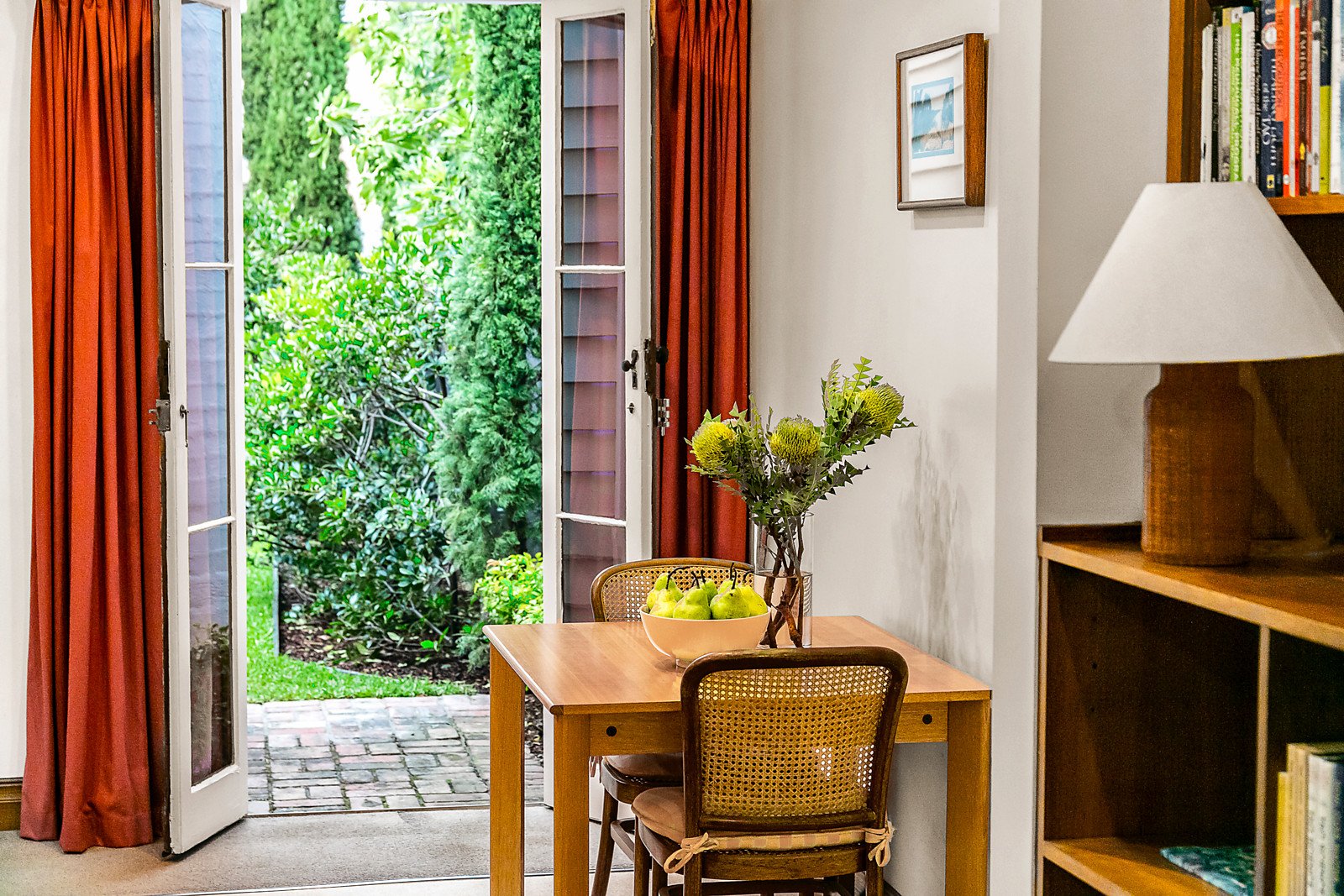 Behind the traditional façade, an arched hall flows through to a light-filled bedroom or home office with built in robe and open fire and a second double bedroom with built in robe and open fire. The generous living room with a fireplace, separate dining area and well appointed kitchen open to the deep entirely private and lush garden surrounded by greenery. A large tiled bathroom includes laundry facilities.