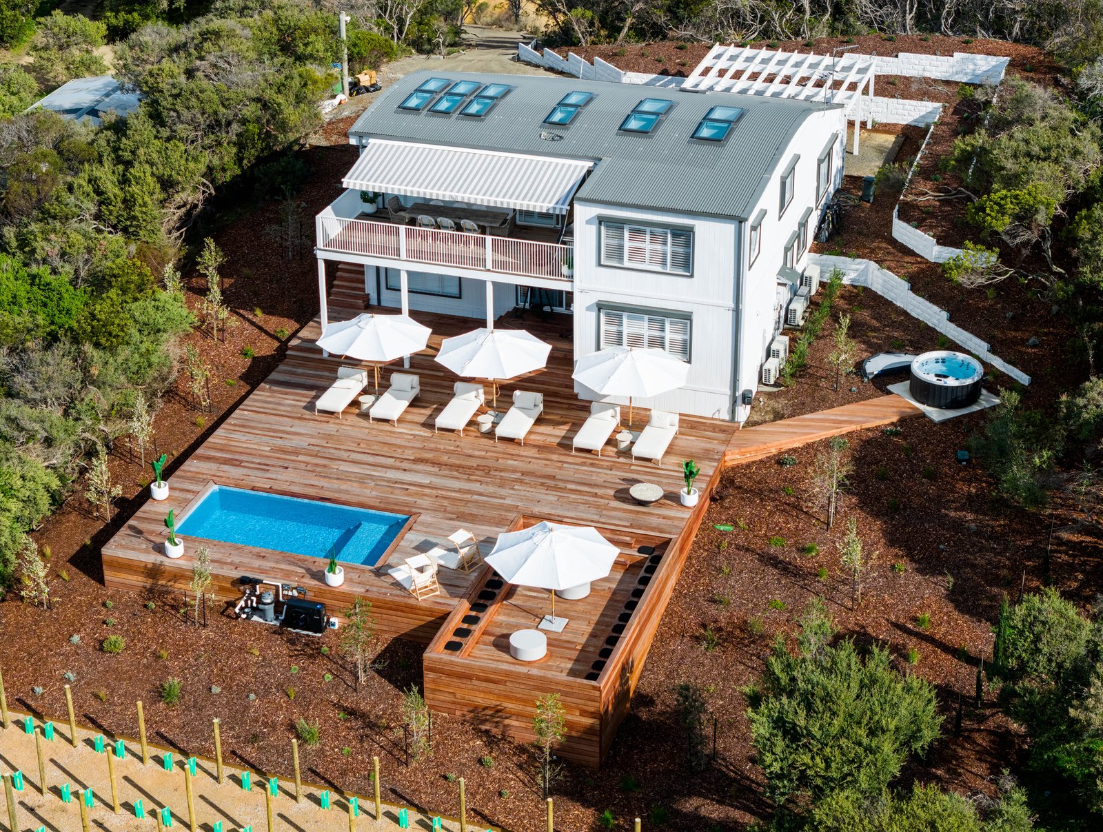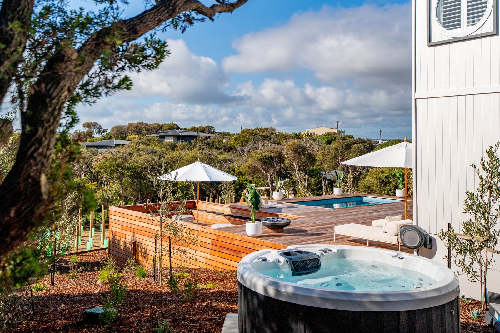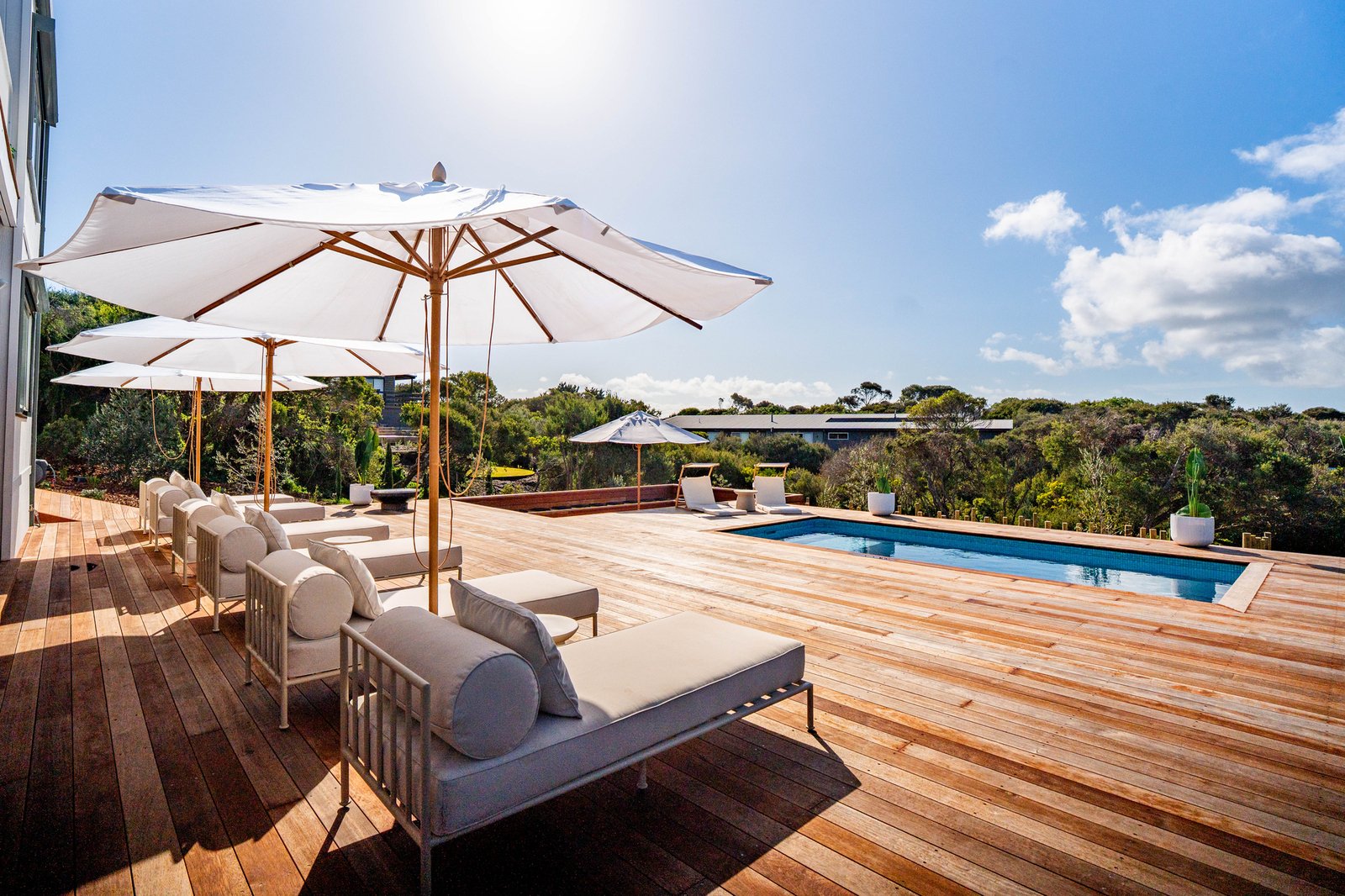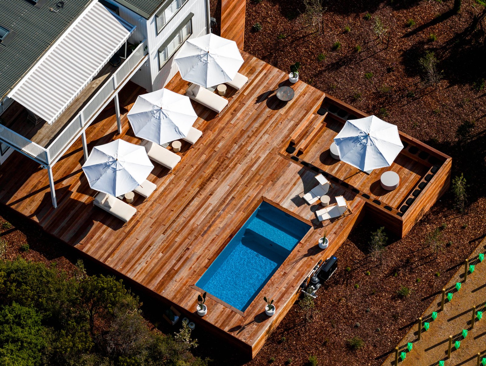 Endless decking sets the scene for the electric heat pump heated fully tiled pool, a sunken conversational sitting area, fire pit area, outdoor shower and a boardwalk leading to a circular spa. All of this overlooks a private, newly planted vineyard of 122 Pinot vines, capable of producing 160–220 bottles annually by year three, enough for a year of celebrations.