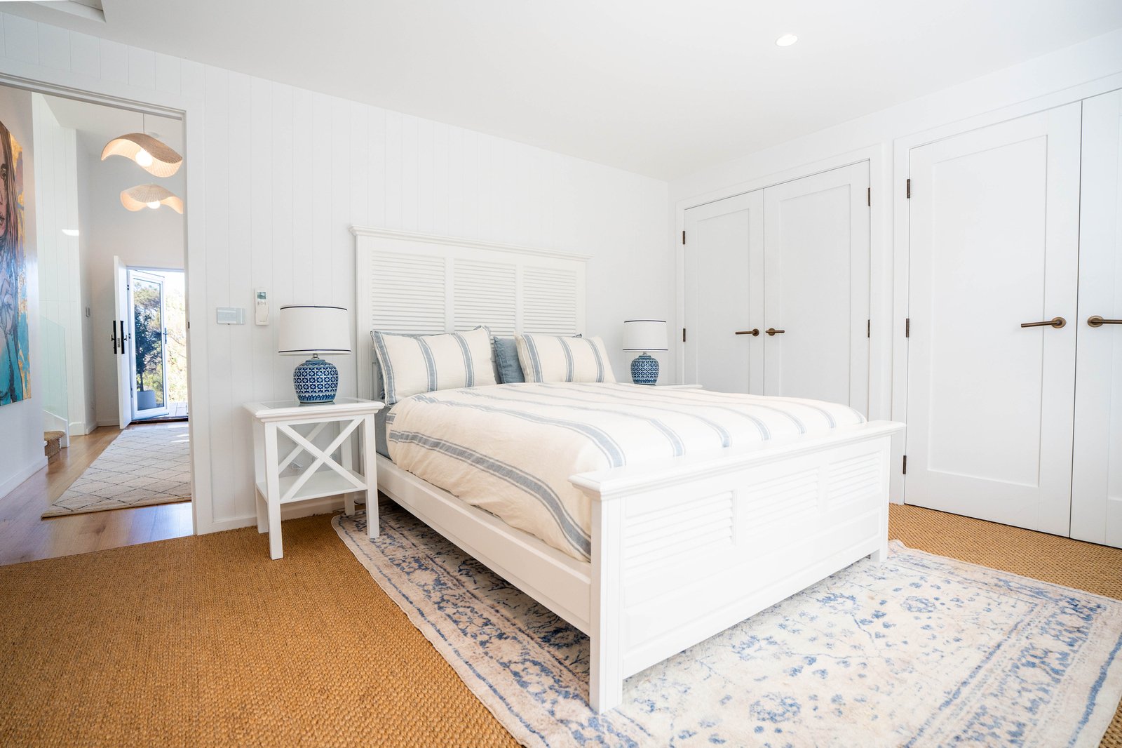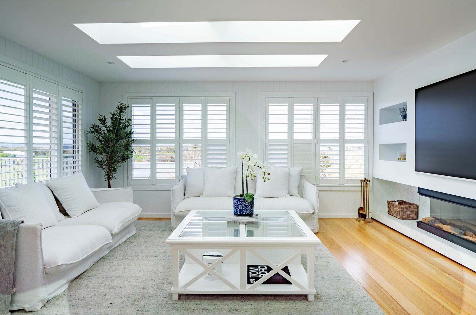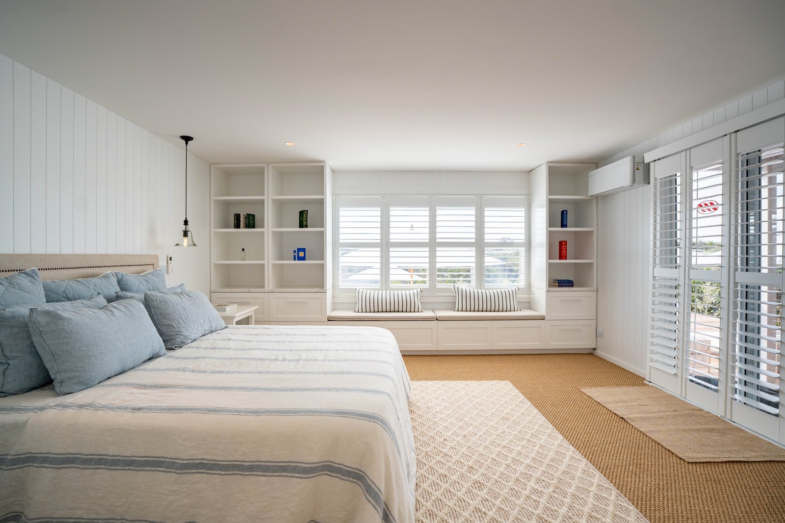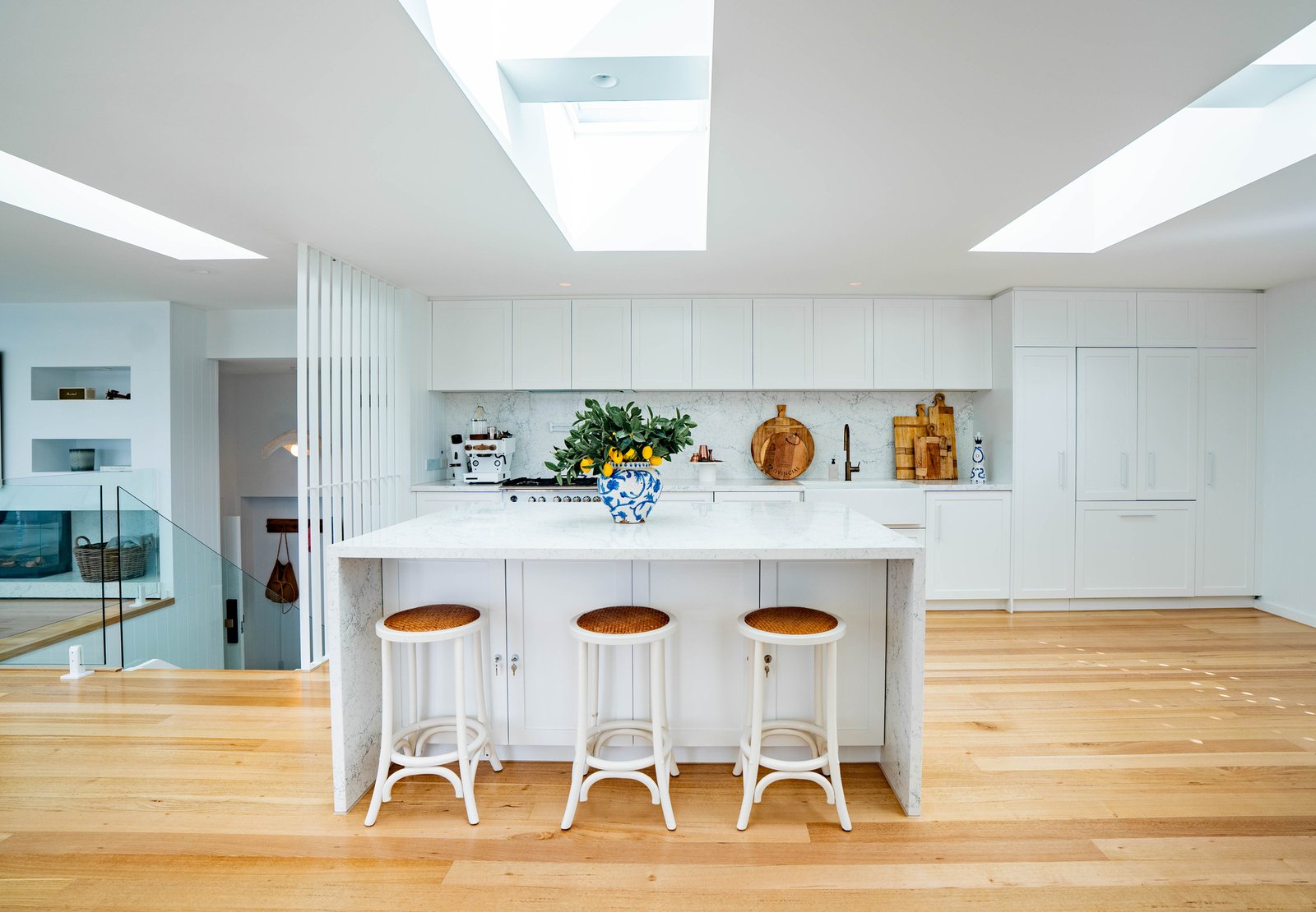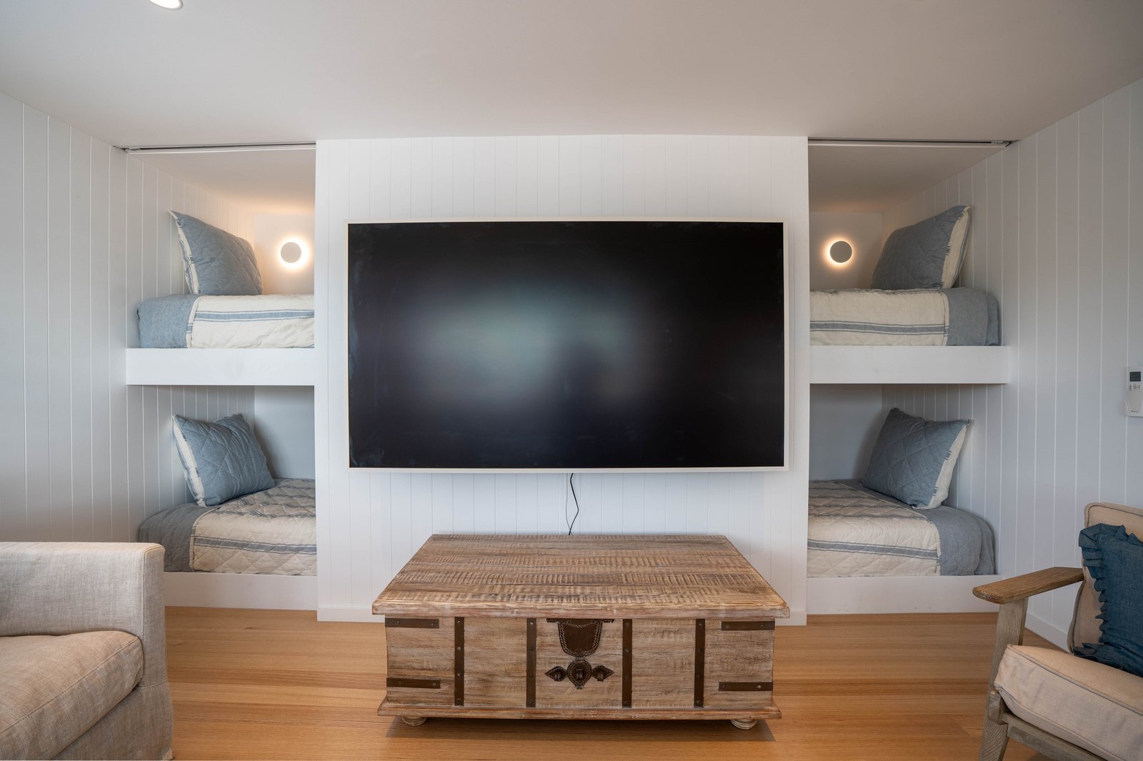 Inside, you’ll be impressed by the high level of detail, including the brushed brass/bronze fittings, VJ board panelling, solid Oak floorboards and marble look finishes. Over three levels, the entrance level showcases a private fitted study, stylish bedroom with robes and attic ladder, a vogue wet room style bathroom and glamourous powder room. The lower level uses powdercoated white steel/glass doors to create connection, with a huge one sliding open to a multi-purpose children’s living area with four concealed beds in bunk formation, plus a superb main bedroom suite with dressing room and luxe ensuite, and a custom laundry. The upper level is home to the incredible open plan living and dining area with its two metre wide electric fireplace, dining booth and stunning Hamptons style kitchen with its huge island, farmhouse sink, white Fisher & Paykel stove with pot filler, and Fisher & Paykel dishwasher and opening onto a fabulous alfresco terrace with café awning and heat strips, plus there is a fourth bedroom with robes and desk.
