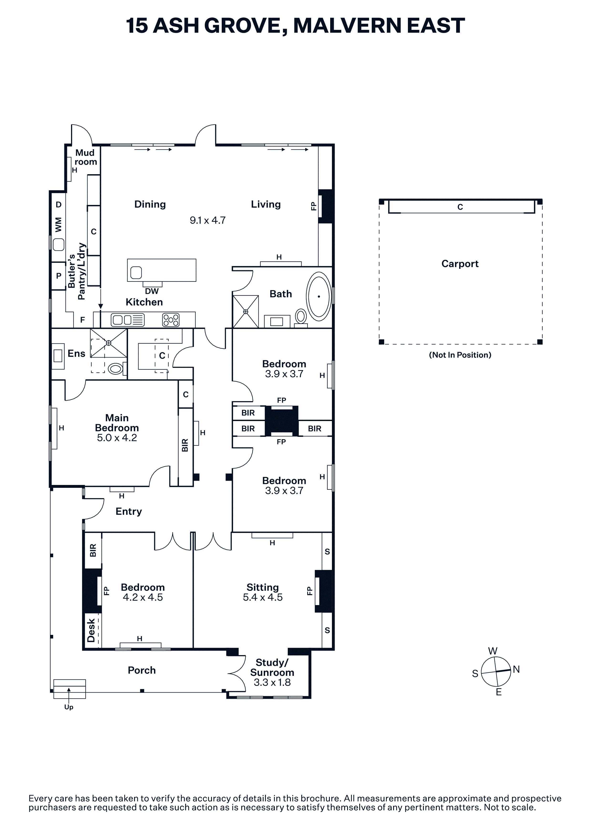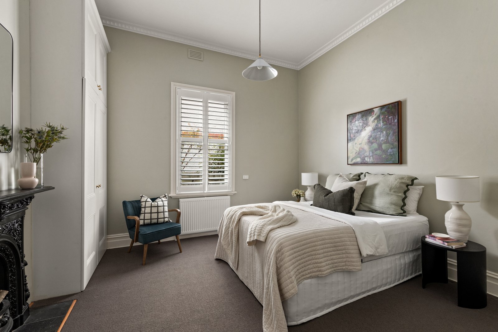 Dark Baltic pine floors add a richness to the glorious arched hall which flows through to a gracious sitting room with open fire, exquisite leadlight windows and an arched study alcove overlooking the garden. The expansive open plan living and dining room features a gas log fire and gourmet kitchen appointed with stone benches and a butler’s pantry. Two sets of sliders open the living spaces to the deep private west-facing leafy garden with large bluestone entertaining terrace and double carport with storage. The beautiful main bedroom with an abundance of robes and a designer en suite is matched by three additional robed bedrooms all with fireplaces and a stylish bathroom with freestanding bath.