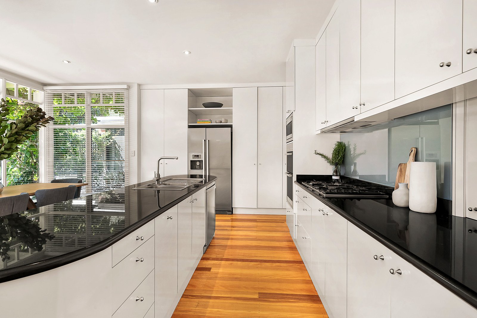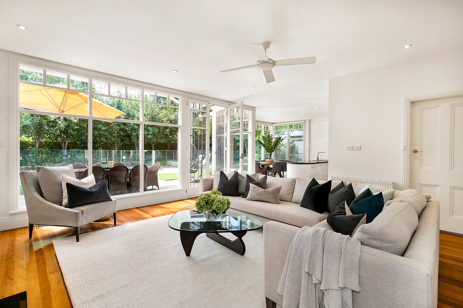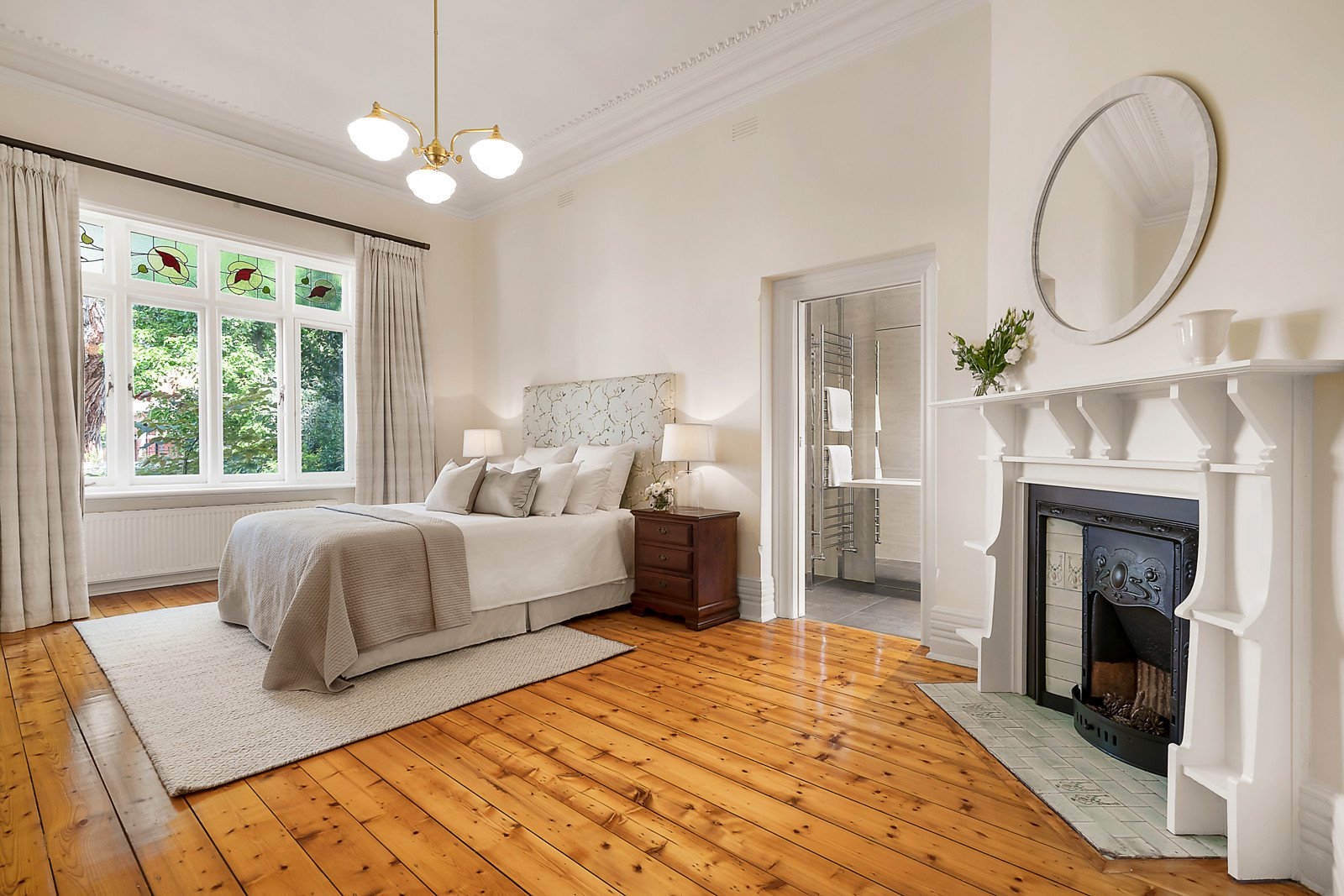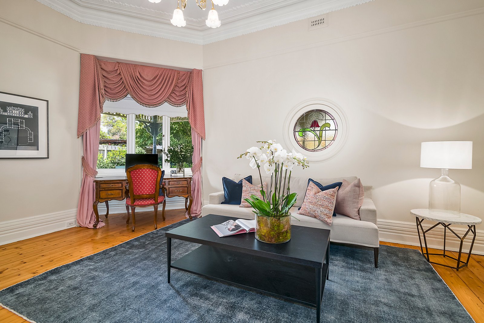 Magnificent original features including ornate ceilings, Baltic pine floors and leadlight windows are displayed through the wide entrance hall, a generous study with bay window and open fire and an expansive retreat or sitting room with open fireplace. Baltic pine floors also flow through the glorious main bedroom with designer en-suite, built in robe and three additional double bedrooms accompanied by two bathrooms. Northern light streams through the spacious living and dining room with a Jetmaster open fire and gourmet kitchen appointed with granite benches and Bosch appliances. The living spaces extend out to a large covered al fresco terrace with BBQ overlooking the private and picturesque north-facing garden with solar heated pool surrounded by a soaring hedge of Bradford Pear trees.