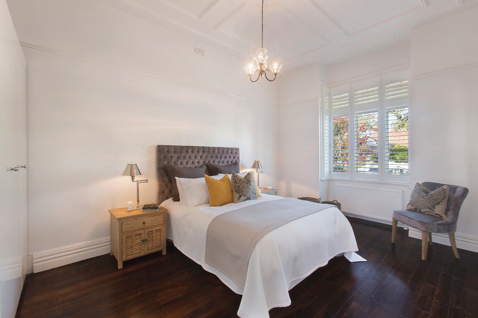 High ornate ceilings preside over the wide entrance hall and beautifully spacious living room with open fireplace. The country style white kitchen with 90cm Smeg oven and light-filled dining area open out to a deep west-facing garden with covered al fresco dining area. Four gorgeous bedrooms (BIR's) are complemented by two designer bathrooms.
