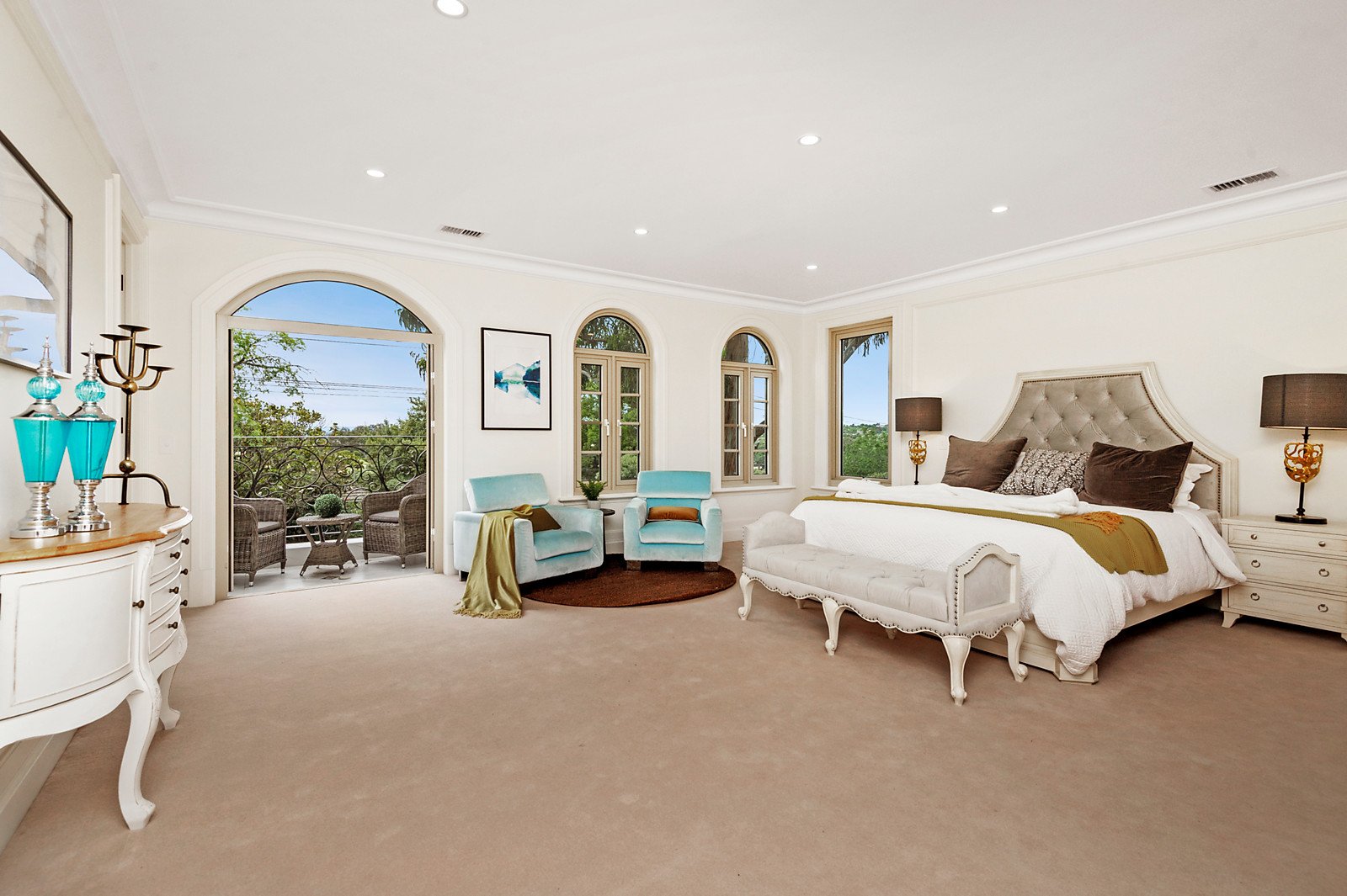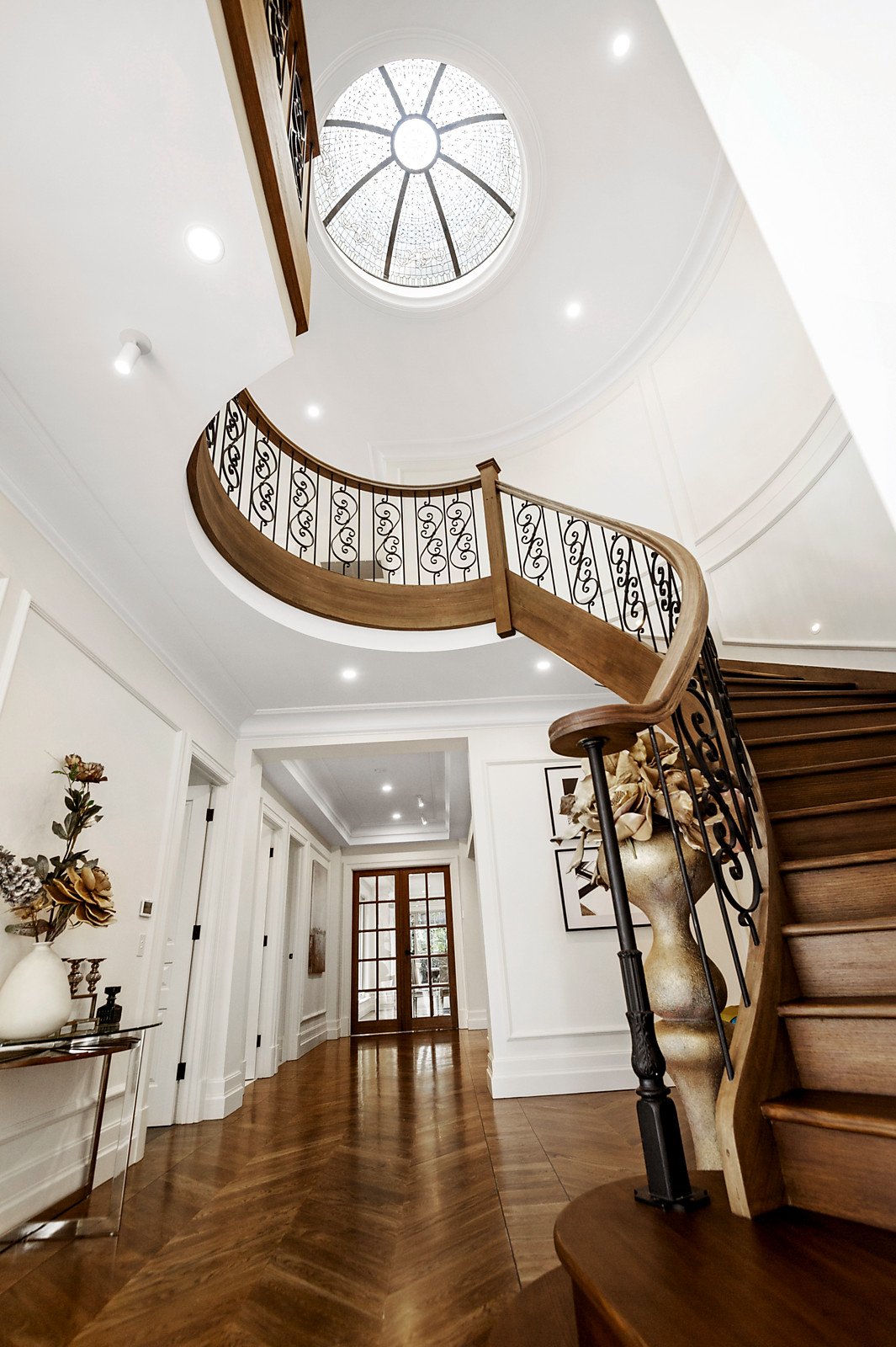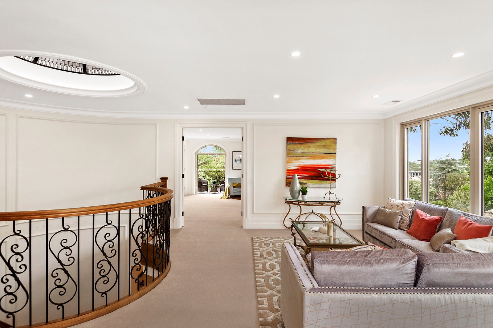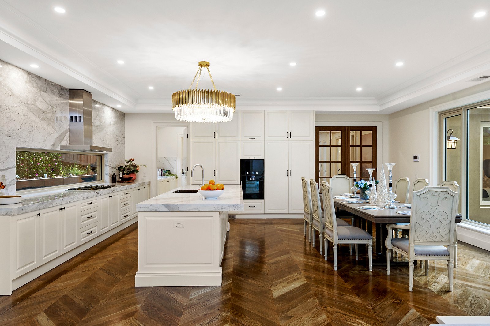 Defined by high recessed ceilings, paneled walls and oak parquetry floors, the wide reception hall introduces a gracious sitting room with a marble mantelpiece, gas fire and ornate chandelier, a separate theatre room, and a downstairs guest bedroom with marble Villeroy & Boch ensuite and walk-in robe. An expansive open plan living and dining room features a state-of-the-art premium kitchen appointed with Gaggenau appliances, integrated Liebherr fridge/freezer, swathes of marble, and a fully-equipped butler's kitchen. A stunning chandelier over the kitchen bench adds a wonderful touch of glamour. Stacked glass sliders open the living domain to a large covered alfresco terrace and private leafy garden. A beautifully curved wrought iron and timber staircase beneath a magnificent domed leadlight skylight leads up to the palatial main bedroom with a deluxe walk-in robe, lavish marble Villeroy & Boch ensuite with bespoke tiles, and a north-facing balcony offering views to Kinglake National Park. Also upstairs, are a further three bedrooms with marble Villeroy & Boch ensuites and walk-in-robes, a generous home office, and spacious rumpus.