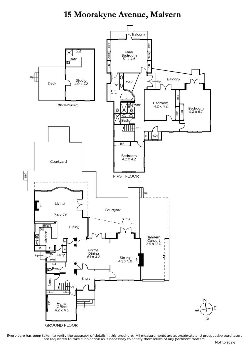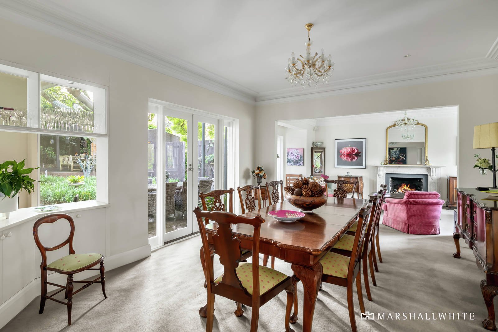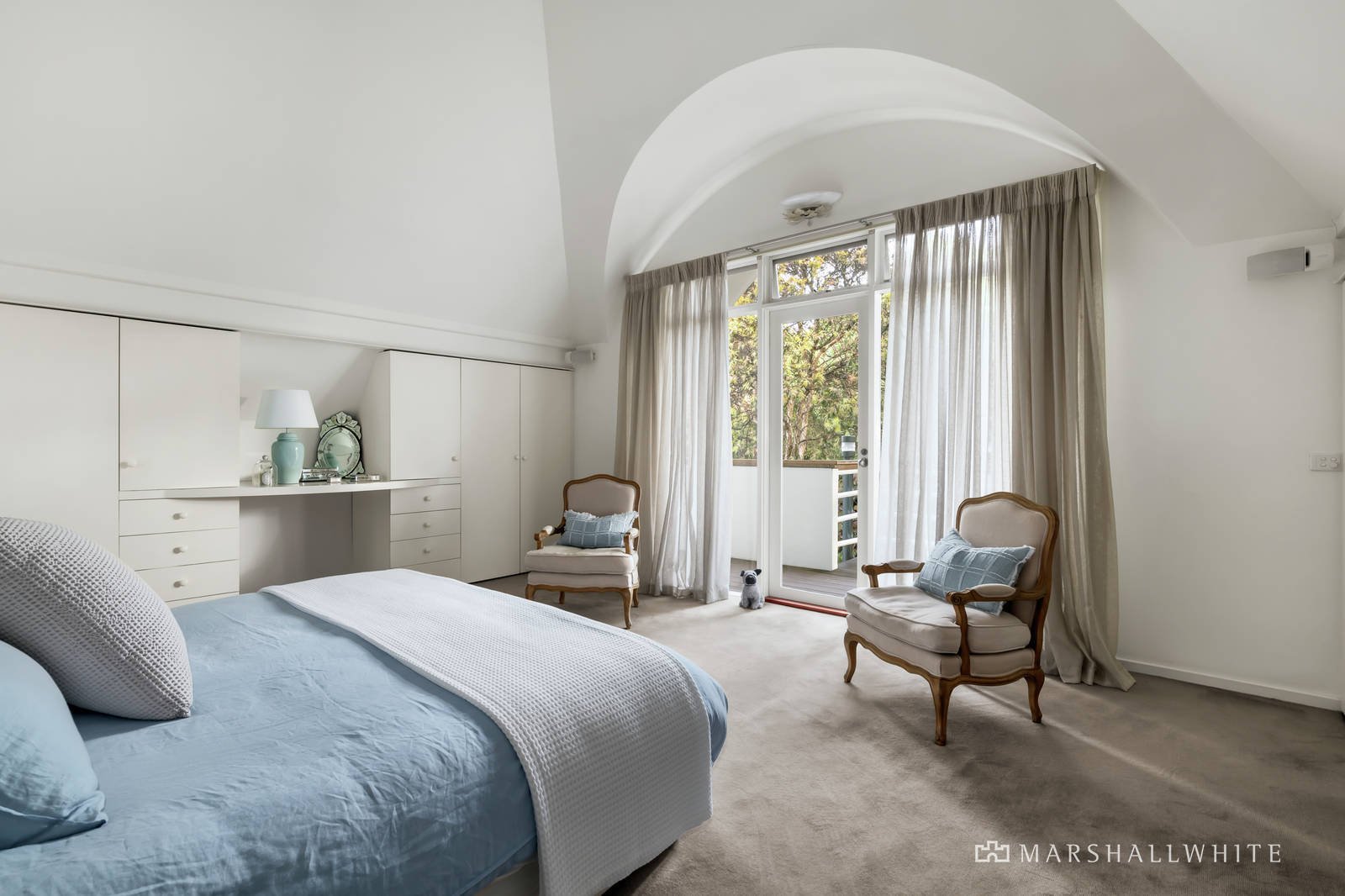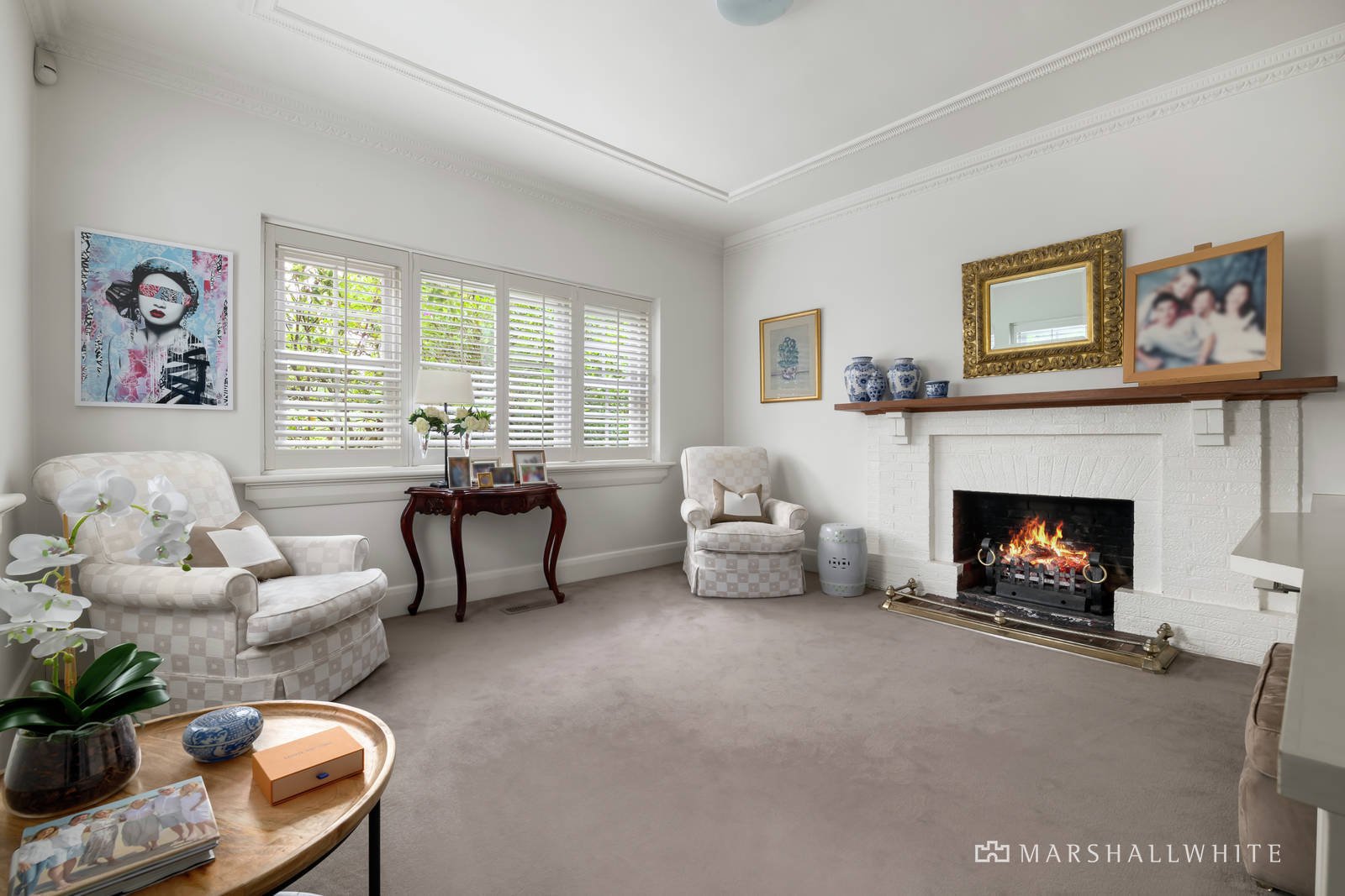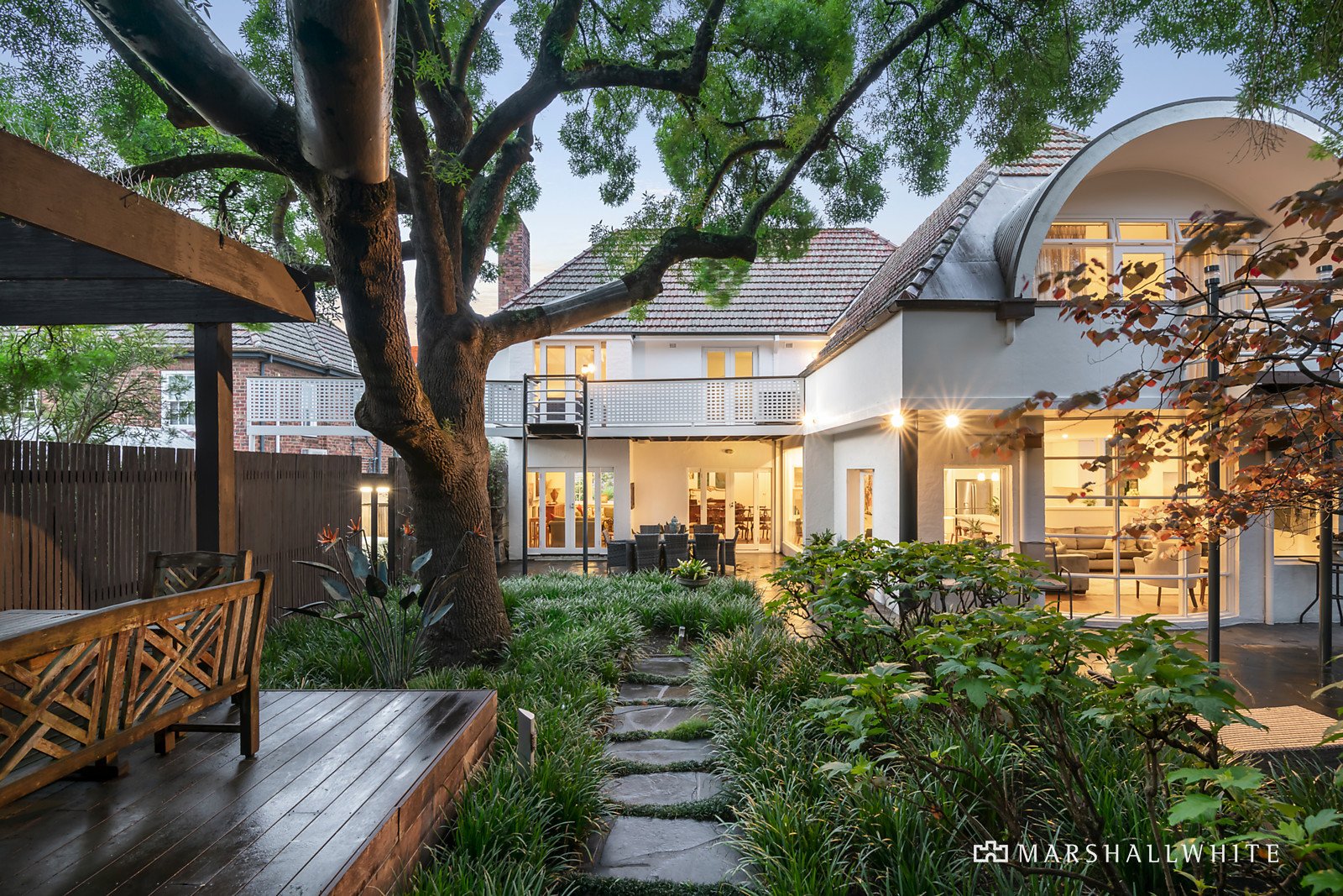 Commanding an elevated presence above the established front garden, the generous entrance hall featuring rich oak floors and ornate ceilings flows through to a library or study with gas log fire, a beautiful sitting room with gas log fire and an equally impressive formal dining room, both opening to the garden. Bathed in northern light, the gourmet stone kitchen and expansive family living and dining areas with gas log fire extend out to the private north-facing leafy gardens paved extensively with crazy paved bluestone and featuring a built in BBQ, entertaining deck and versatile studio/gym or 5th bedroom with bathroom. A soaring vaulted ceiling upstairs accentuates the sense of space in the sun-drenched main bedroom with north-facing balcony, built in robes and a deluxe designer en suite. In a separate wing, there are three additional bedrooms with robes, a second north-facing balcony and stylish bathroom.