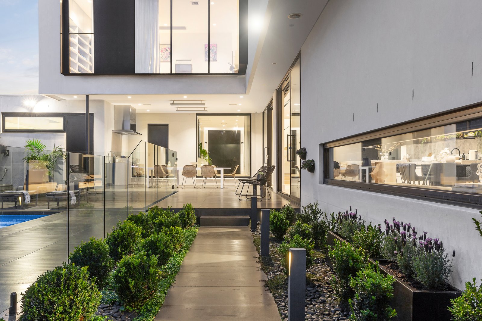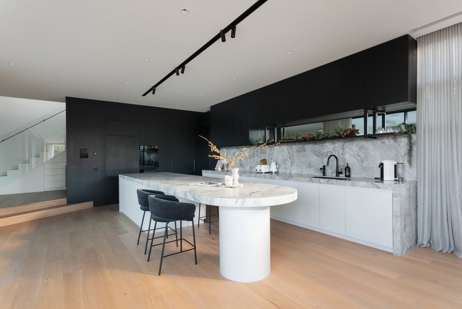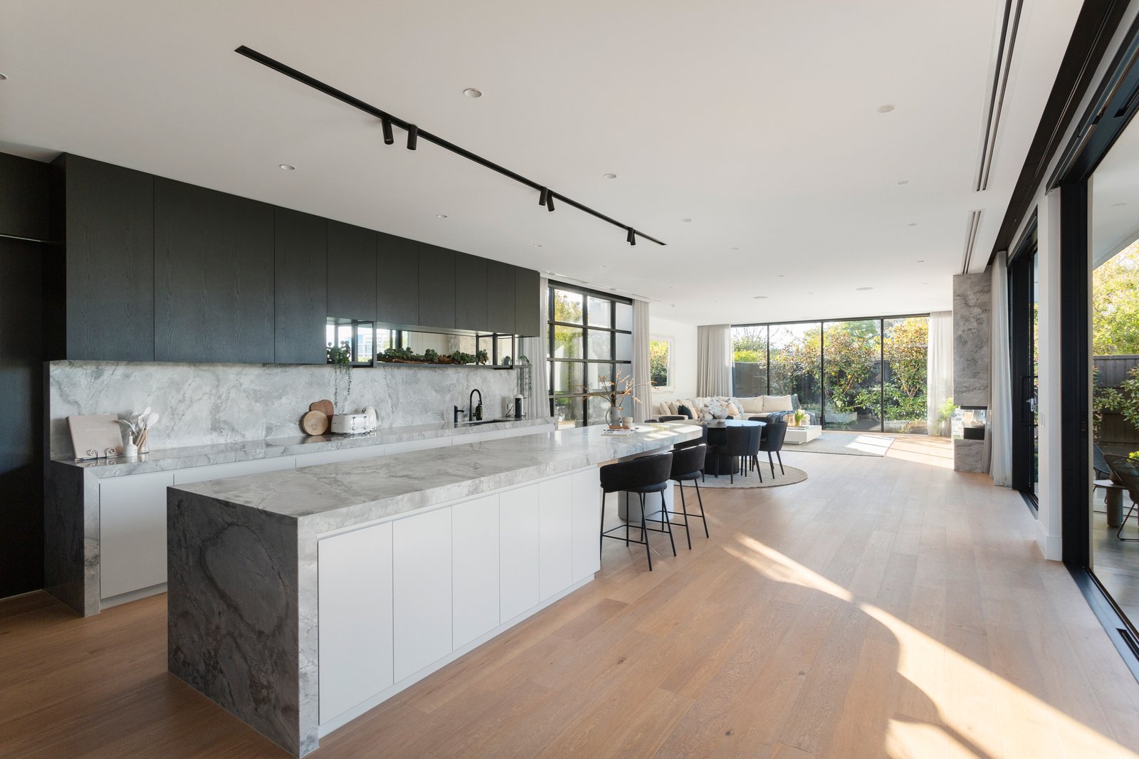 An oversized black pivot door makes a dramatic statement as it opens to a generous reception foyer and to one side an evocative home theatre. Expansive in scale, the light-filled open plan living and dining room features a gas pebble fire, 3m ceilings, oak floors, and a fitted wet bar. Catering impeccably to any culinary challenge, the sublime gourmet kitchen is appointed with Super White Dolomite benches, Miele appliances, integrated fridge/freezer, Zip tap and a butler’s pantry. The living spaces extend out through wide glass sliders to a large undercover bluestone paved terrace with BBQ kitchen, bar fridge and heaters, the ideal venue for all weather al fresco dining overlooking the landscaped northeast private garden and picturesque heated self-cleaning pool. An abundance of luxurious family accommodation upstairs comprises the beautiful main bedroom with designer en suite, deluxe dressing room, a second bedroom with stylish en suite and built in robe, two additional bedrooms with robes and a stunning shared en suite, a spacious retreat and fitted home office.
