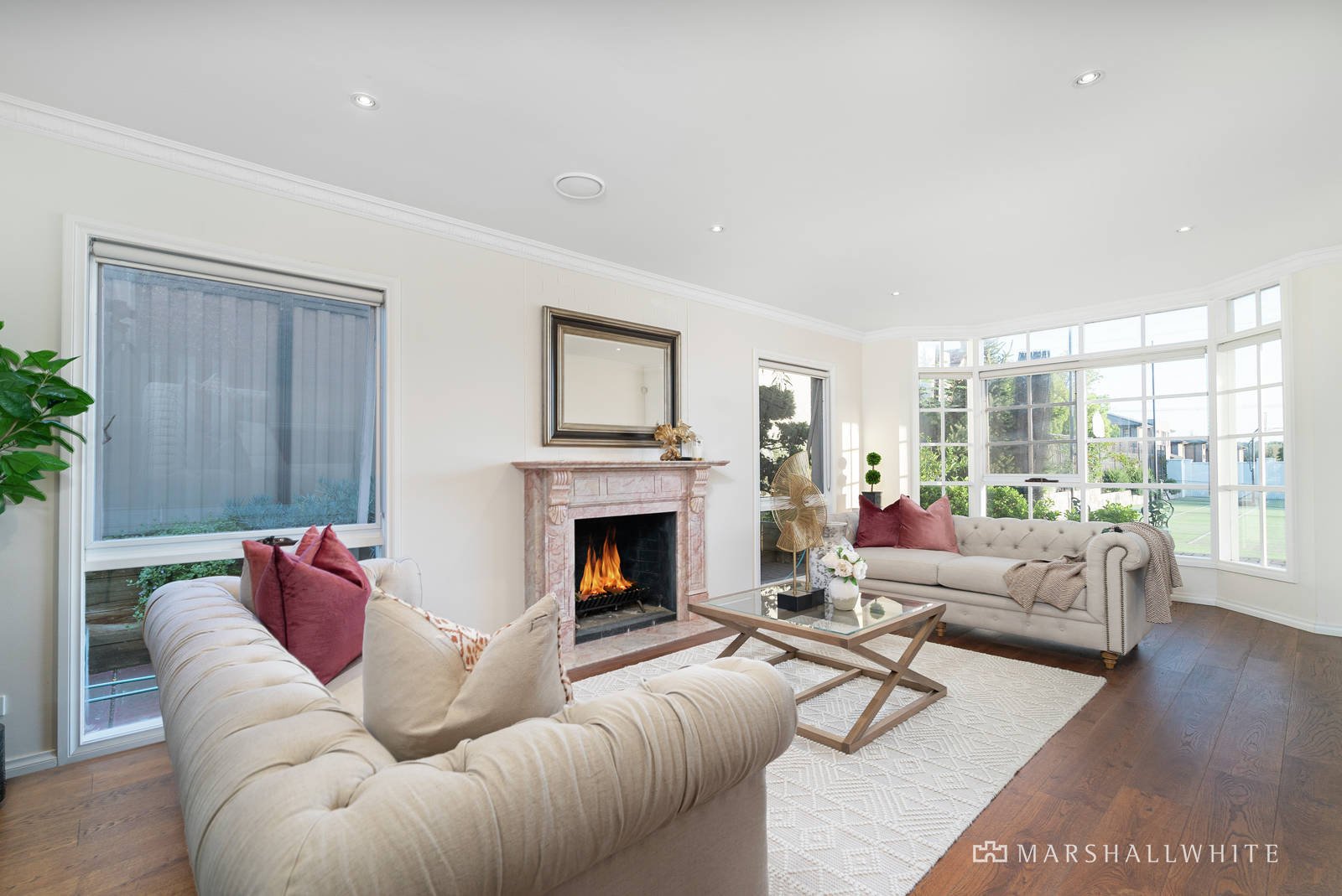 Filled with northerly light and crafted for entertainers, the open-plan kitchen / dining / living connects effortlessly to an indoor swimming pool with a spa. Appointed with stone benches and a SMEG oven, the kitchen is suited to gourmet cooking, whilst an easy connection to the lounge - with fireplace - and more formal dining ensures plenty of space for growing families and entertaining.