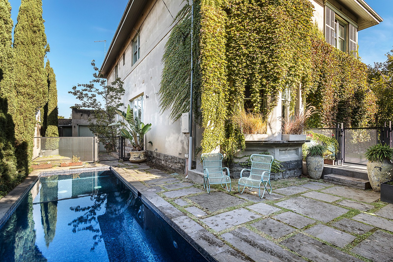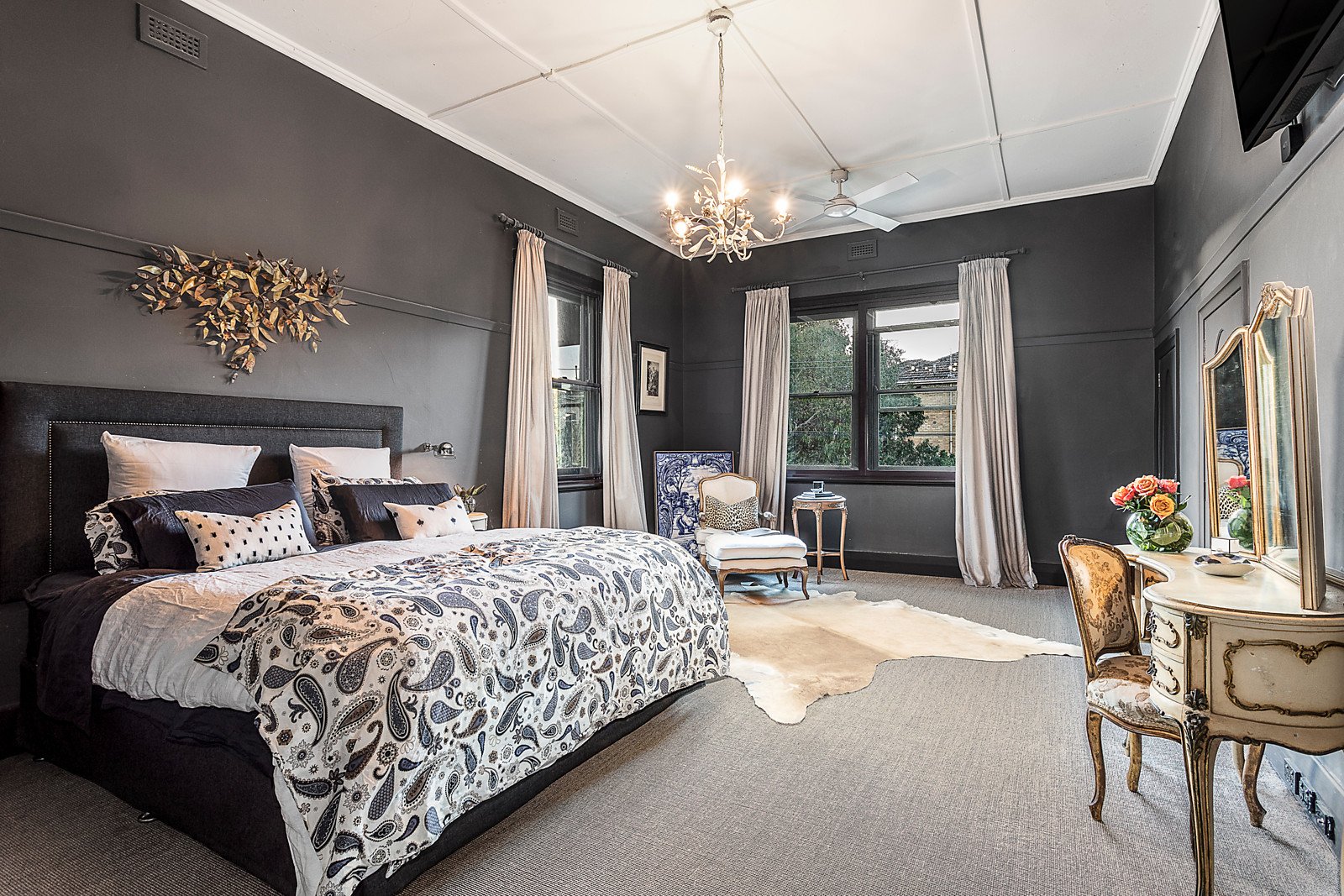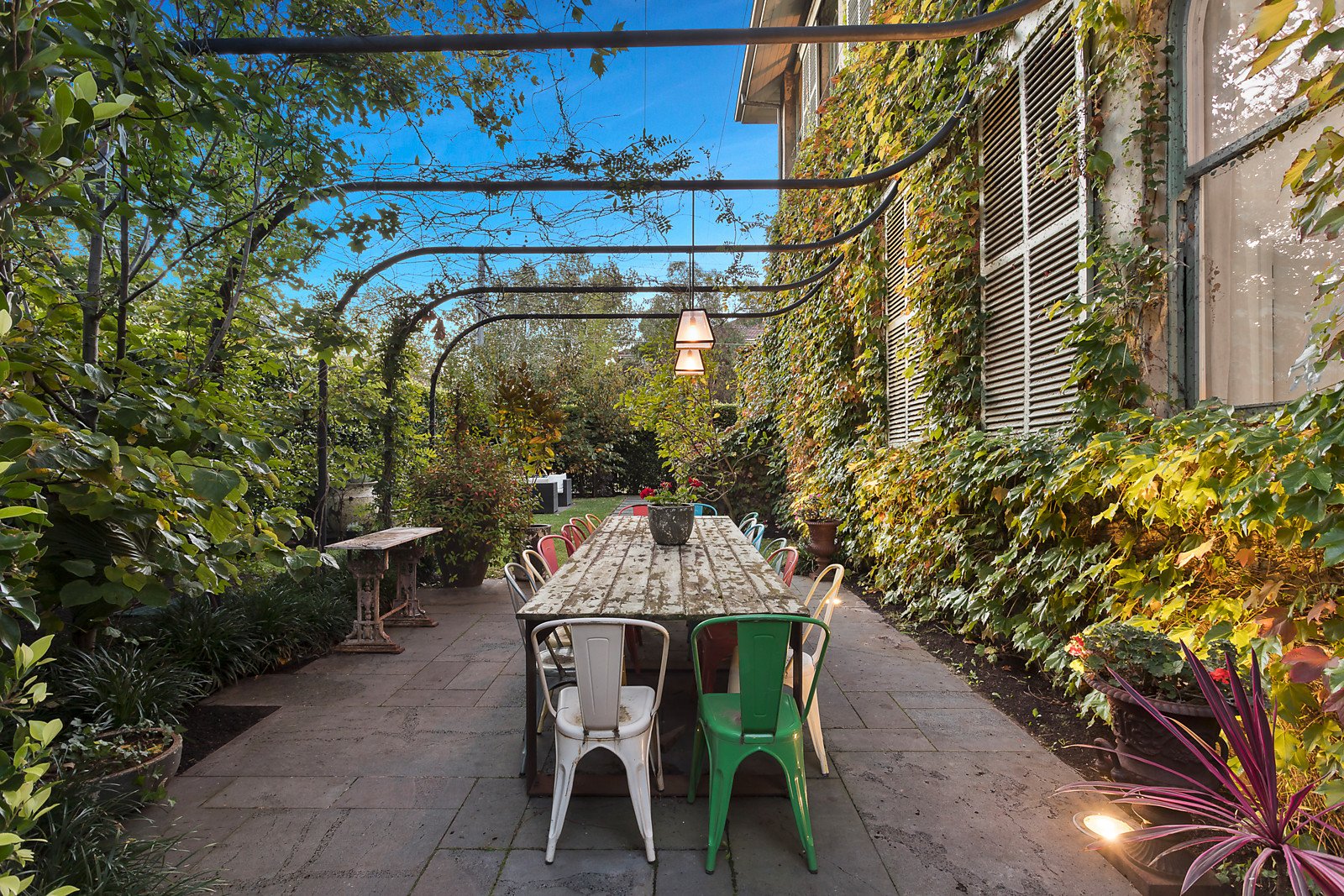 Designed as two self-contained levels joined by an external staircase, the expansive dimensions adapt fluidly to any number of family requirements. Featuring a striking refurbishment by renowned architect David Goss, the interior spaces open to picturesque private gardens on all four sides. Limed Baltic pine floors and ultra high ceilings flow through the imposing central hall, impressive billiards or sitting room with marble open fire and a refined study with open fire. The well appointed kitchen with casual dining area and a light-filled living room (marble open fire) open out to the private north-facing garden with a stunning mosaic tiled heated pool. Two spacious bedrooms are accompanied by a chic bathroom and large retreat or gym which leads out to lush private gardens with an expansive entertaining terrace beneath a steel pergola. Japan blacked timber floors and panelling add a contemporary edge to the ornate ceilings. The evocative entrance hall introduces a magnificent sitting room with gas fire and a sensational dining area also with a gas fire and an ultra stylish entertainer's kitchen appointed with concrete benches and European appliances. An opulent main bedroom with dual walk in robes and open fire and two additional bedrooms are complemented by a designer bathroom with separate powder-room.