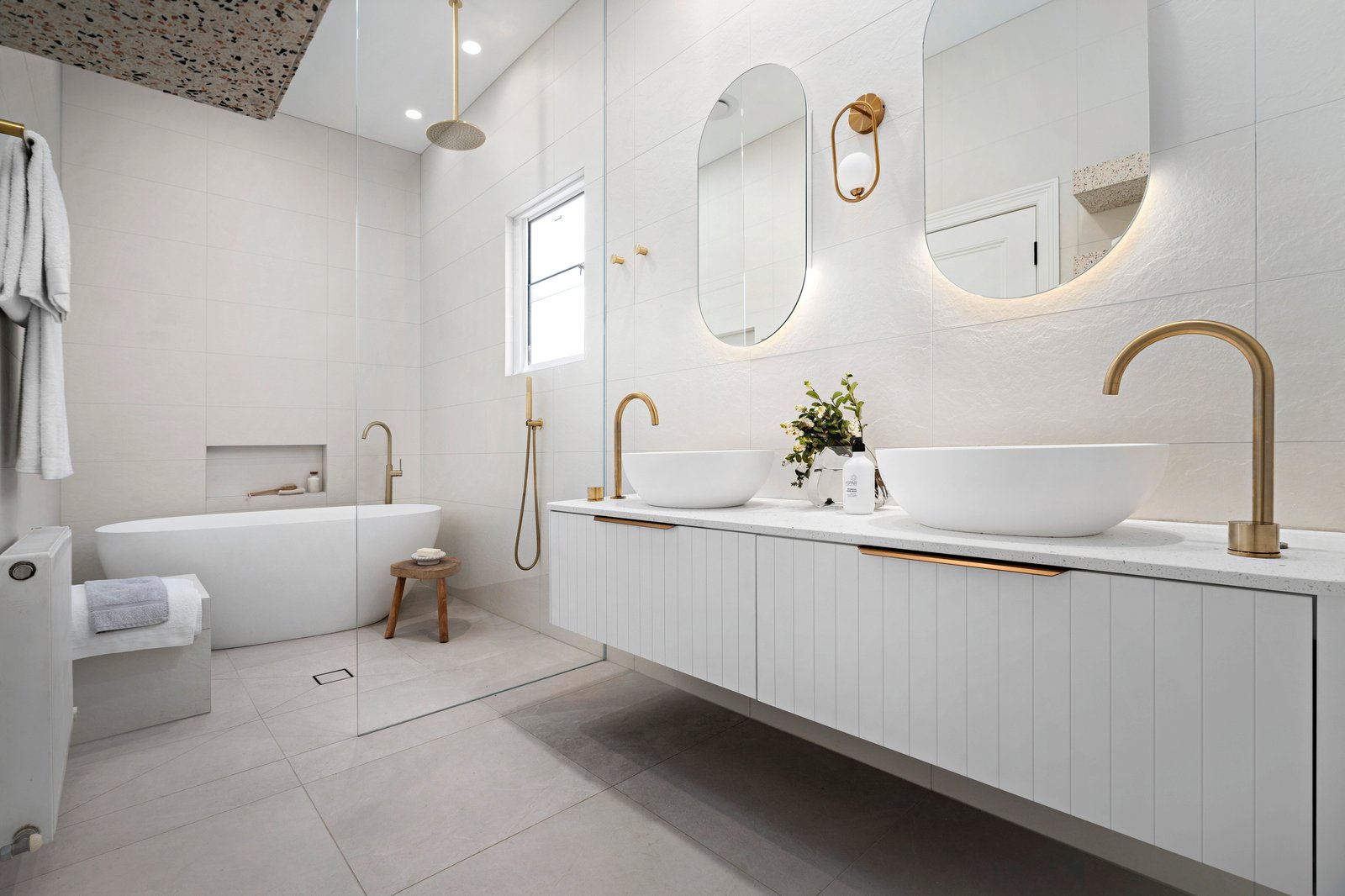 The expansive ground floor living spaces include a formal lounge and dining room which flows to the north-facing open-plan family zone with seamless connectivity to the alfresco entertaining area. Exemplifying the utmost in cutting-edge design, the show-stopping stone kitchen is fitted with top-of-range Gaggenau cooking appliances including an induction cooktop and double ovens, integrated dishwasher, and a Liebherr integrated fridge/freezer. A concealed butler’s pantry, and a servery bench and window to the alfresco area, add to the home’s fabulous functionality for entertaining. With a choice of uniquely beautiful bedrooms, luxe bathrooms, and study spaces, the home’s layout invites adaptable family living throughout the generations. Upstairs you’ll find a light-filled living area with a gas pebble fire heater and access to the wraparound undercover balcony with stunning Bay views, perfectly positioned for enjoying sunsets over the water. There is also a large home office (or additional bedroom) and the lavish main bedroom, with balcony access, a walk-in robe, and a breathtaking terrazzo wet-room ensuite.