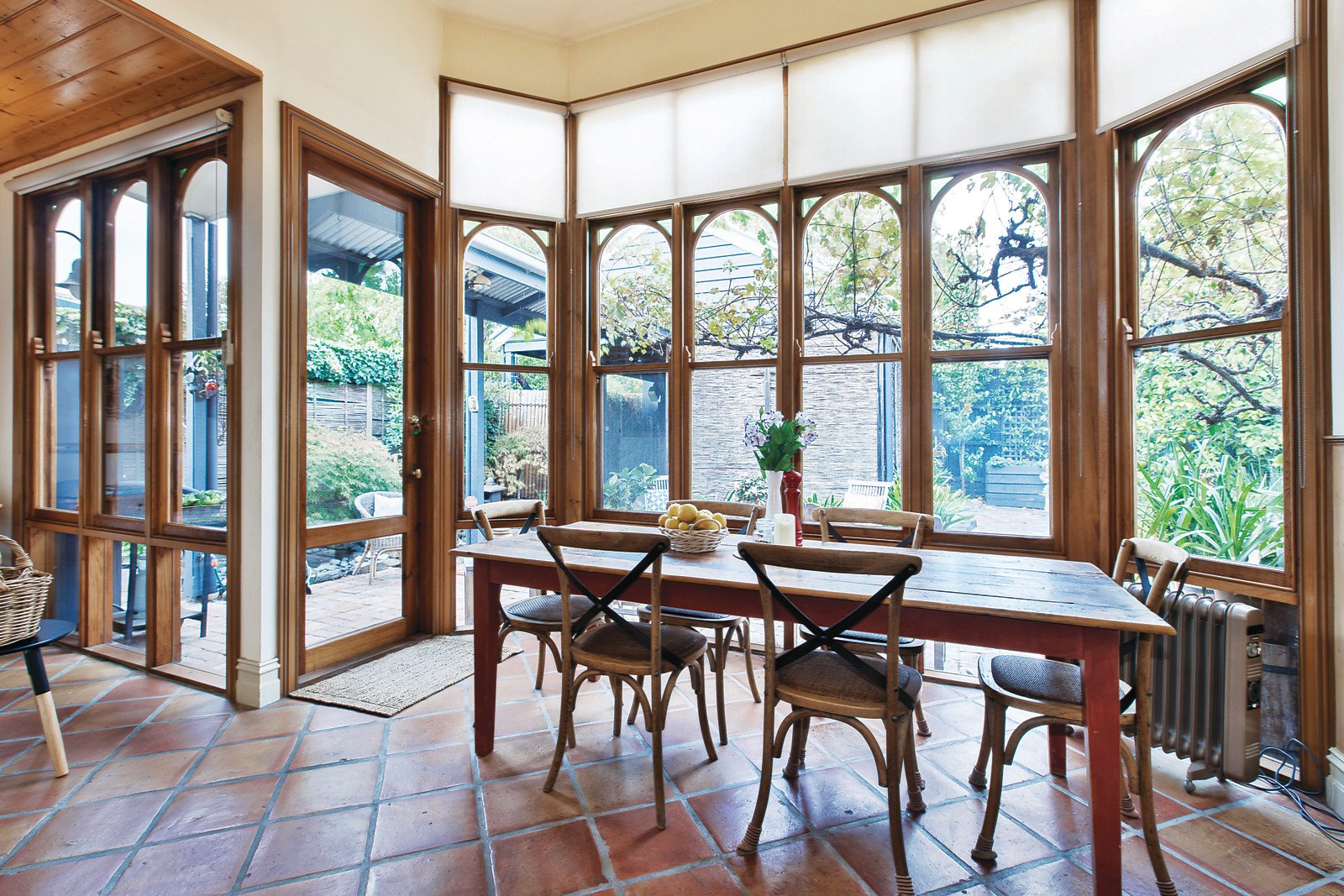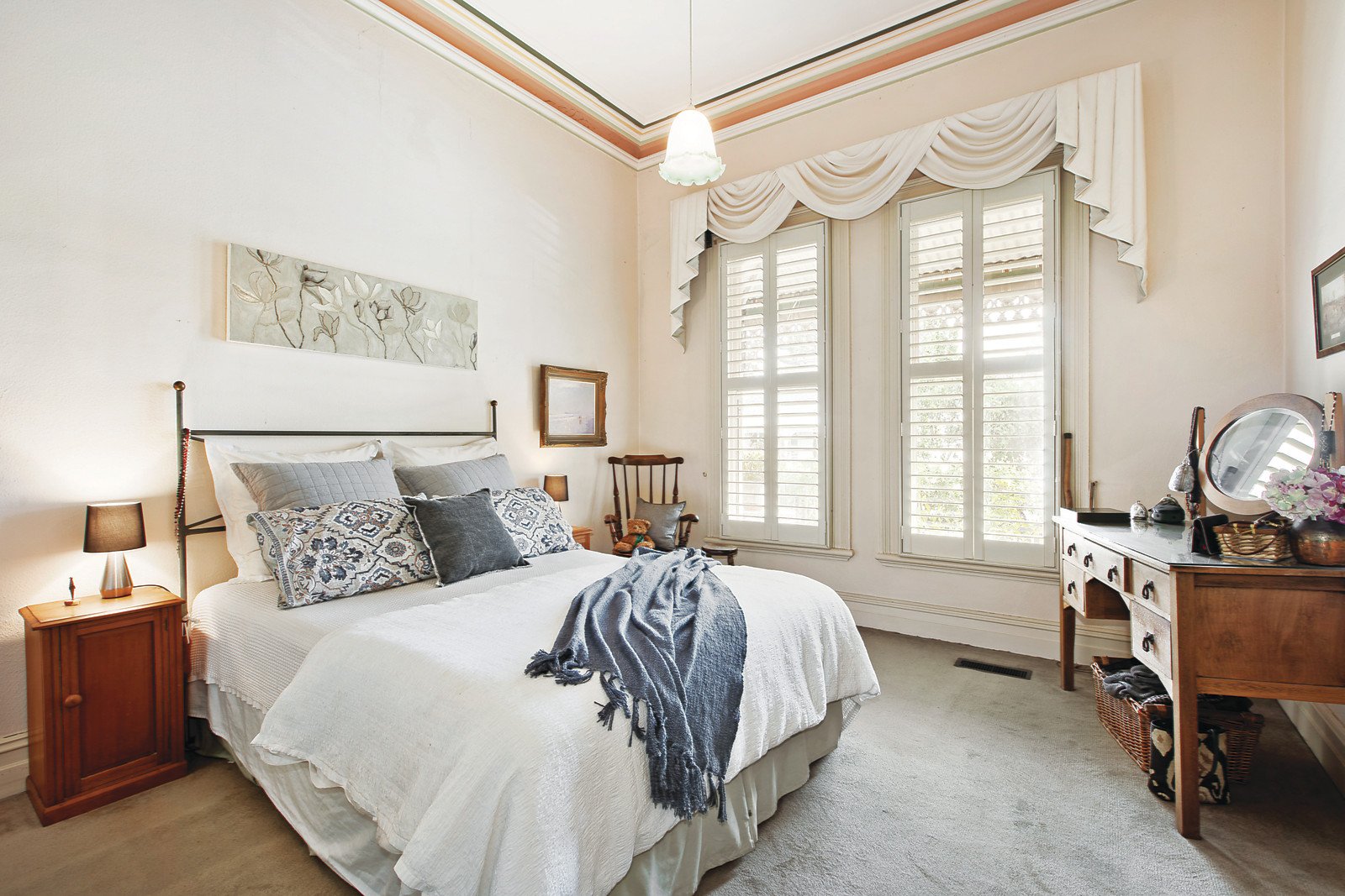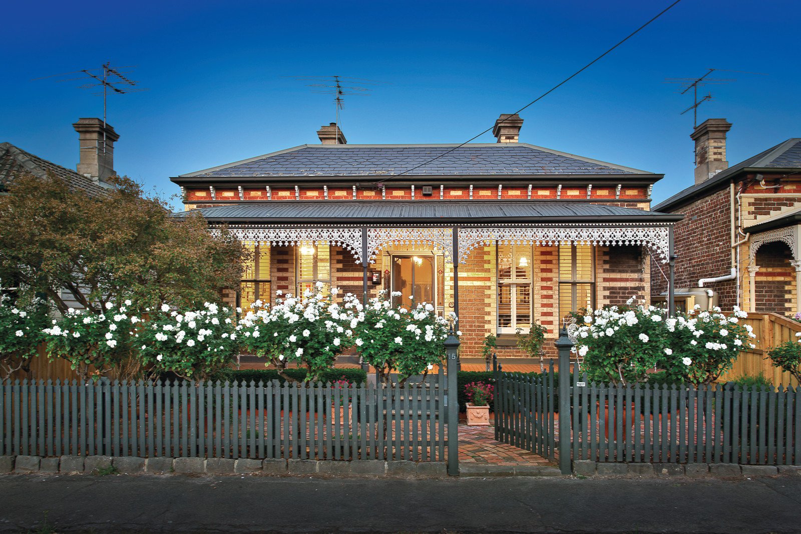 Classic Victorian elements including high ceilings define the arched central hall, gracious sitting room with a marble fireplace and glorious formal dining room also with an open fire. The two generous double bedrooms with built in robes and open fireplaces are complemented by a third bedroom or study, a bright bathroom and separate laundry with second toilet. Timber floors flow through the rustic well-appointed country-style kitchen and adjacent light-filled living and dining room opening to a private leafy northwest paved garden with shed and double carport accessed via rear lane.