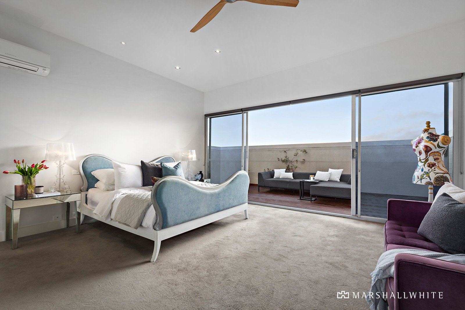 An expansive entrance hall beneath a 4.3m ceiling creates a dramatic first impression. The ground level with a spacious bedroom, extensive robes, stylish bathroom and huge mezzanine retreat or home office could easily adapt as self-contained accommodation or a commercial workspace if desired. On the level above surrounding a central light well, hardwood floors flow through an exceptionally spacious and sun-drenched open plan living and dining room with separate home office, a gourmet Smeg kitchen appointed with stone benches and a chic bathroom. The top level accommodates a second large bedroom with robes, the main bedroom with walk in robes and lavish en suite and a wide gallery opening to the expansive private west-facing decked terrace offering city views, a fabulous space for al fresco dining beneath outdoor heaters.