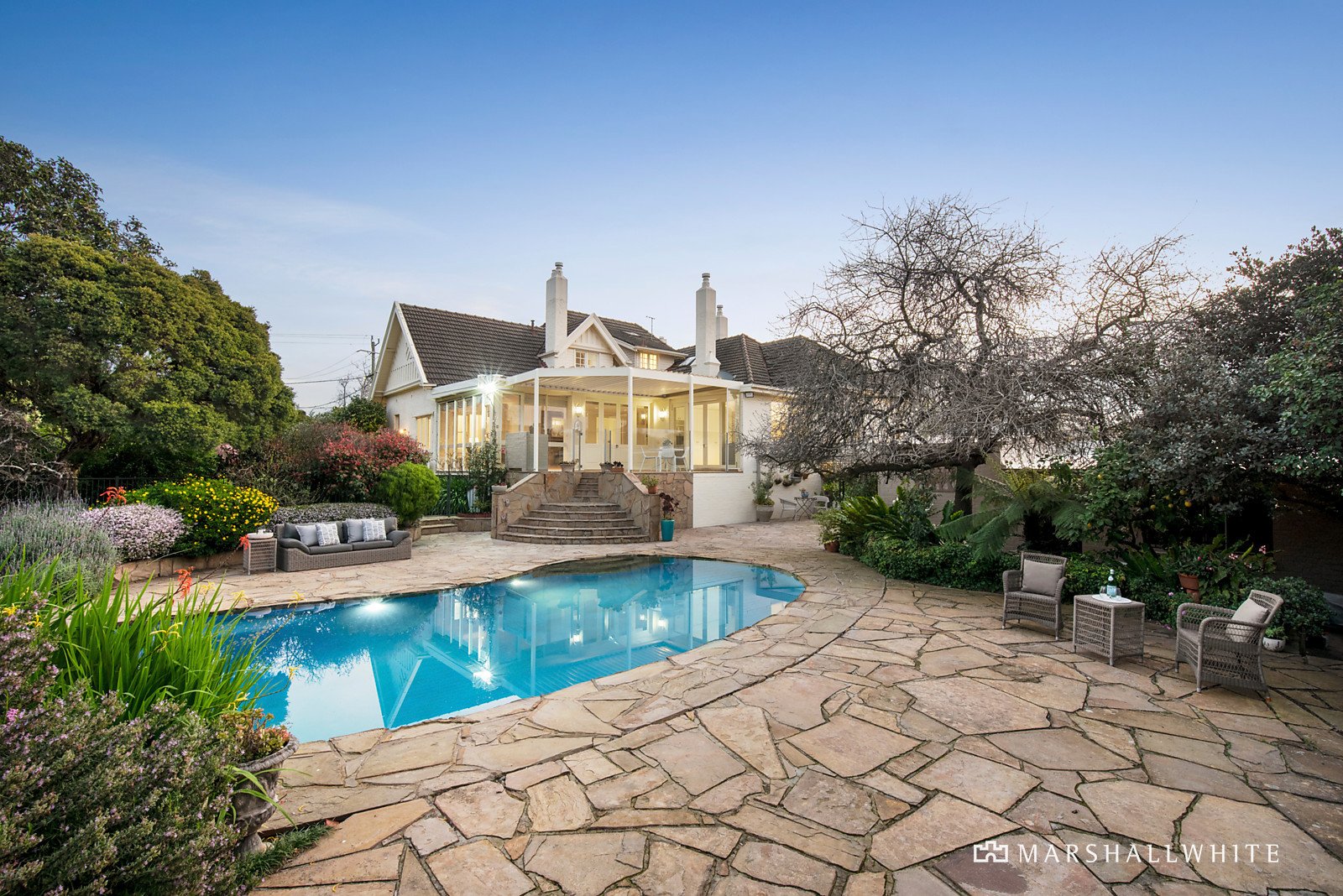 Behind a high walled garden and circular drive, the imposing reception hall with its distinctive 2-toned timber floors, leadlight windows and ornate ceiling introduces a gracious sitting room with gas fire and bay window, a superbly fitted bar and refined formal dining room with gas fire and the same 2-tone timber floor. Catering to the most demanding culinary requirements, the gourmet kitchen is appointed with a fabulous Aga oven, stone benches and Siemens appliances. The family dining room with a gas fire, a generous retreat and expansive light-filled living room open to a large louvre covered stone paved BBQ terrace overlooking the deep private north facing garden with a picturesque pool surrounded by vast stone terraces. There is also a versatile freestanding studio/gym with bathroom and kitchenette. Impressive family accommodation comprises the main bedroom with en suite and walk in robe, four additional bedrooms with built in robes, a spacious home office, fitted study and two stylish bathrooms.