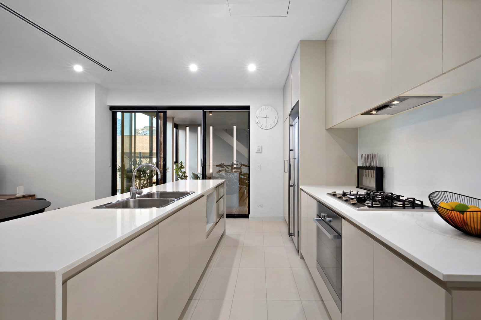 Expansive open-plan living and dining areas define the central level, enhanced by high ceilings and walls of glass that invite natural light from morning through evening. Extending to an enclosed outdoor living room and secondary north-facing balcony, it provides a relaxed backdrop for year-round entertaining, complemented by a gourmet stone-finished kitchen, appointed with premium Smeg and Ilve appliances.