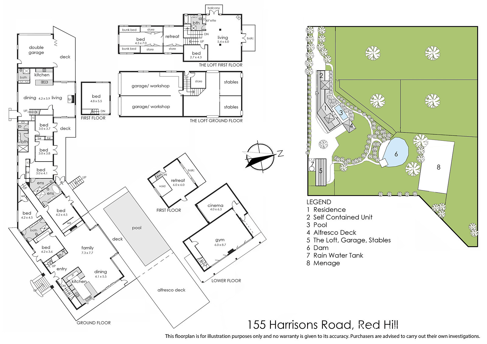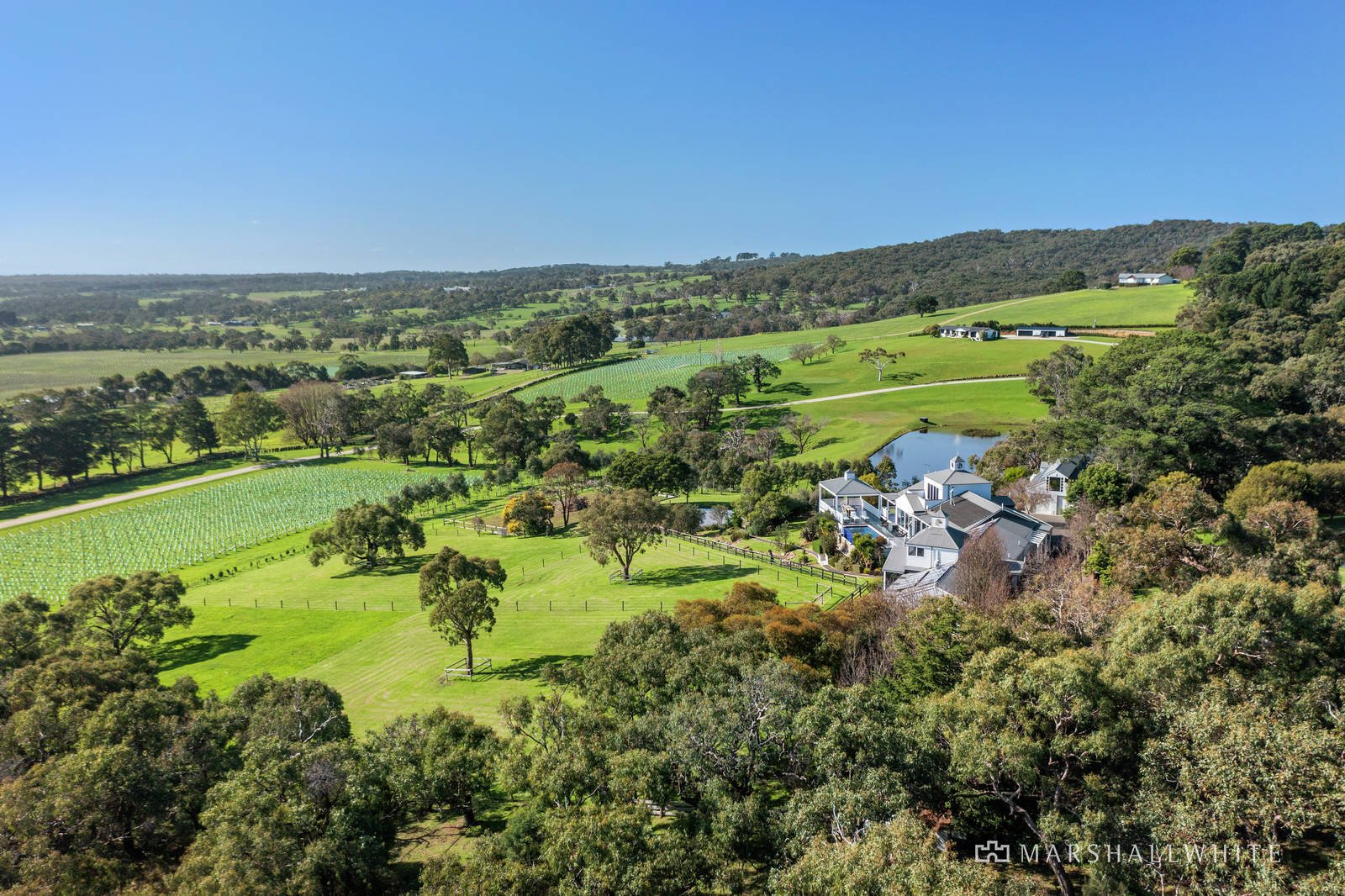 The primary residence is an impressive 6-bedroom, 5.5-bathroom sanctuary with an infinity pool and cantilevered entertainment deck over the dam and surrounding paddocks, served by a spectacular fireside marble kitchen with a host of integrated appliances, a 120mm range oven, and a champagne refrigerator. A loft-style 1-bedroom retreat under the same roofline is contrasted by a freestanding two-bedroom abode further along the asphalt driveway, featuring a four-car garage, borrowed balcony views over a Bald Hill Creek dam, and equestrian stables that serve the three beautifully manicured paddocks and an Olympic-sized menage.