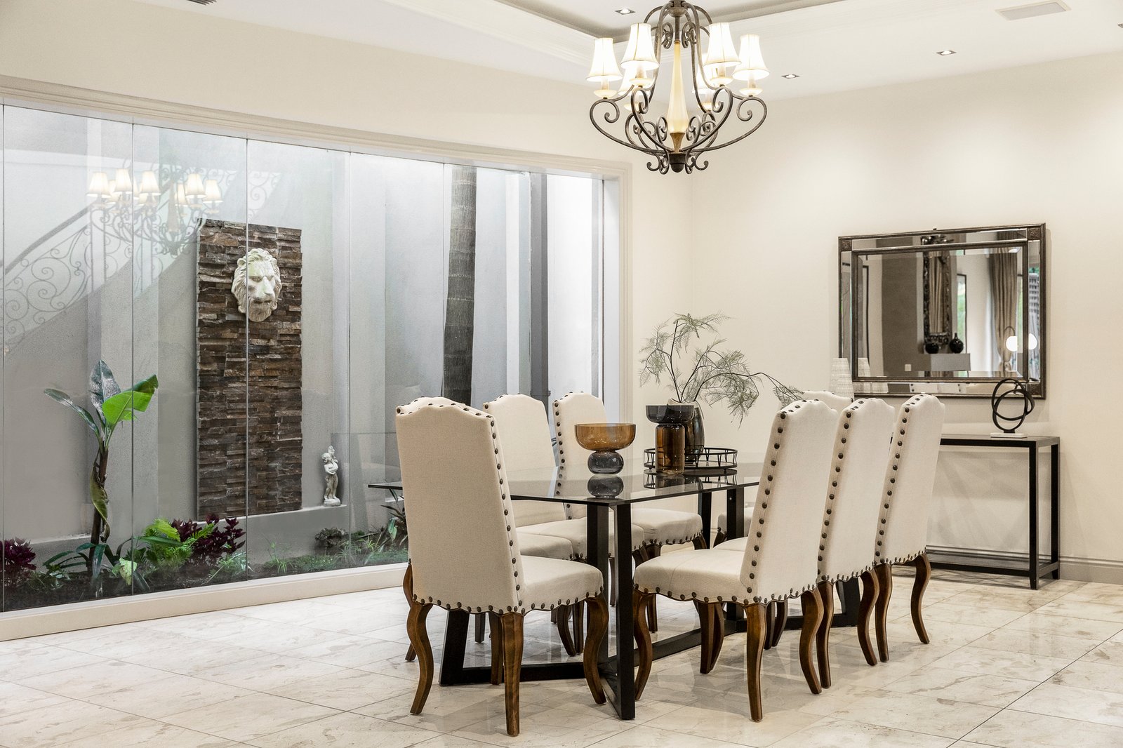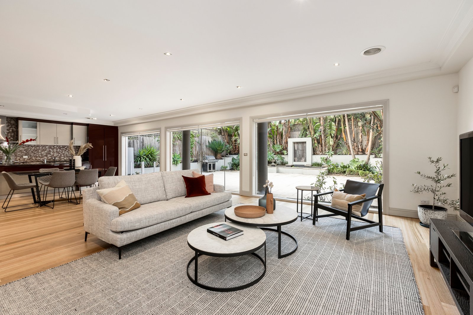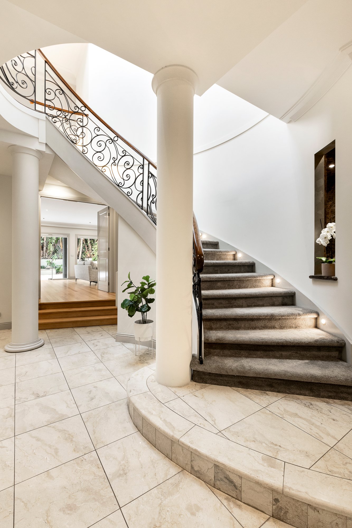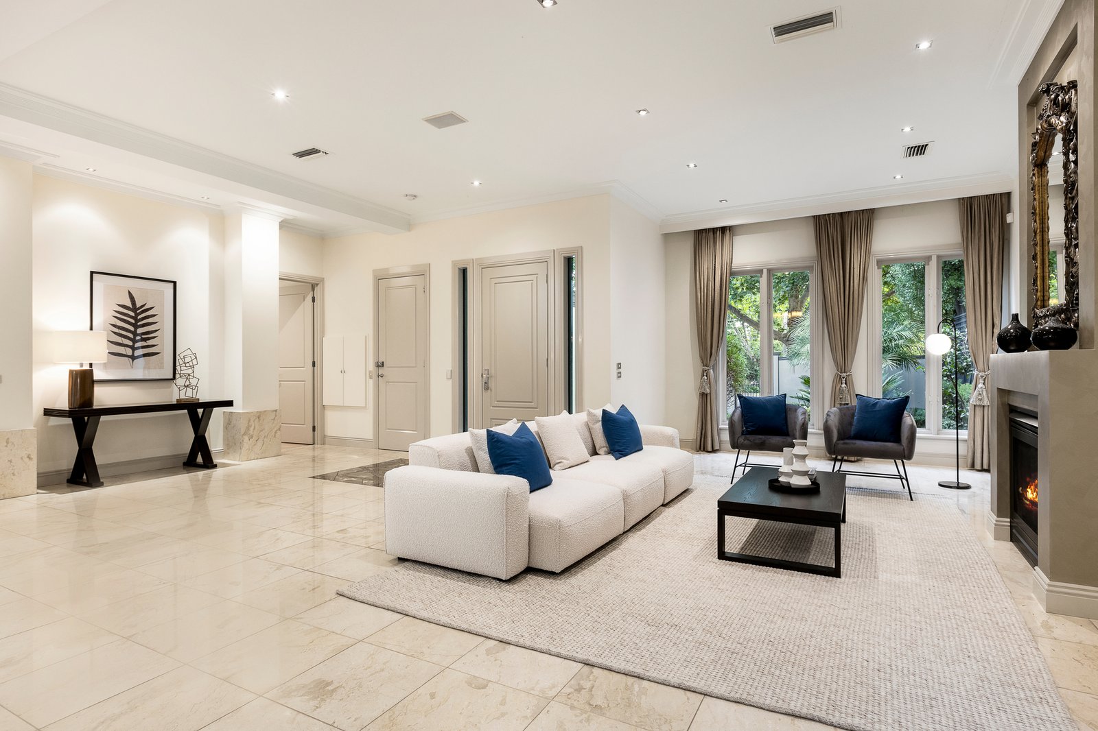 The interior features elegant design, luxurious appointments, high ceilings and flowing living spaces, designed to maximize natural light. The Italian marble entrance leads to an expansive formal sitting room with gas fireplace and dining room overlooking the garden light well. The ground floor also features a bedroom with a dual-access bathroom, home cinema, kitchen and living room. The expansive living space continues in a full-width family domain, including a sleek, superbly appointed kitchen with Italian marble benchtops, premium Electrolux stainless steel appliances with Tasmanian oak floors. Opening to a tropical oasis with paved outdoor living and entertaining area, it is perfect for indoor/outdoor alfresco dining with family and friends.
