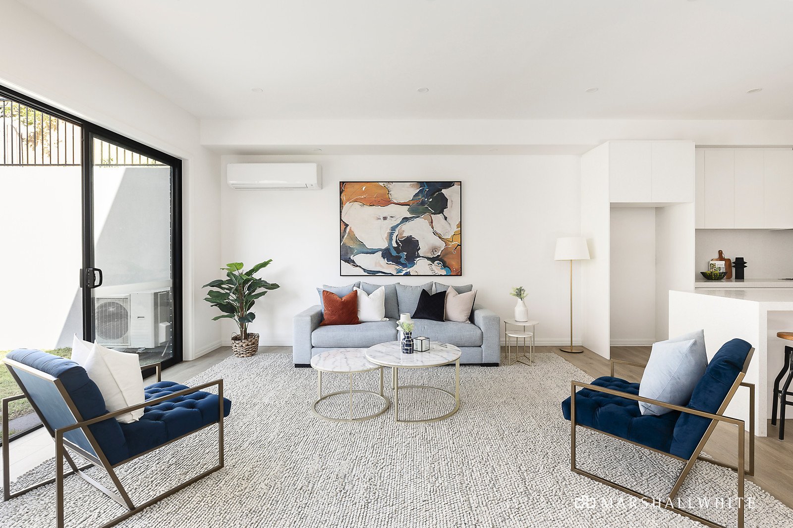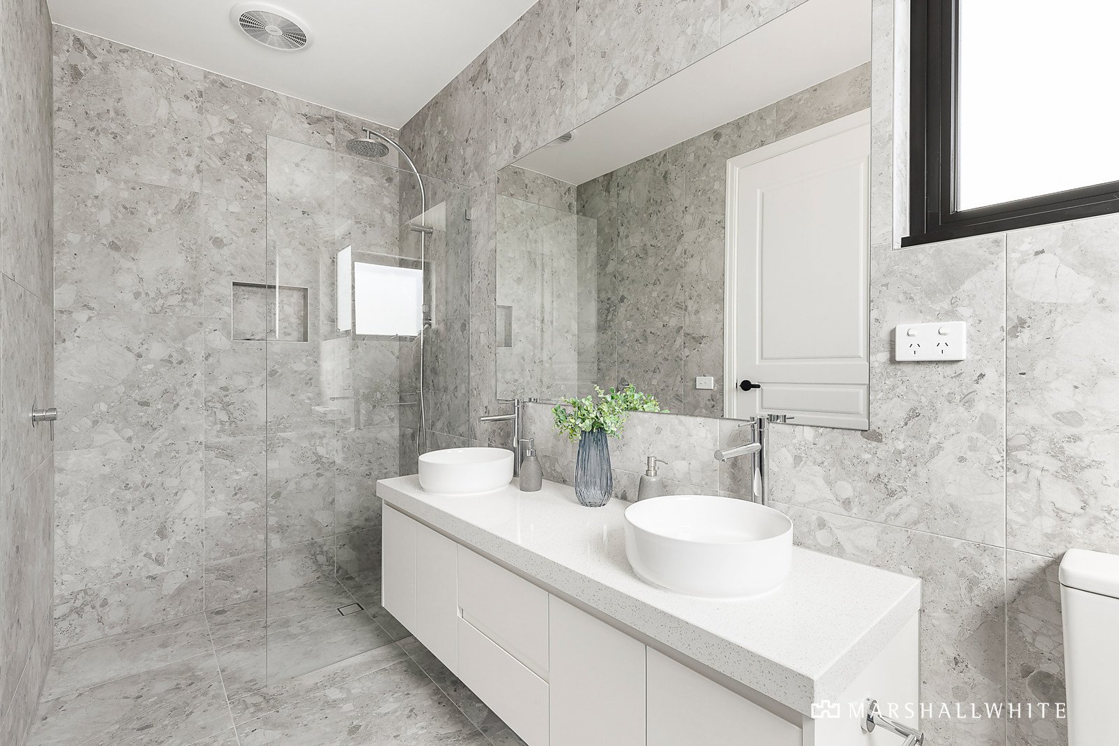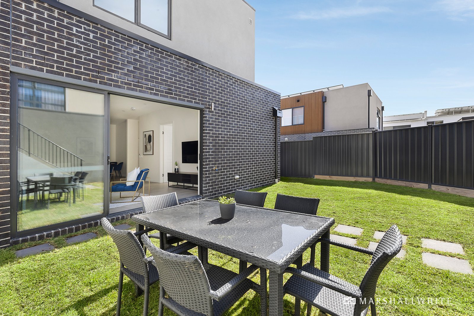 The kitchen and three bathrooms exemplify the home's commitment to quality. The well-appointed kitchen features ample storage, elegant stone countertops, dual sinks and Miele appliances. Bathrooms exude a hotel-like ambiance with floor-to-ceiling stone-look tiling, rain showers and stylish basin sinks. A well-sized courtyard offers an inviting space for outdoor dining and recreation, while a second elevated garden presents the perfect opportunity for cultivating a vegetable patch.