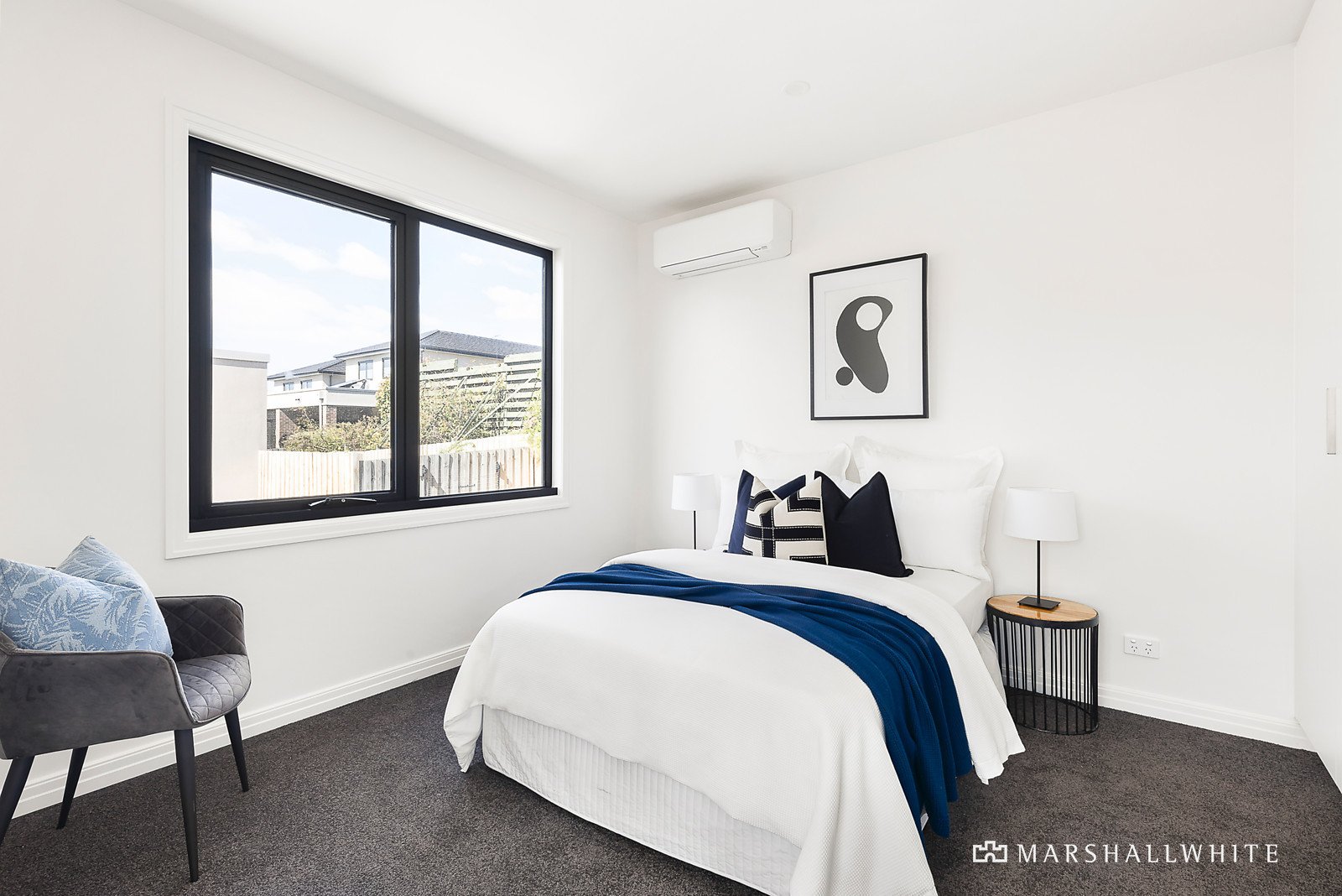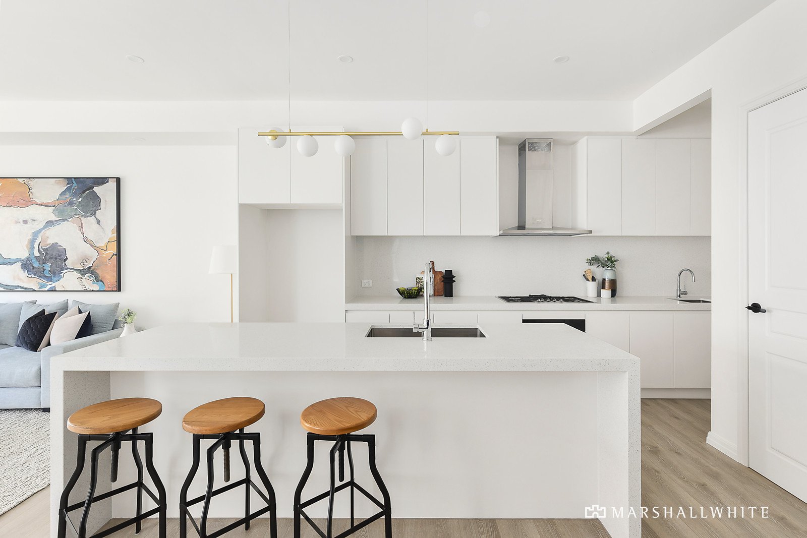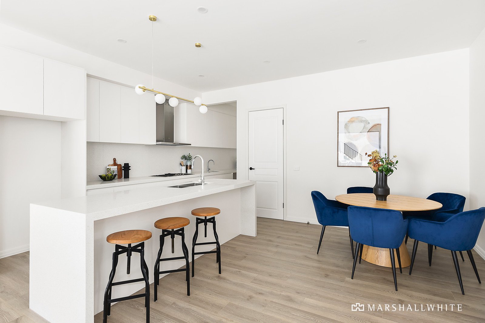 The kitchen and three bathrooms exemplify the home's commitment to quality. The well-appointed kitchen features ample storage, elegant stone countertops, dual sinks and Miele appliances. Bathrooms exude a hotel-like ambiance with floor-to-ceiling stone-look tiling, rain showers and stylish basin sinks. A well-sized courtyard offers an inviting space for outdoor dining and recreation, while a second elevated garden presents the perfect opportunity for cultivating a vegetable patch.