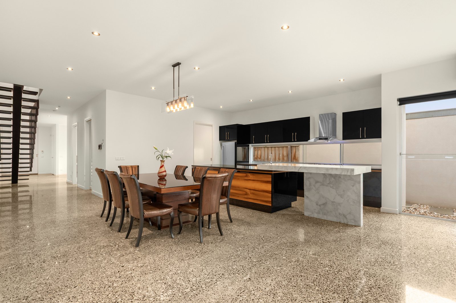 An over-sized pivot hinged front door with video intercom entry introduces the signature Schulberg Demkiw architectural features incorporating soaring three-metre-high ceilings, full-height glazing, polished-concrete terrazzo flooring, and a sculptural floating fishbone stairway. The layout is designed for zoned family functionality with two separate living areas on the lower level, along with a fitted study, as well as an upper level retreat/kids’ play area.