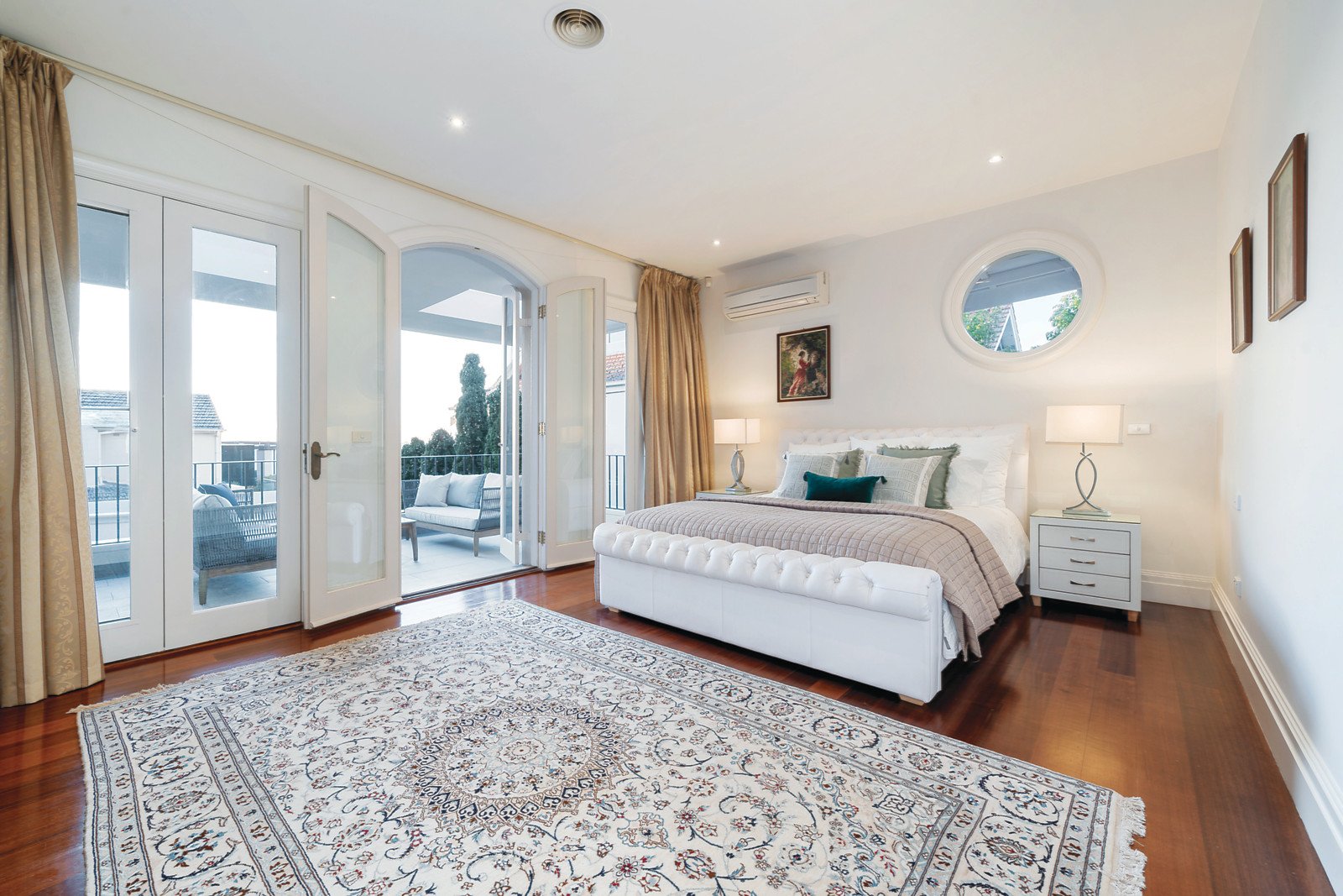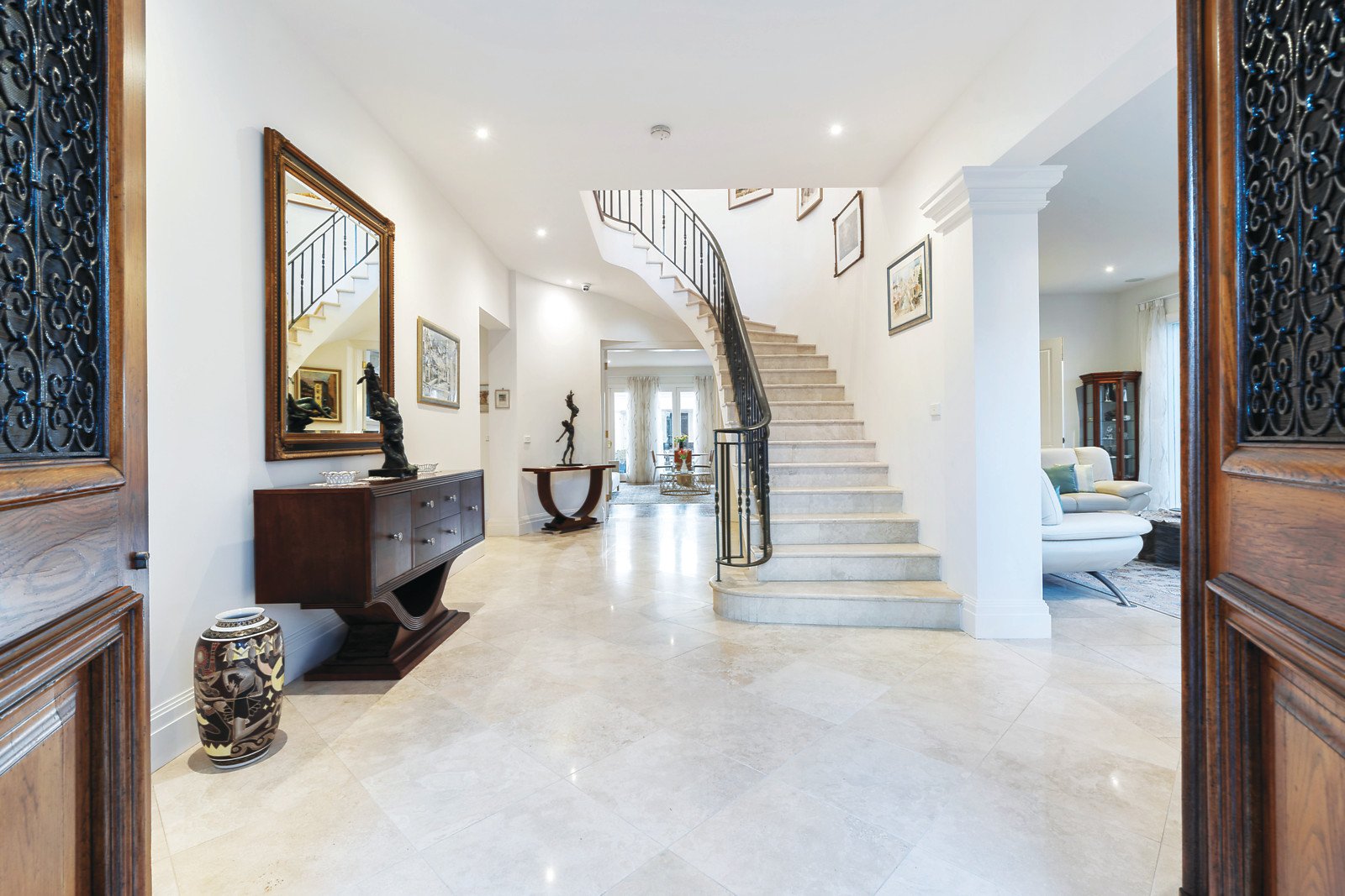 A grand marble staircase leads to the magnificent main bedroom boasting walk in robe, dressing room, balcony with delightful bay vistas and luxurious marble ensuite. Additionally, the first floor comprises three further bedrooms with built in robes, central marble bathroom and study with balcony providing leafy outlooks.