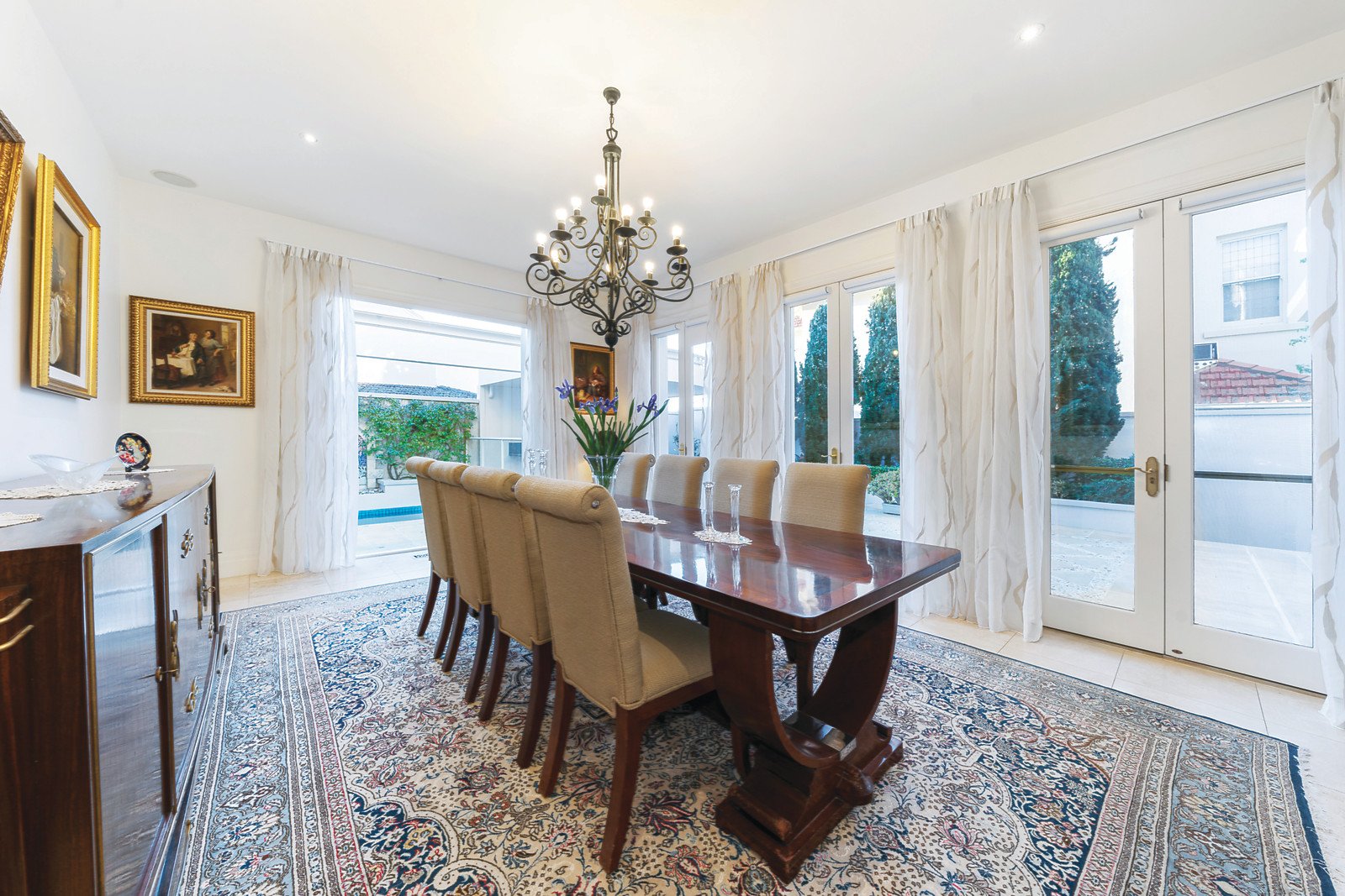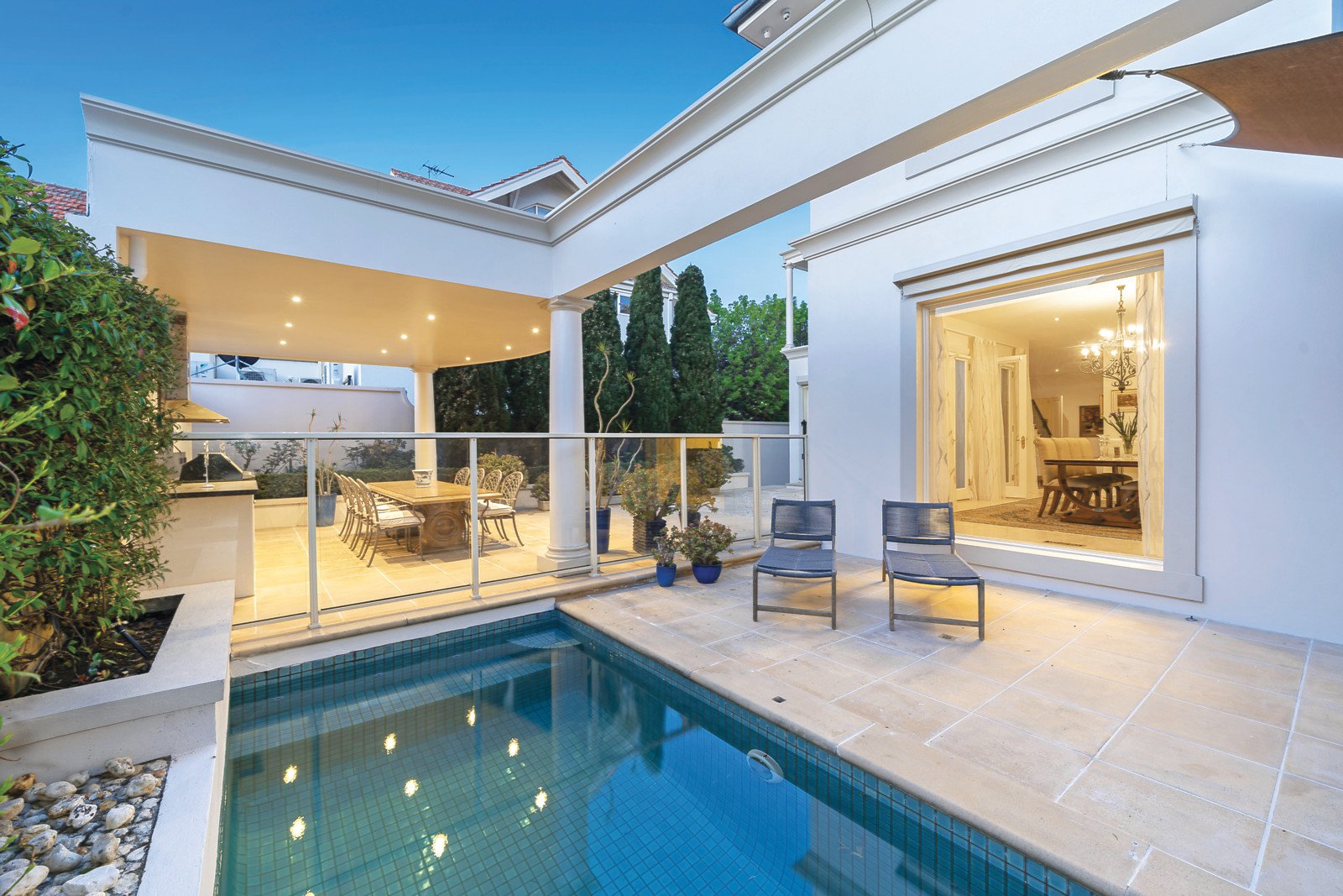 Setting the scene for lavish entertaining, formal sitting and dining rooms are complemented by a fully equipped bar and expansive open plan living space all opening out to the lush private courtyard garden, sparkling solar heated pool and alfresco dining space fitted with built in barbeque and outdoor kitchen facilities. A gourmet kitchen showcases a suite of high end appliances, breakfast bar and ample storage set against granite benchtops.