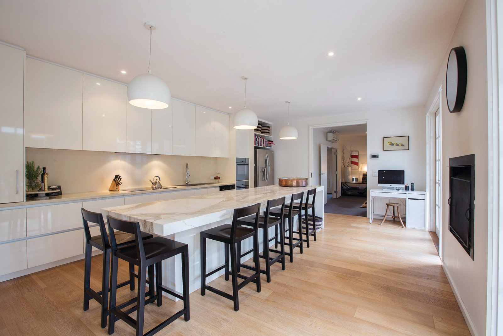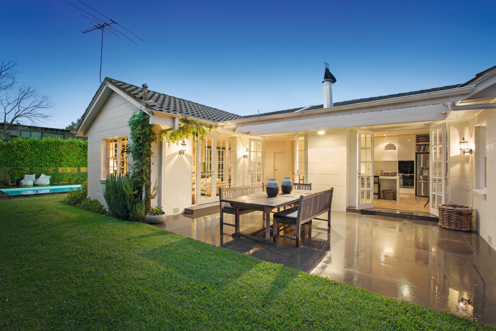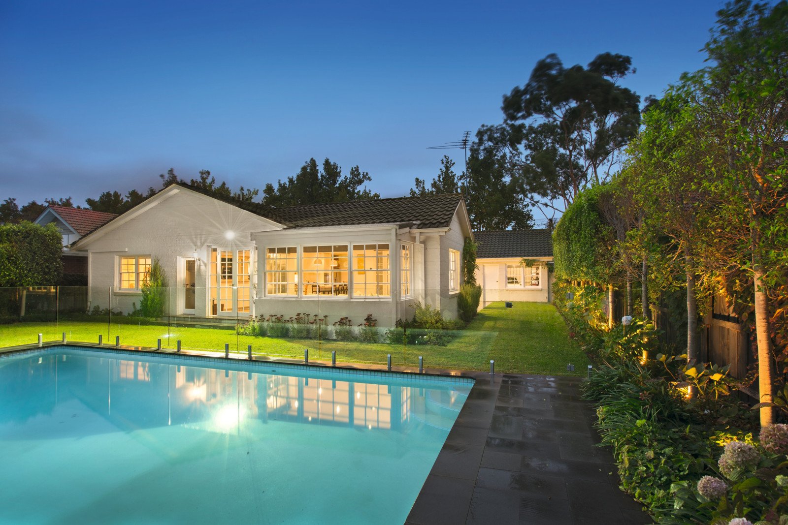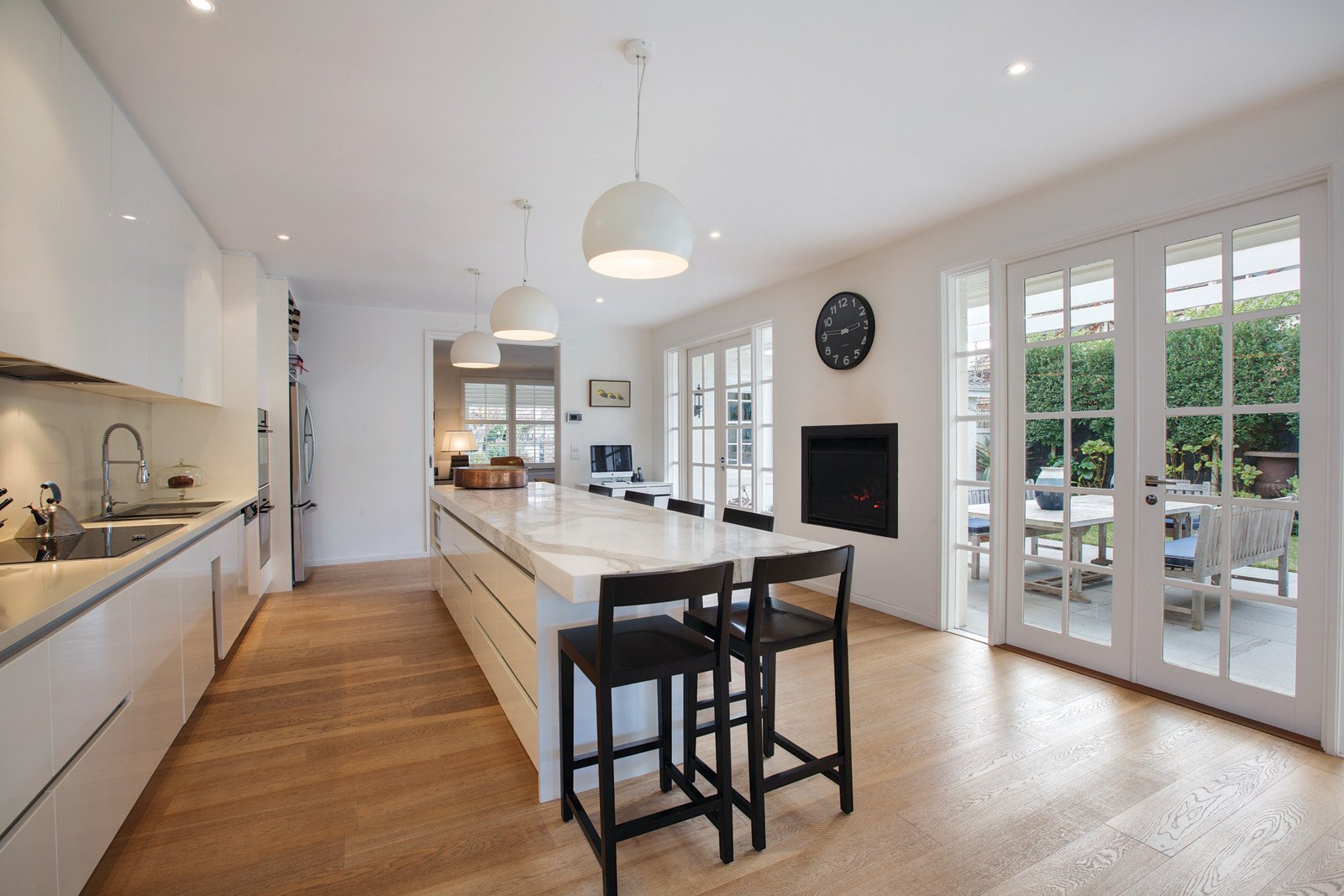 Brilliantly refurbished throughout with inspired designer flair, a timeless contemporary elegance is immediately evident through the wide entrance hall, glorious sitting room, beautiful main bedroom with stylish marble en-suite and walk in robe, two fitted bedrooms (BIRs/desks) and a lavish marble bathroom. Superbly oriented to the north and featuring European oak floors, the sublime gourmet kitchen boasting a long Calacatta marble island bench, induction cook-top, dual ovens incl. steam oven and open fireplace and the generously proportioned living and dining spaces open to an expansive north-facing terrace and deep landscaped northeast garden with picturesque solar heated pool.