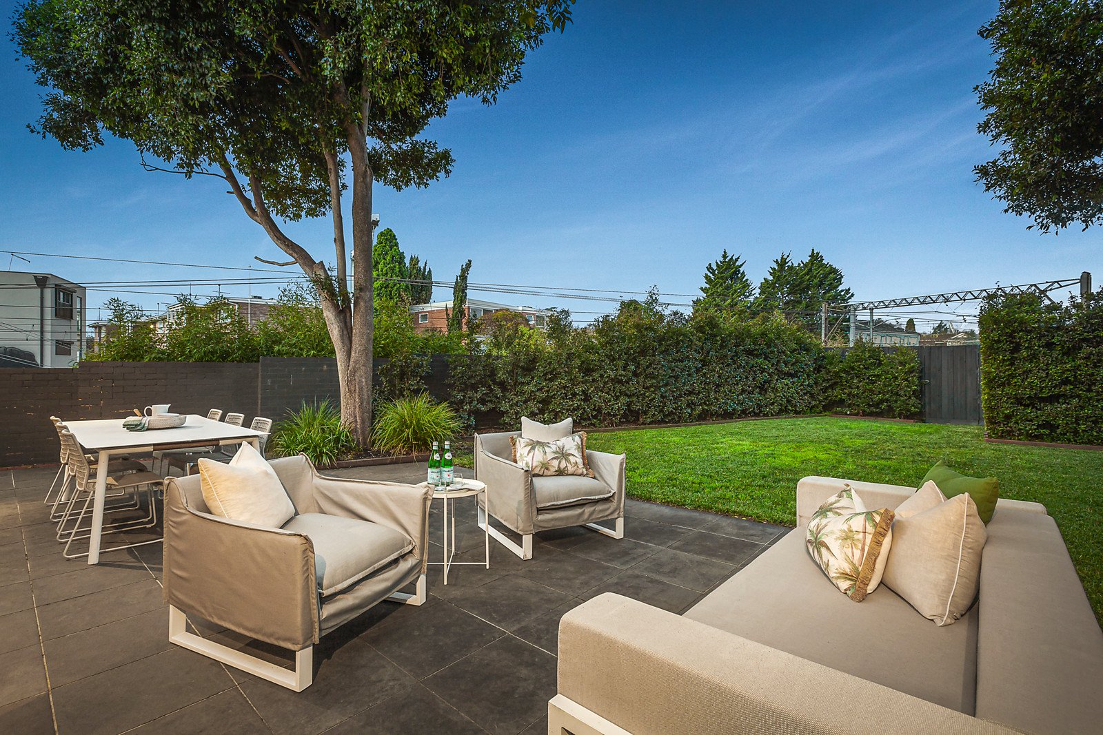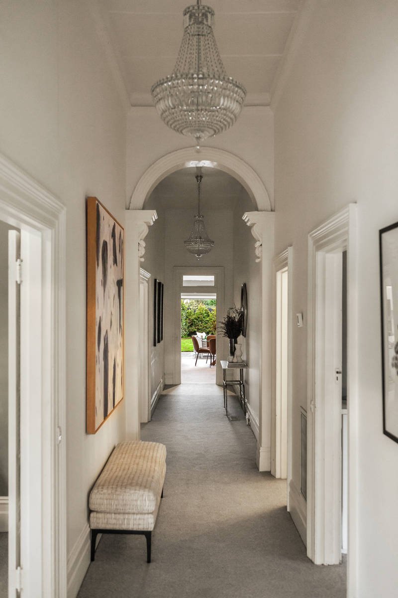 Set behind a broad street frontage, a magnificent arched entrance hall featuring ultra-high ceilings flows through to three beautifully proportioned bedrooms with built in robes, a home office or 4th bedroom, a study nook and a bright bathroom. Northern light streams through the expansive sitting room with a gas fire, a separate large well-appointed kitchen and the generous living/dining room. French and sliding doors open to the deep private northeast garden with extensive bluestone paving all shaded by majestic mature trees.