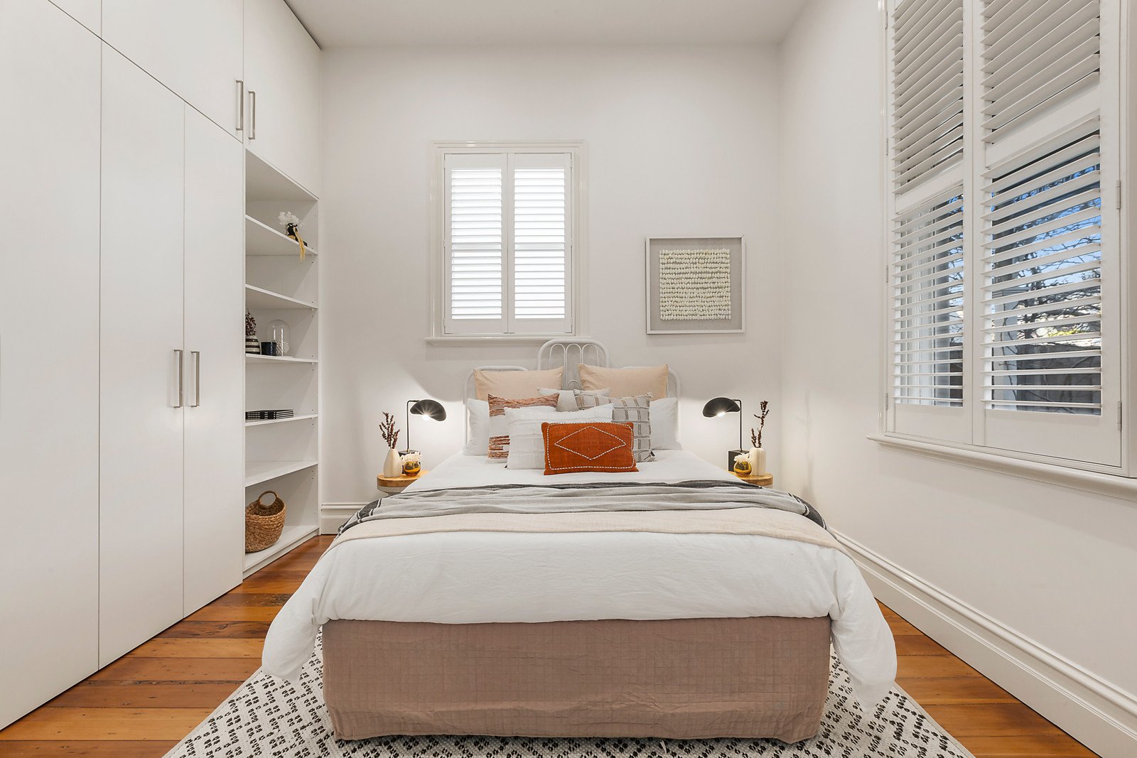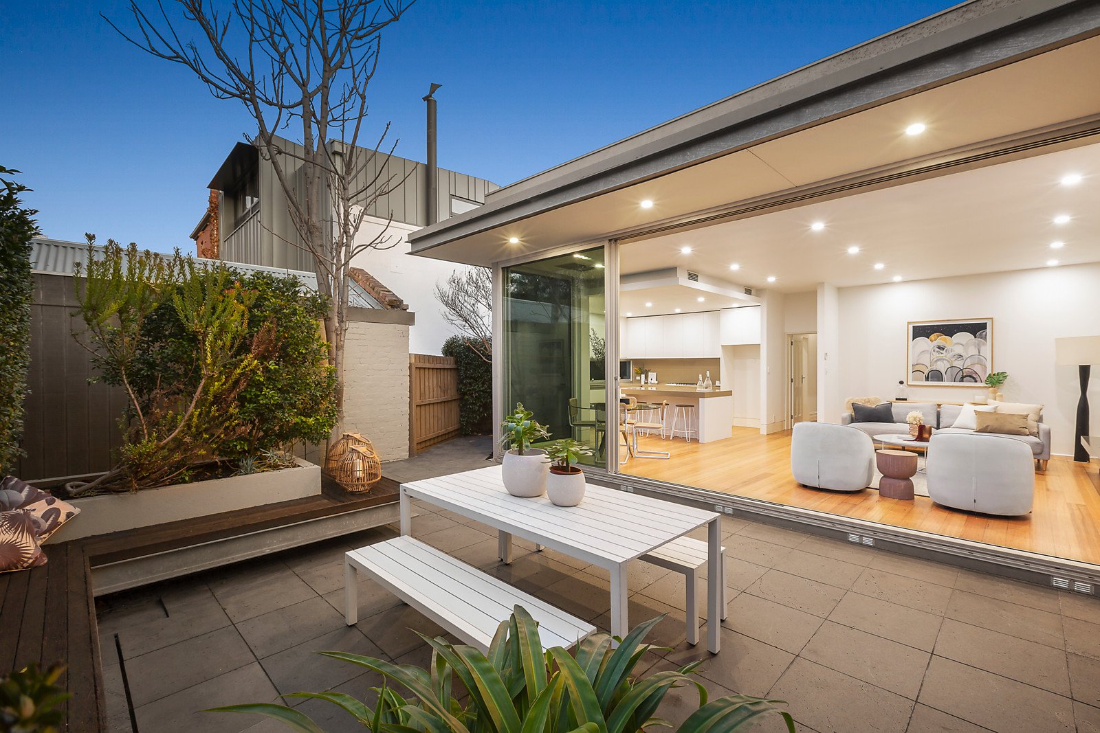 As picturesque from the street as it is captivating inside, the attractive exterior with bluestone verandah introduces a central arched hall featuring high ceilings and timber floors. Northern light streams through the rear open plan living and dining room with a roaring open fire and sleek gourmet kitchen well appointed with Miele appliances and stone benches. Extending the entire width of the room, glass sliders retract fully to connect the living spaces with the gorgeous north-facing private garden with extensive bluestone paving surrounded by leafy garden beds, built in seating and a BBQ. It's an inviting retreat for al fresco dining and relaxing. Boasting plantation shutters and floor to ceiling robes, the three beautiful bedrooms include the main with en suite and a stylish central bathroom.