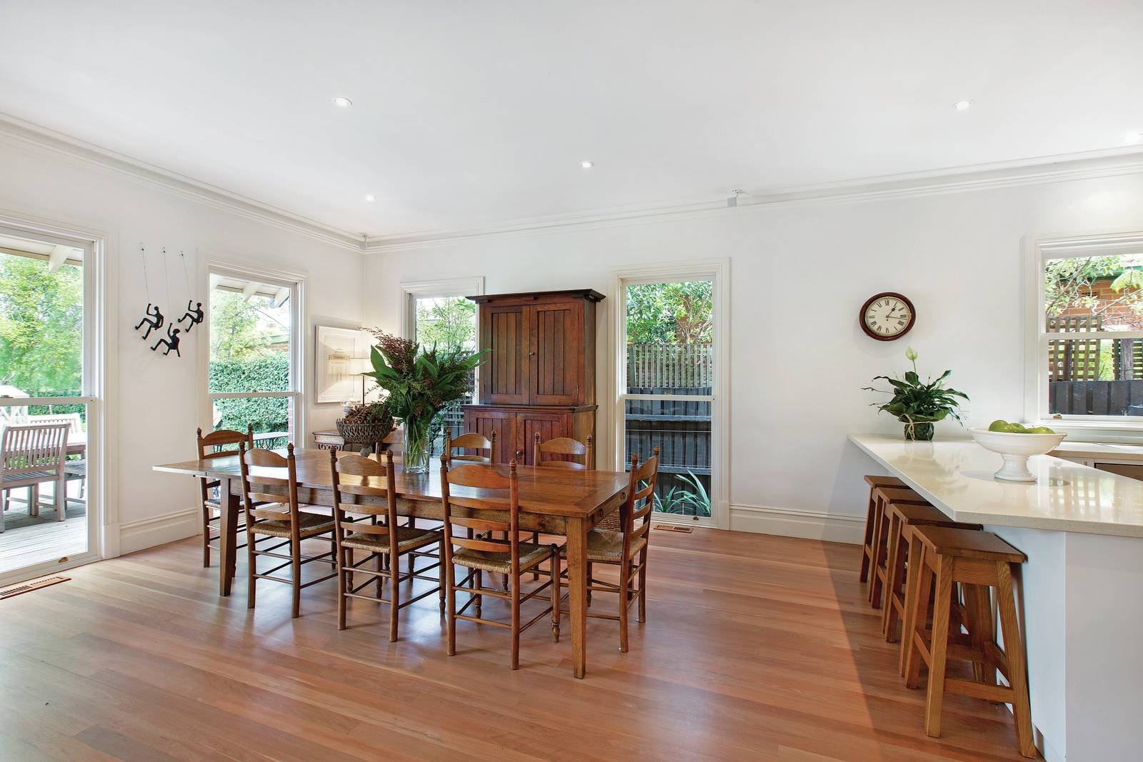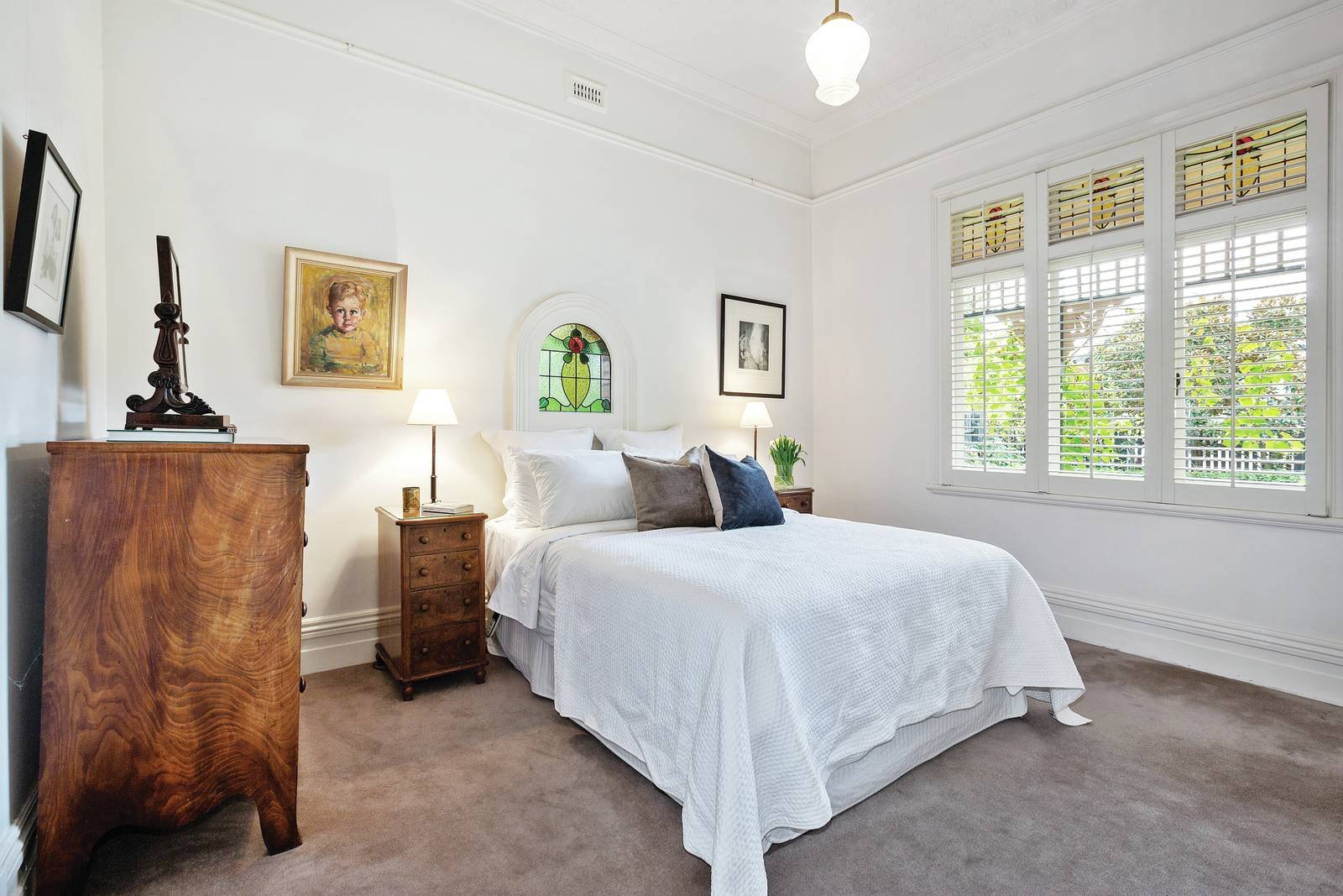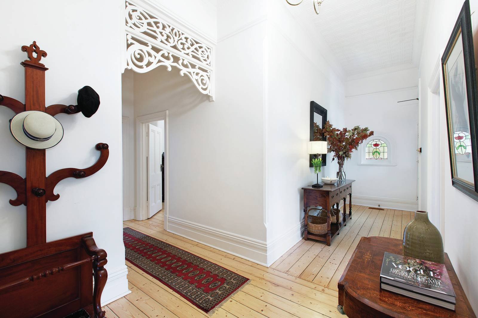 Set behind a row of lush Magnolias, the tessellated verandah introduces an interior replete with pressed metal ceilings, Baltic pine floors and leadlight windows. The L-shaped hall featuring decorative fretwork leads to a beautiful sitting room with marble fireplace, an elegant formal dining room or 4th bedroom with open fireplace and a study with fireplace and built in robe. Brush Box floors flow through the impressively proportioned living and dining room with a gas fireplace and sublime gourmet kitchen boasting stone benches and Smeg and Miele appliances. French doors open out to a deep private leafy garden with a large entertaining deck and carport accessed via rear lane. The gorgeous main bedroom with open fire and built in robes and a Limestone bathroom are downstairs while a fabulous children's zone upstairs comprises two additional double bedrooms with built in robes and desks, a stylish bathroom and spacious retreat.