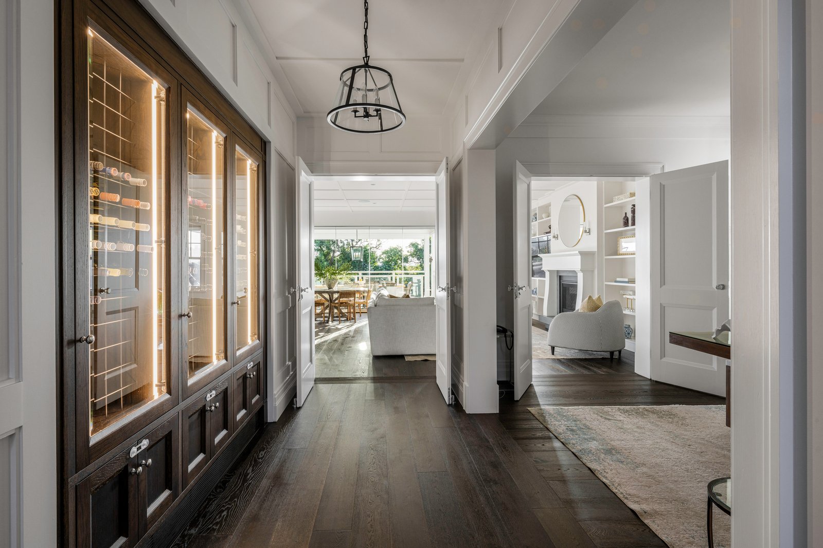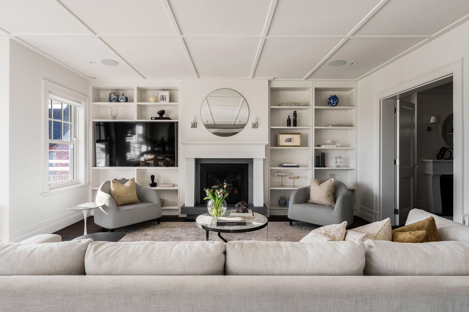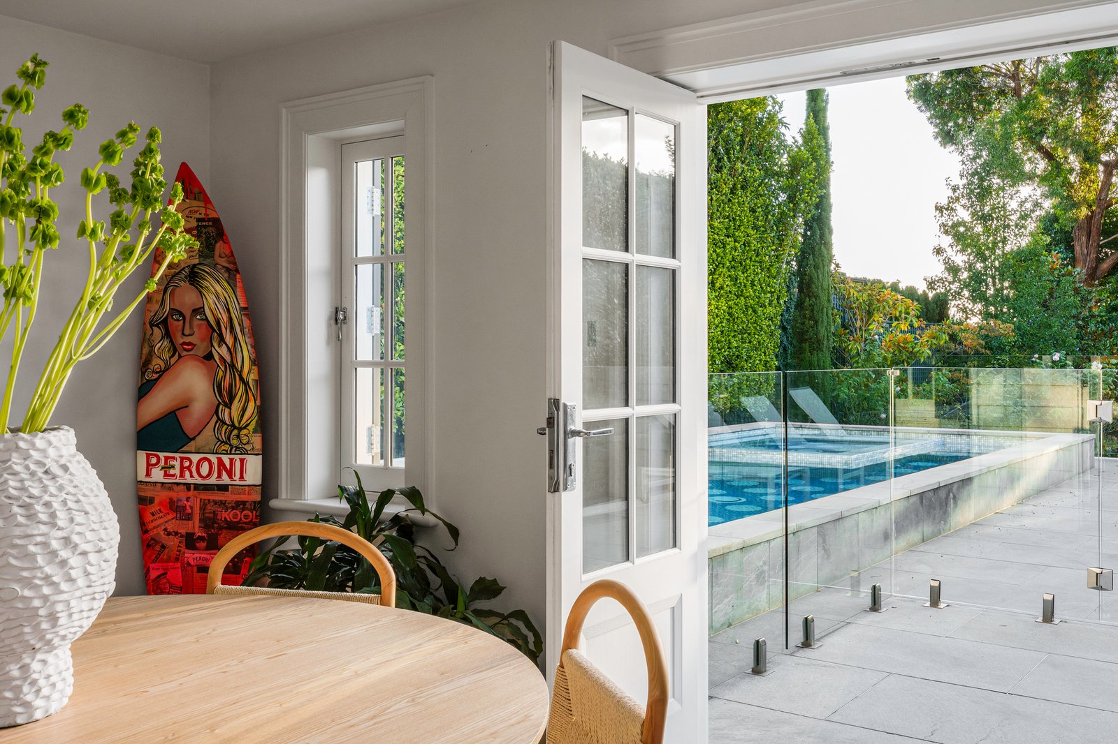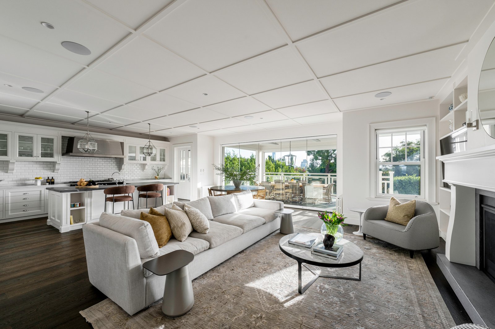 A formal sitting room with an open fireplace and a fully fitted, backlit library establishes a quieter front zone, before the home opens toward the rear for large-scale living and entertaining. Family living and meals centre around a gas log fireplace and built-in storage, flowing directly into a kitchen defined by marble benchtops, a contrasting island and a Lacanche triple oven, with a butler’s pantry set behind, incorporating Sub-Zero refrigeration and integrated laundry. A broad terrace continues through seamless glass bi-folds, featuring an in-built barbecue and overhead heating, and is positioned to overlook the pool, landscaped gardens, and the glistening skyline beyond.