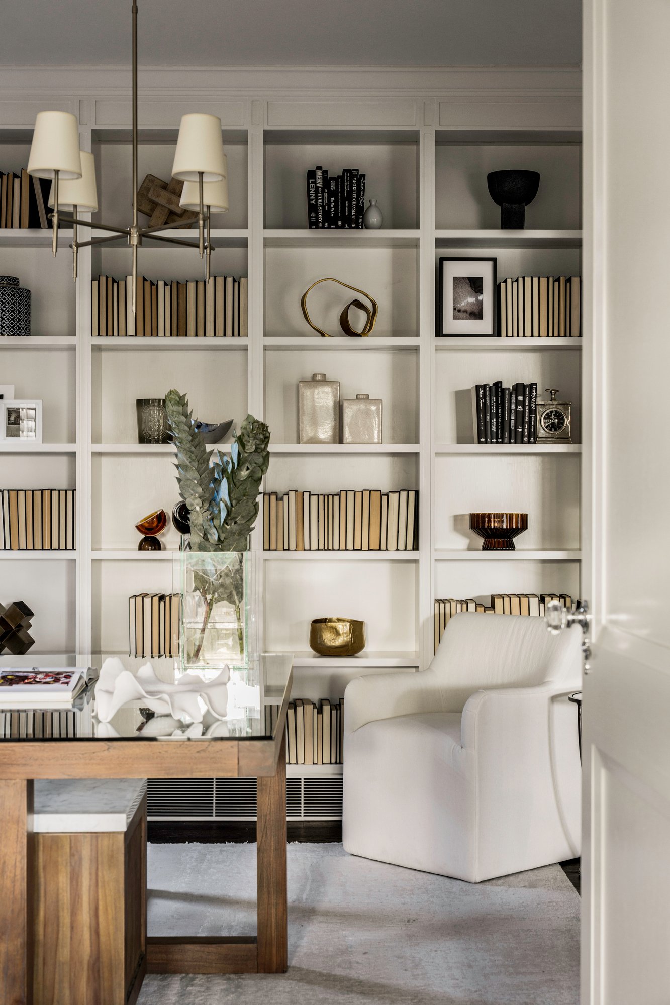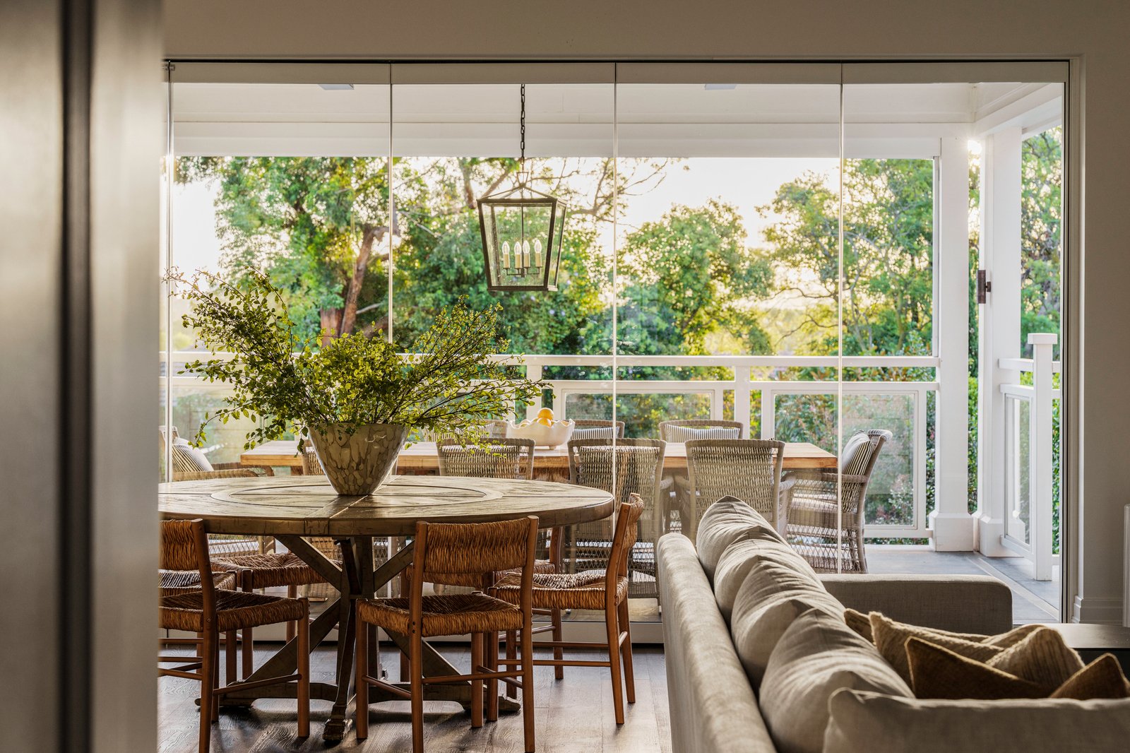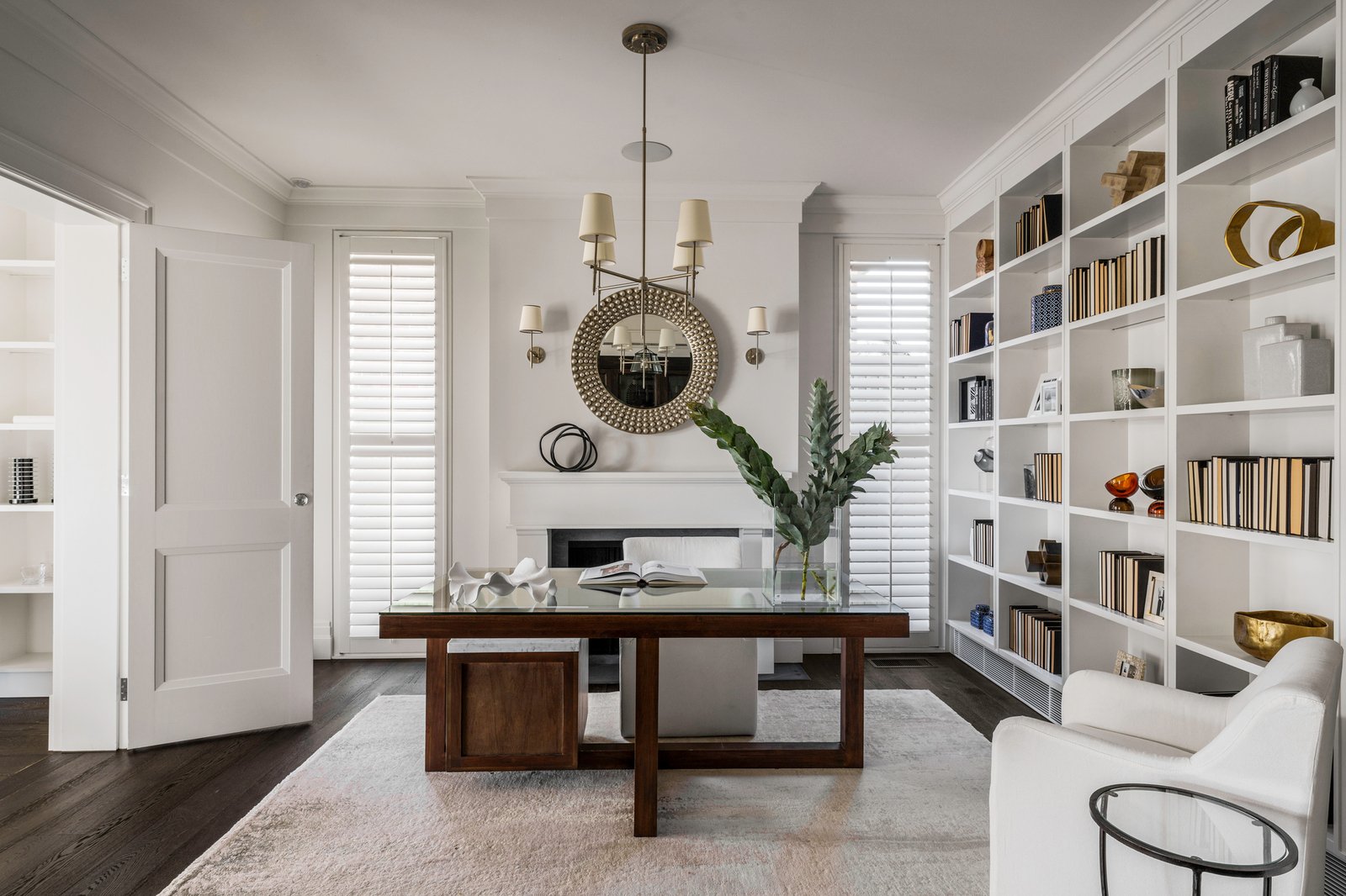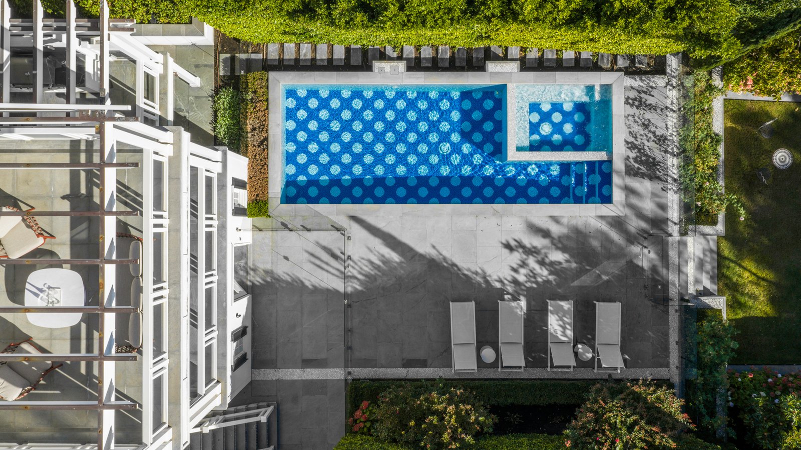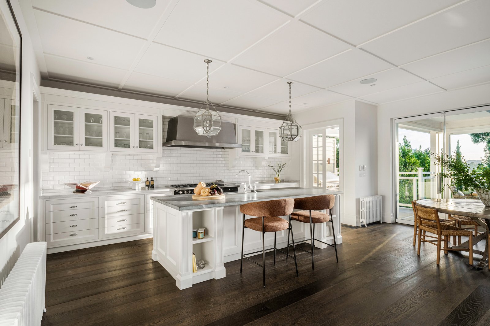 A formal sitting room with an open fireplace and a fully fitted, backlit library establishes a quieter front zone, before the home opens toward the rear for large-scale living and entertaining. Family living and meals centre around a gas log fireplace and built-in storage, flowing directly into a kitchen defined by marble benchtops, a contrasting island and a Lacanche triple oven, with a butler’s pantry set behind, incorporating Sub-Zero refrigeration and integrated laundry. A broad terrace continues through seamless glass bi-folds, featuring an in-built barbecue and overhead heating, and is positioned to overlook the pool, landscaped gardens, and the glistening skyline beyond.