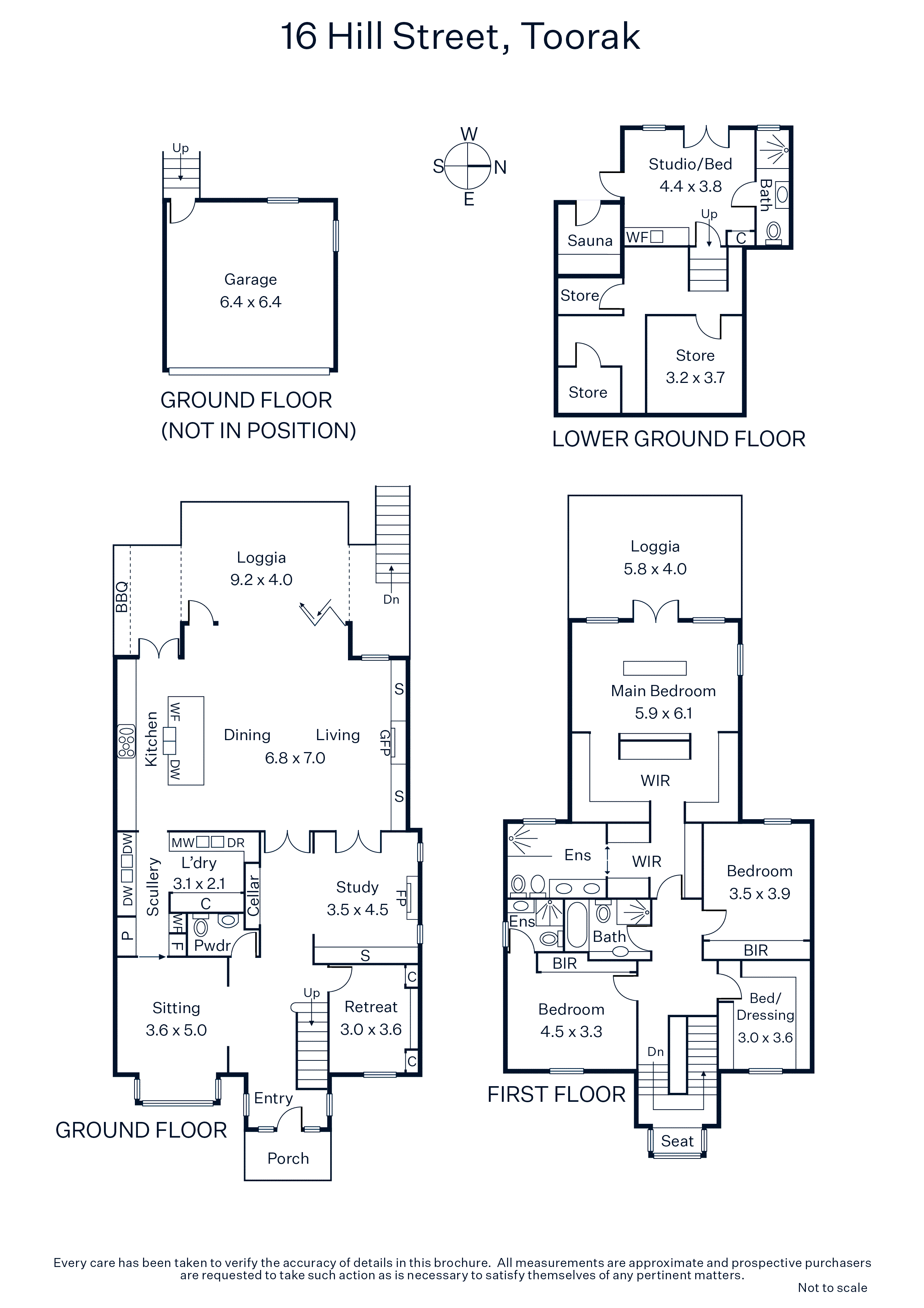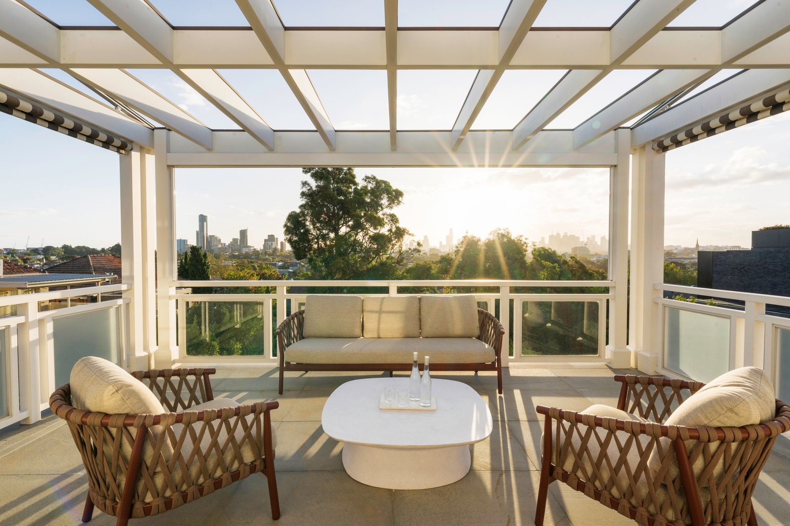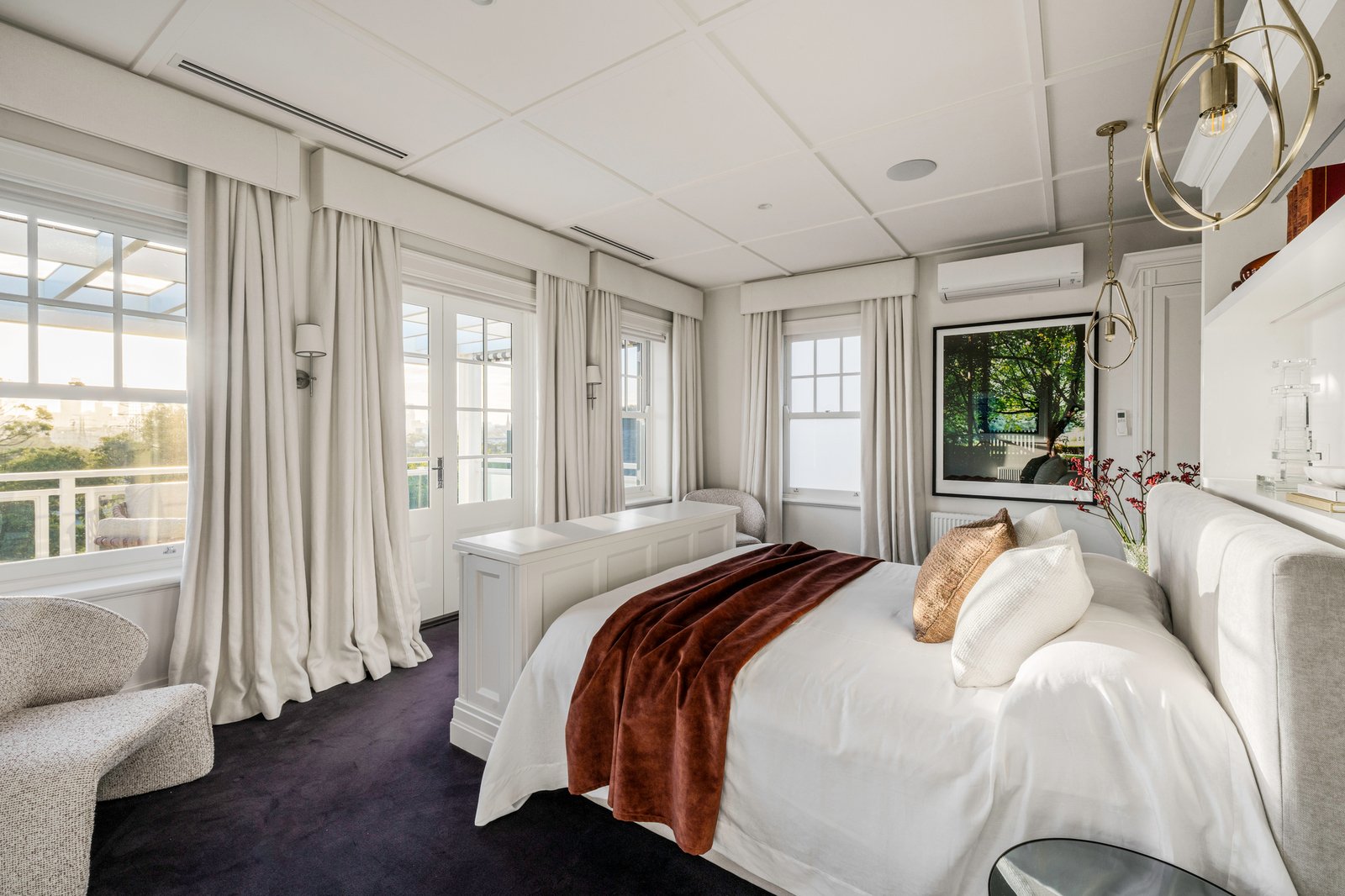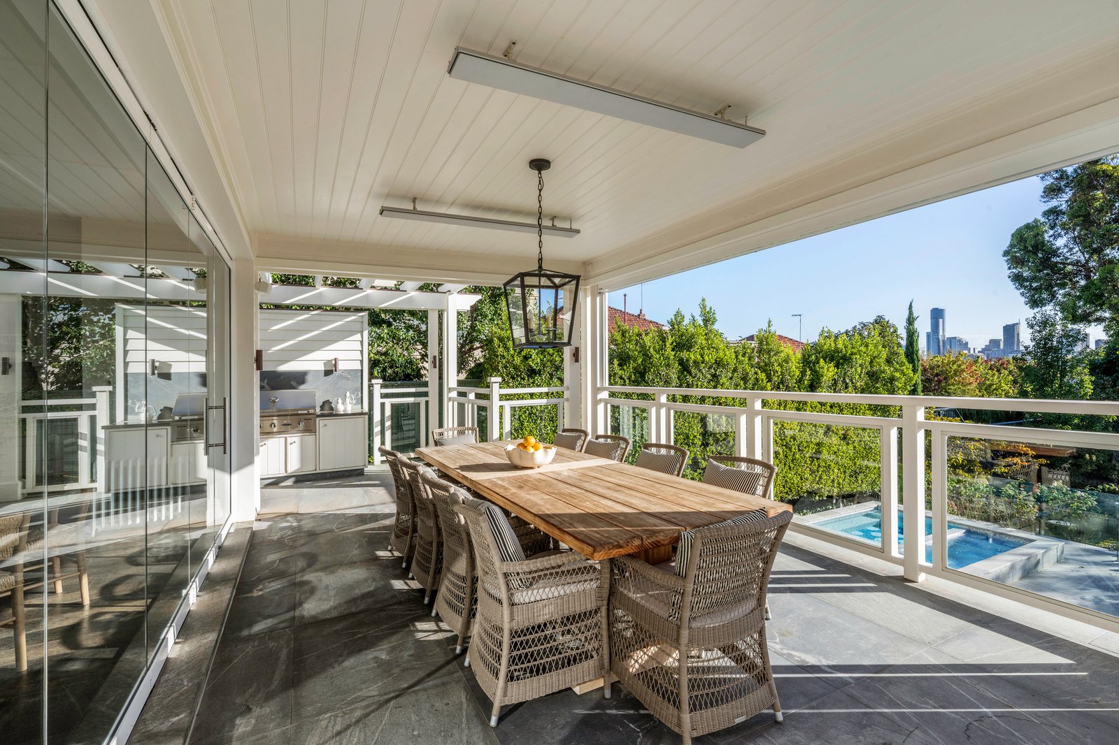 Four bedrooms are arranged across the upper level, with three bathrooms finished in marble and equipped with underfloor heating. The indulgent main suite fronts uninterrupted city views, opening to a broad, undercover terrace, and is appointed with a fitted dressing room, a drop-down ceiling TV lift, and a lavish ensuite. A self-contained lower level adds flexibility, with an ensuite studio, infrared sauna and direct access to the striking garden and bespoke heated pool and spa, allowing the space to operate independently for guests, wellness or summer use. Hydronic heating, reverse-cycle air conditioning, motorised al-fresco blinds, a display wine cellar, various under-house storage rooms, double glazing, integrated sound, security systems, and a double garage complement the move-in-ready luxury, close to Toorak Village, leading schools, transport, and the CBD.