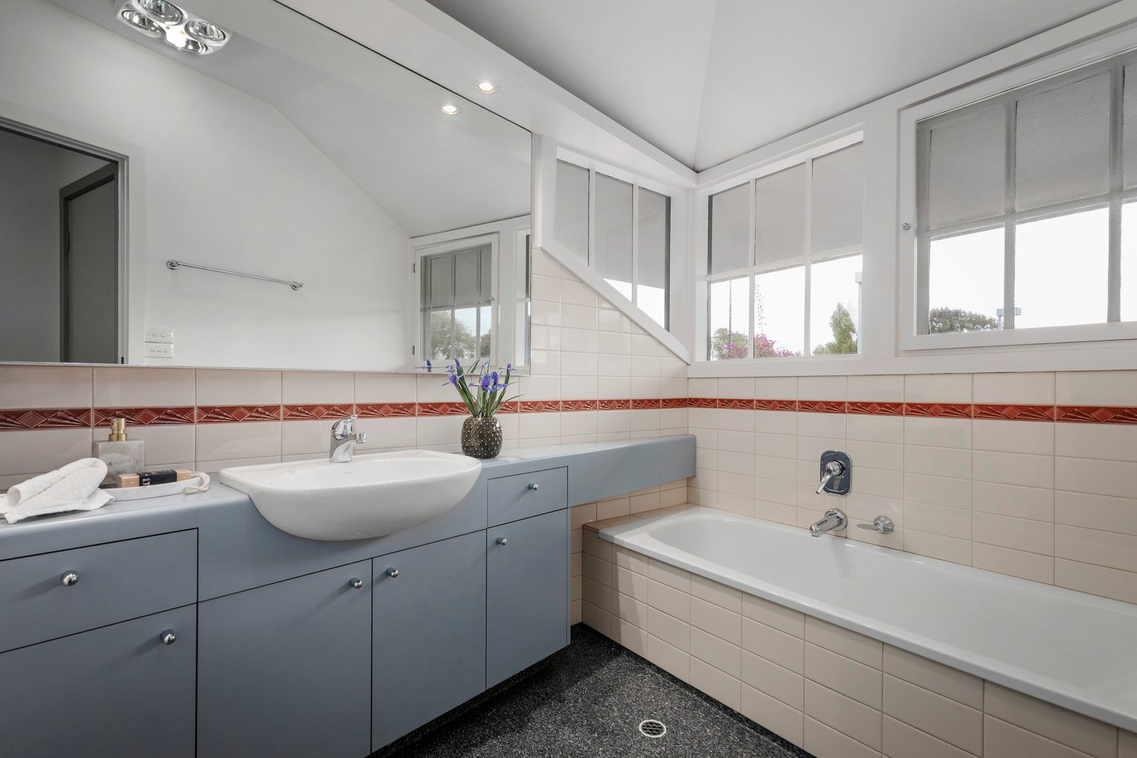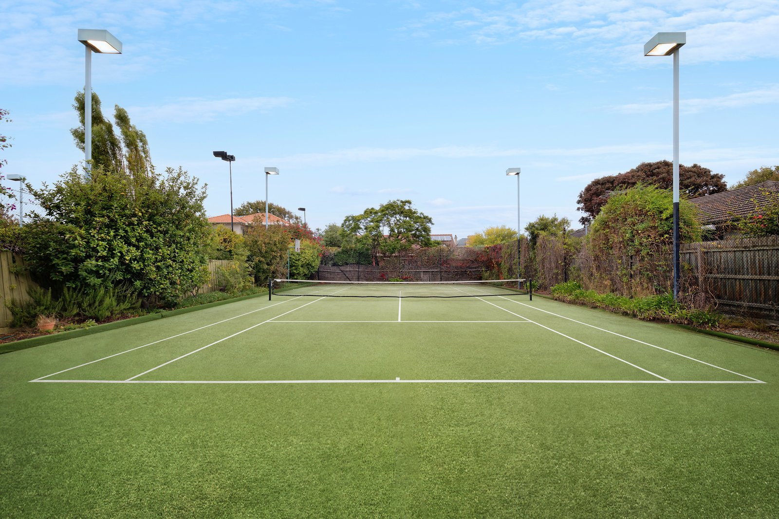 The expansive ground-level living spaces include formal and informal living and dining areas, and the open-plan family zone, headed by a central entertainer’s kitchen with an impressive Rosieres freestanding gas/electric cooker, which looks out over the mod-grass floodlit tennis court. Fitted with a basketball hoop the court is the perfect space for grand-scale parties or a kids’ play area when not hosting a friendly neighbourhood game. Adding to the home’s leisure amenity is a swim spa/plunge pool, perfect for post-match relaxation. There are two bedrooms downstairs including the main with a walk-in robe and shower ensuite, a downstairs bathroom, and laundry with external access. The light-filled upper-level offers bay glimpses and sea breezes, and comprises a further three bedrooms, all with built-in robes, separate bath, shower, and powder rooms, and a sun-drenched northerly facing home office with treetop vistas and water peeks. Storage is abundant throughout including an understairs wine storage space, and under-roofline storage in the upper-level rooms including a kids’ ‘secret’ playroom.