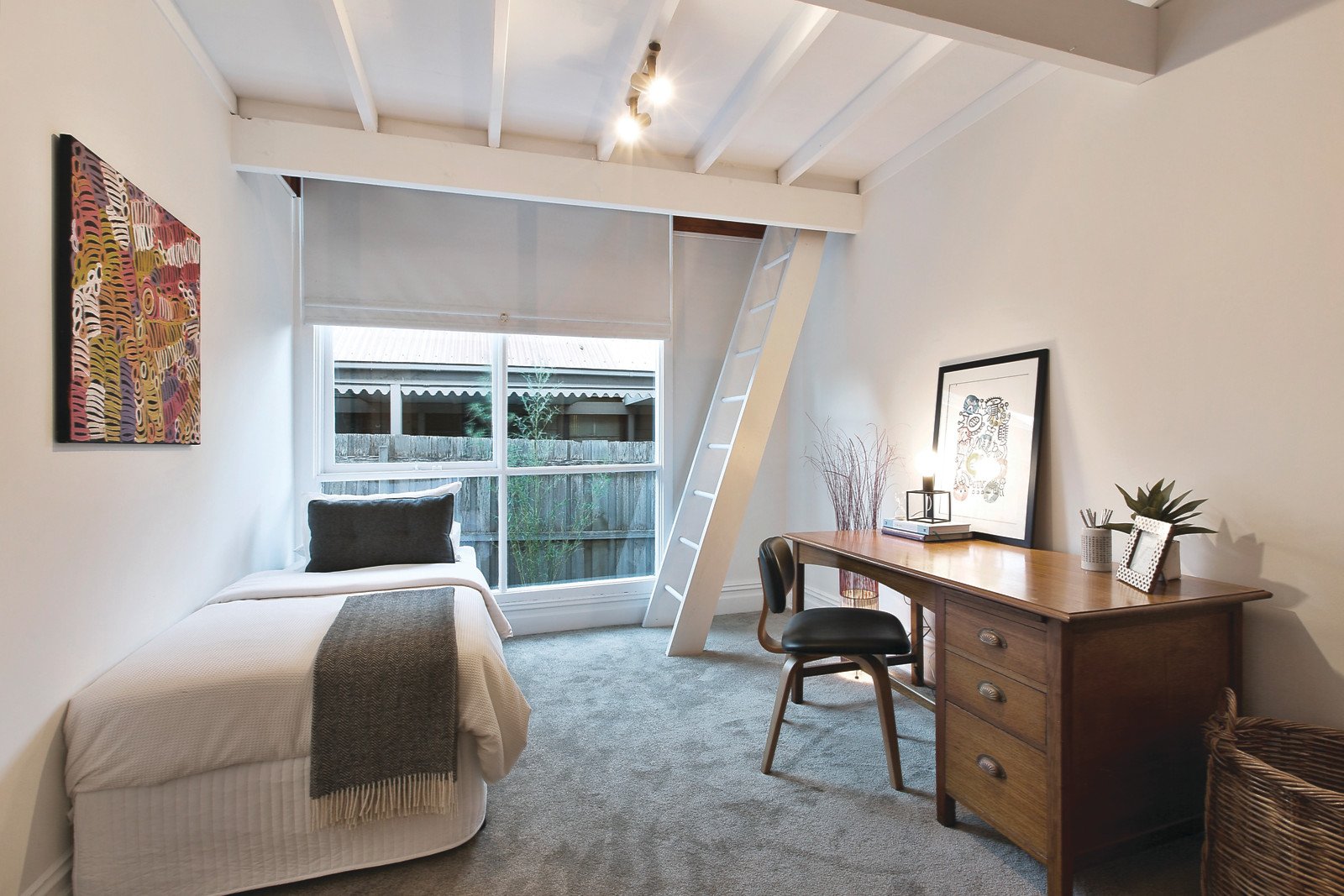 An interior bathed in natural light from large windows combines with a soft, white trimmed decor and warm neutral carpets, giving a charming light ambience to the home. An exposed brick hallway leads to three bedrooms, two with BIRS, the third with a brilliant mezzanine retreat, perfect for kids or escaping to watch a movie or sporting event. The full-width living area and spacious dining room flow to a bright kitchen overlooking a gently shaded deck and leafy back garden, providing a delightful space for entertaining family and friends. Other features include security system, ducted heating and off-street parking with right of way at rear. Offers a low maintenance inner city lifestyle with sought-after amenities for retirees, young professionals or a family to enjoy.