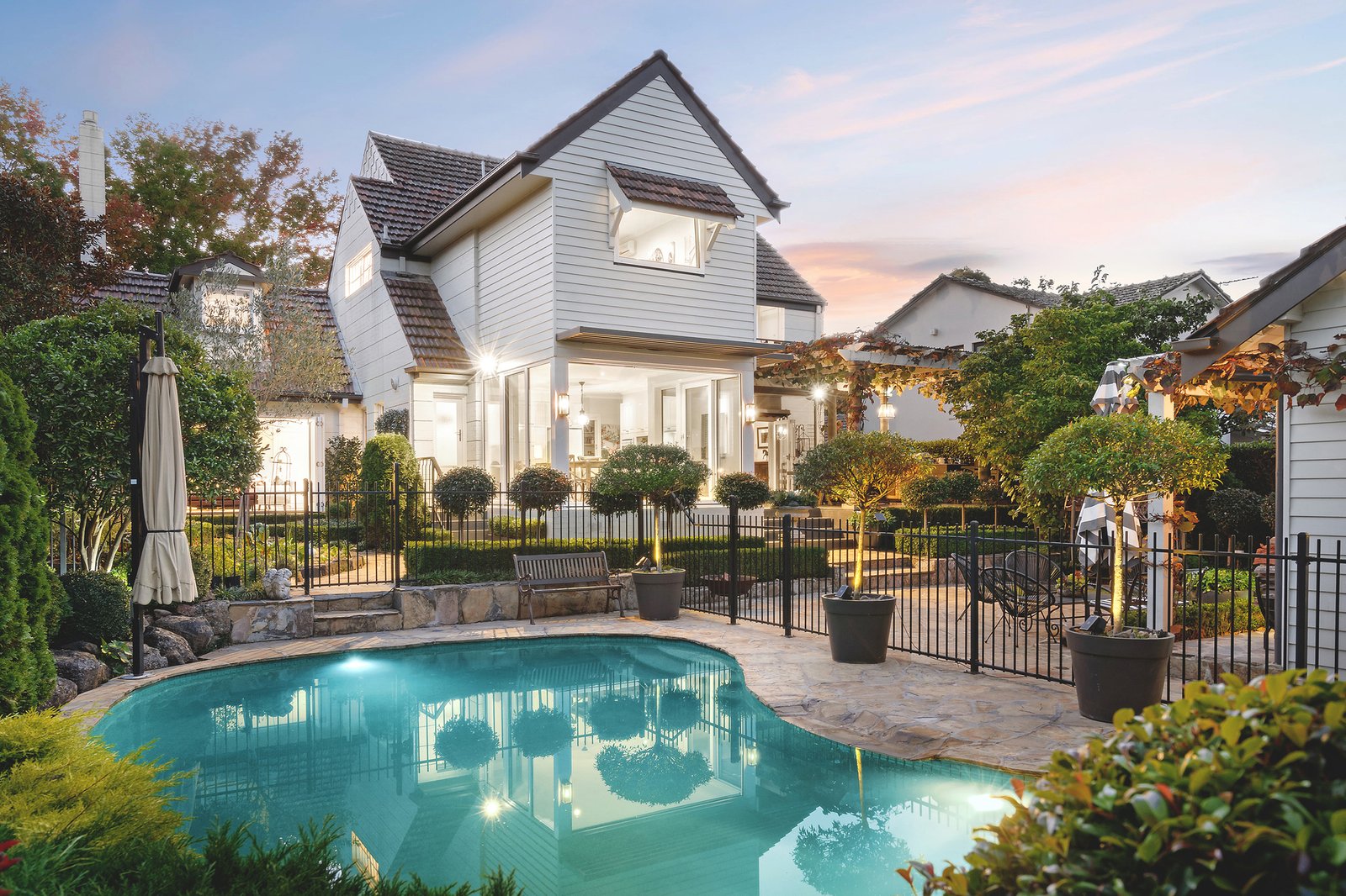 Added modern conveniences include ducted heating, reverse cycle split system air conditioning, comprehensive CCTV, and alarm security systems, solar-heated swimming facilities, and substantial water storage capacity.
