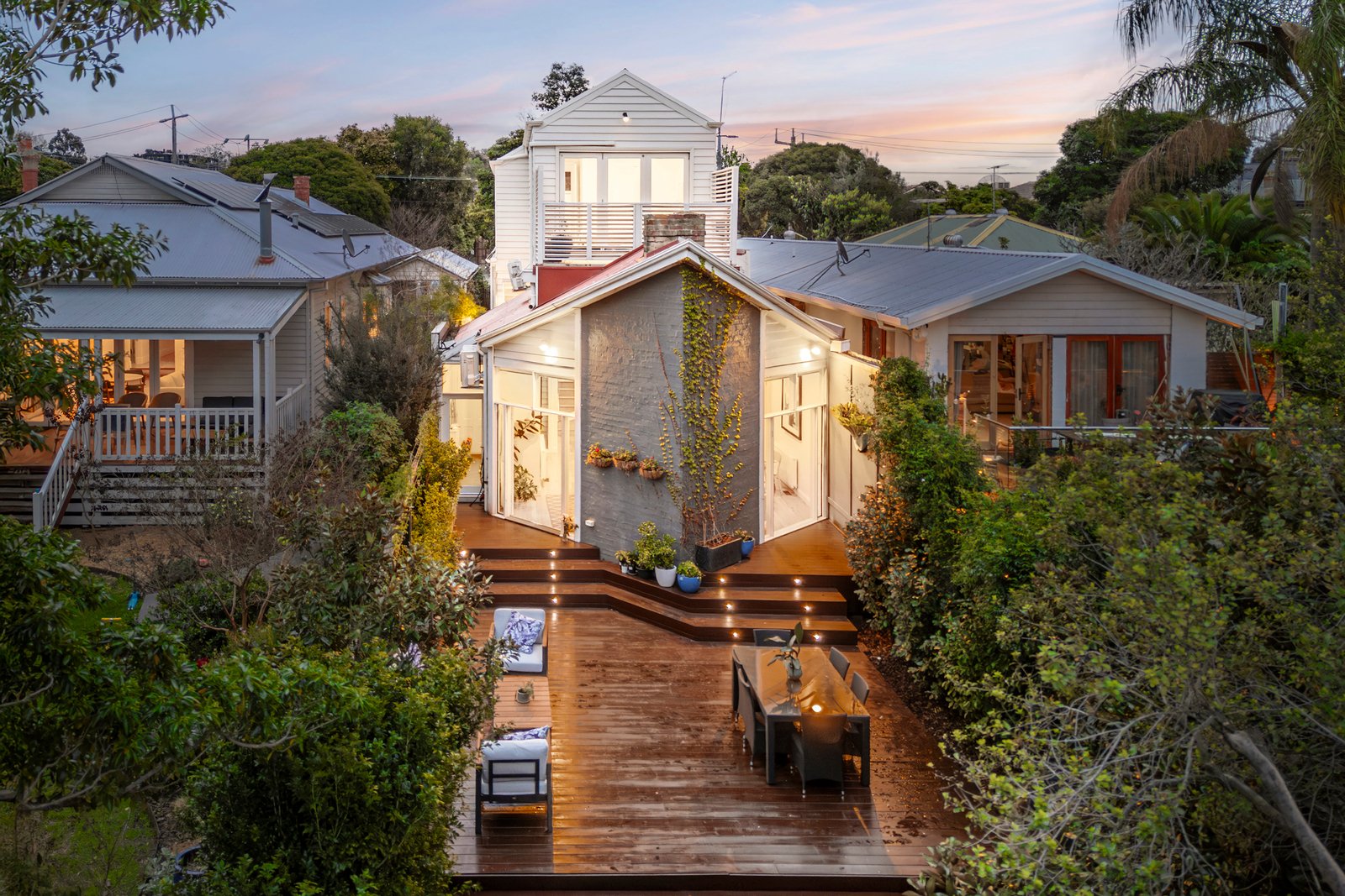 Framed by a landscaped garden and tesselated verandah, a traditional arched hall with Baltic pine floors underfoot flows through to a gracious sitting room with fireplace. Beneath high ceilings the gourmet kitchen appointed with stone benches, Bosch appliances and walk in pantry and the expansive living/dining room with an open fire extend out to the very deep private northeast garden with extensive decking, a serene, leafy oasis for outdoor dining and entertaining. The two double bedrooms with fireplaces and robes, a gorgeous main bedroom with walk in robe and stylish en suite and a family bathroom with auto toilet are on the ground level. Additional accommodation upstairs comprises a fitted home office and double bedroom with walk in robe, chic en suite with auto toilet and a private balcony offering views to the surrounding ranges.
