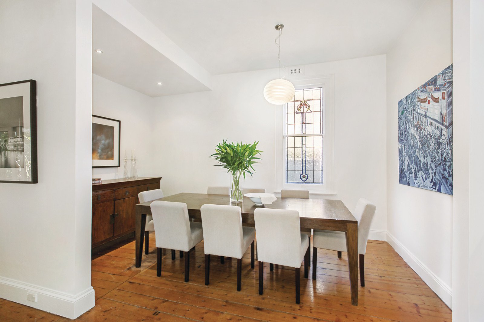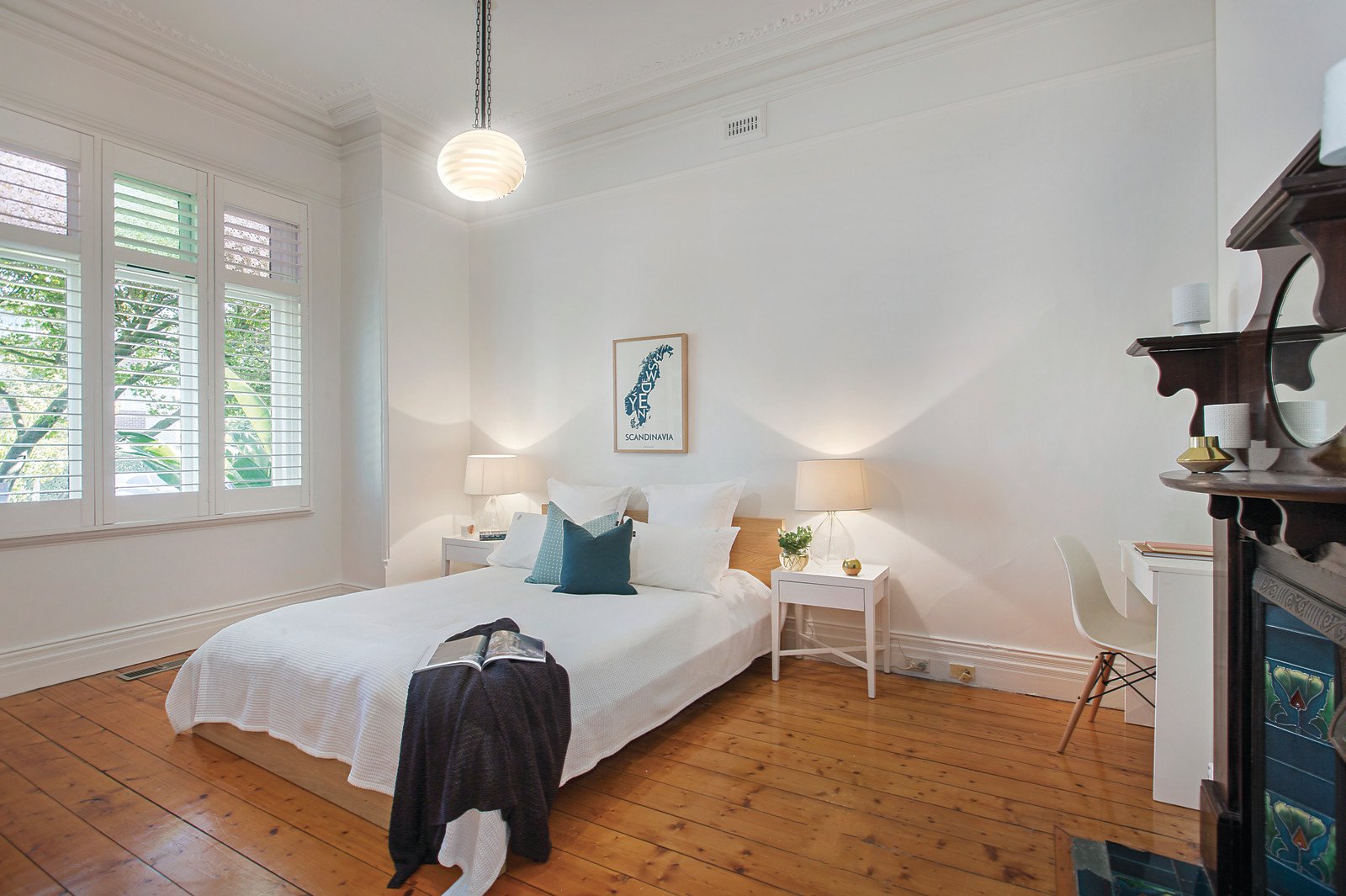 Baltic pine floors flow through the central hall to the beautiful main bedroom with open fireplace, dressing room also with an open fire and en-suite/bathroom, two additional double bedrooms with open fireplaces and a second bright bathroom. An open fireplace separates the inviting dining room from the well-appointed country style kitchen boasting an original wood fire stove. An expansive light-filled living room opens to the deep northeast hedged private garden.