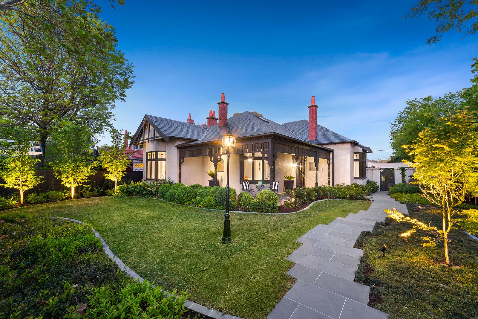 The picturesque gardens, brilliantly rendered exterior and the new black slate roof creates a sensational first impression matched inside by wide oak floors, high ceilings and customized lighting. The central entrance hall introduces a serene study with open fire and bay window, an elegant sitting room also with an open fire and bay window and a gorgeous formal dining room. At the heart of the home, the state of the art European kitchen boasts sublime marble benches, integrated fridge/freezer, an Italian Lofra oven and a butler's pantry. The light-filled family dining room and a separate and expansive living room open to the captivating landscaped gardens featuring a solar heated pool, extensive bluestone paving and a sleek 2x carport that doubles as an entertaining terrace. The luxurious main bedroom with lavish dressing room and designer en-suite enjoys its own space downstairs. A fabulous children's zone comprises two additional bedrooms each with a stylish en suite and built in robe and a playroom. In a second upstairs area, there is a 4th bedroom with chic bathroom and retreat, ideal as a guest/teenage suite or as a home office.