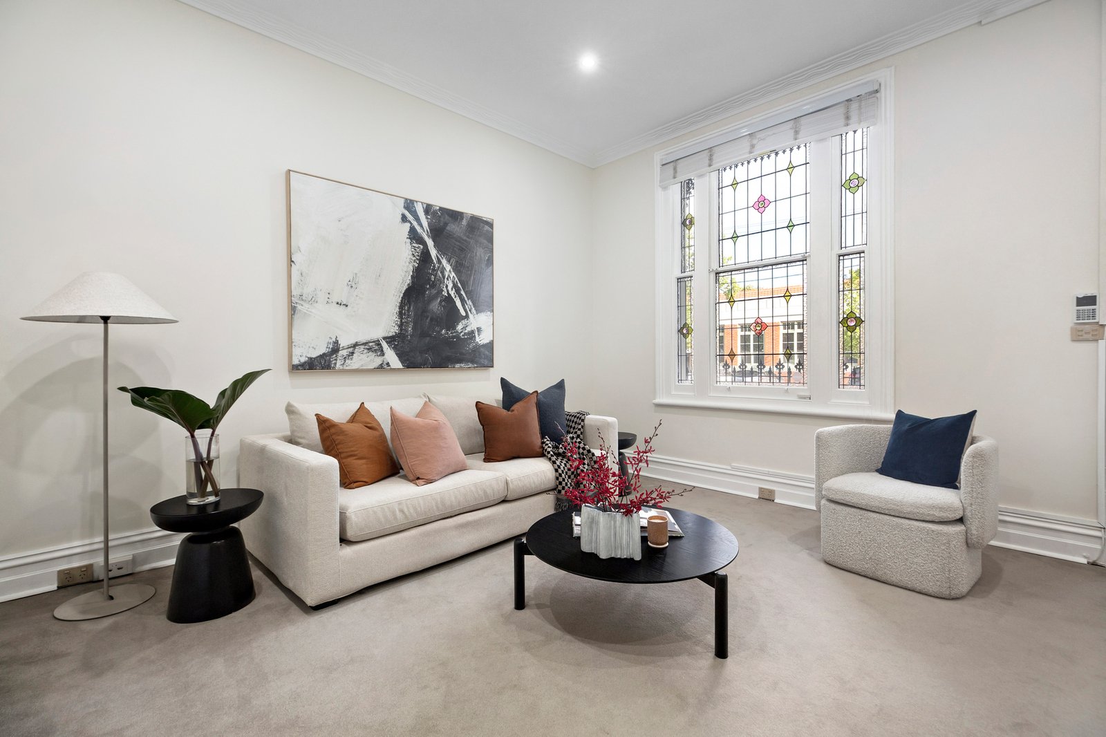 High ceilings, traditional leadlight and a versatile layout shape an inviting series of rooms, supported by multiple entry points and a location within walking distance of Clarendon Street, Albert Park Lake and the Royal Botanic Gardens. Beyond the imposing façade, multiple ground-floor rooms adapt to a range of needs. Three sizable bedrooms or offices line the ground floor, offering flexibility of a living room or reception space.