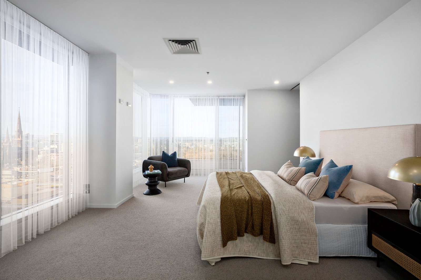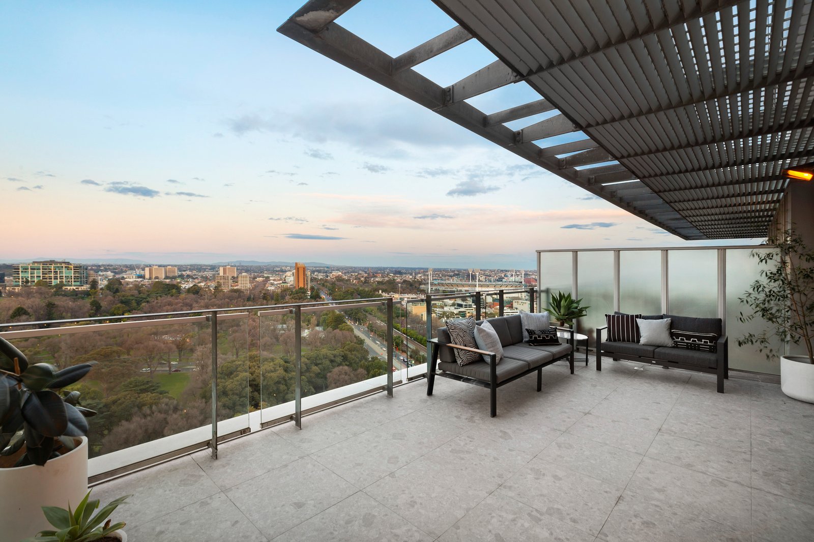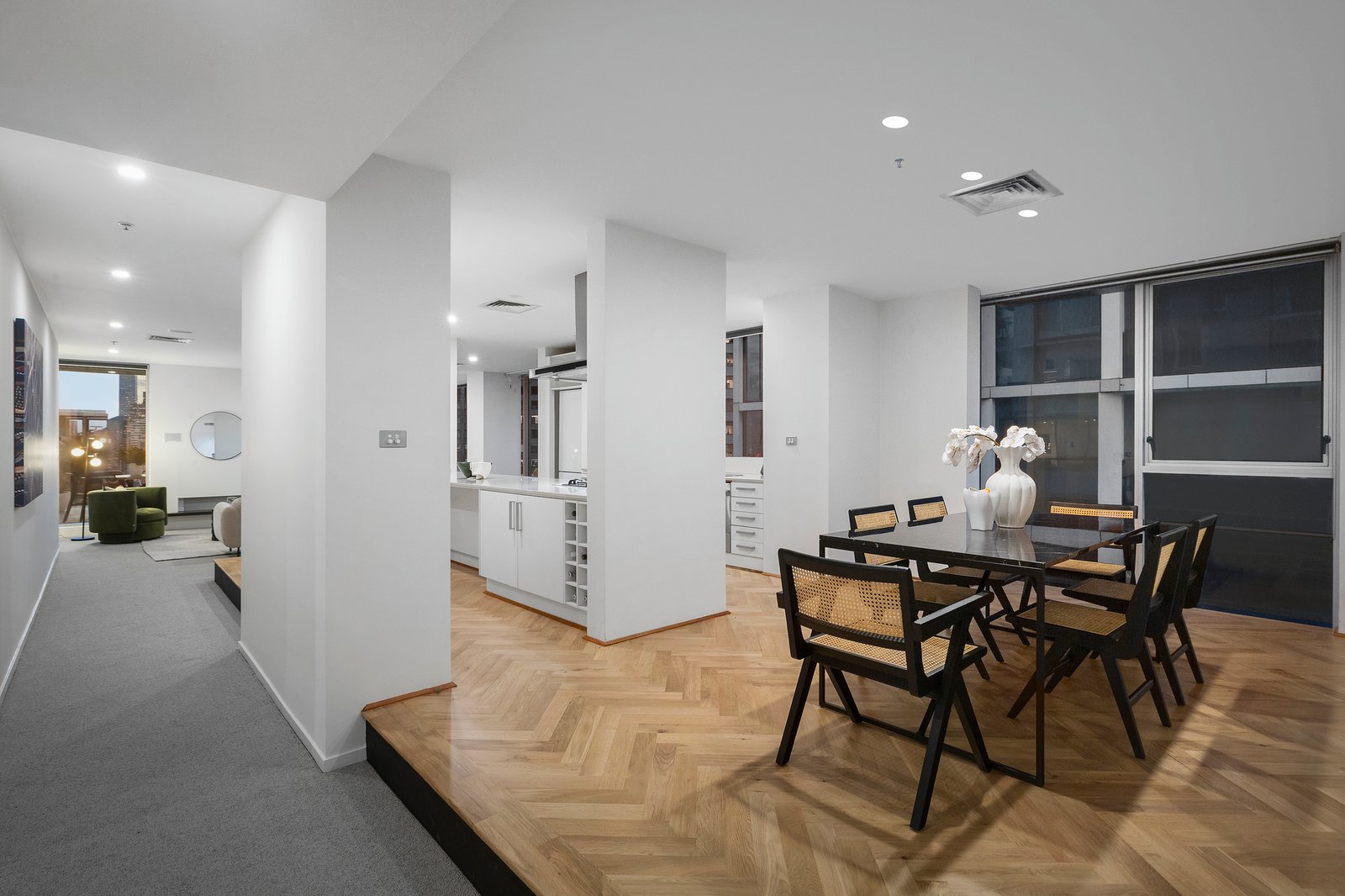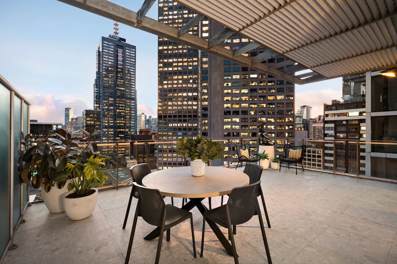 Distinguished by two expansive alfresco terraces aligned for celebrating world-class vistas of Melbourne’s most iconic sporting and cultural landmarks, this luxurious, recently renovated three-bedroom, three-bathroom sub-penthouse apartment is exclusively located in Spring Street’s esteemed Philadelphia building.