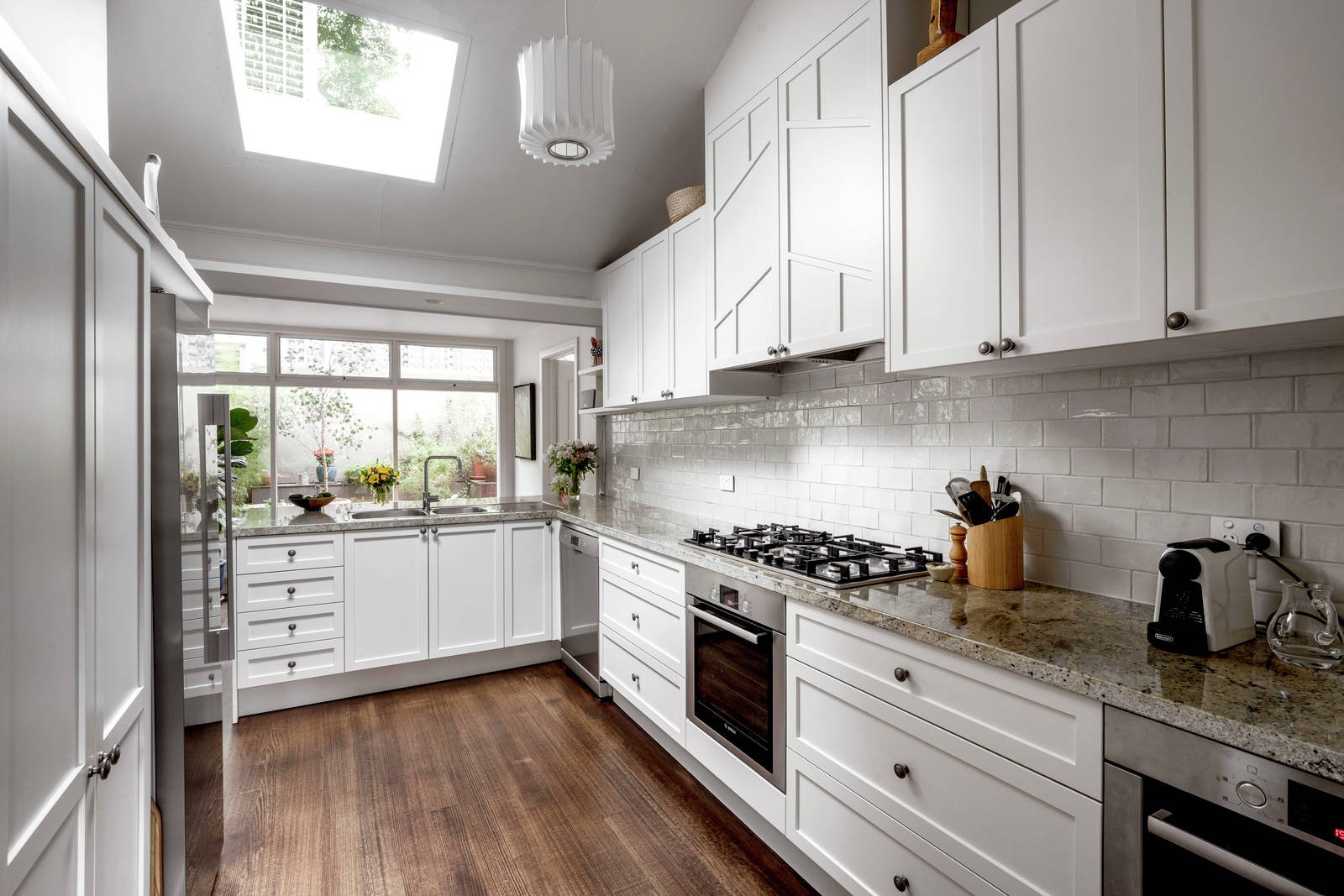 Combining iconic architectural elements, its relaxing and welcoming layout combines a pair of living rooms each with open fireplaces and bathed in natural sunlight through Chevron windows. The dining room with vistas looking out to the garden and entertaining deck is complemented by a stylish modern kitchen with stone benchtops, European appliances, and a separate meals area.