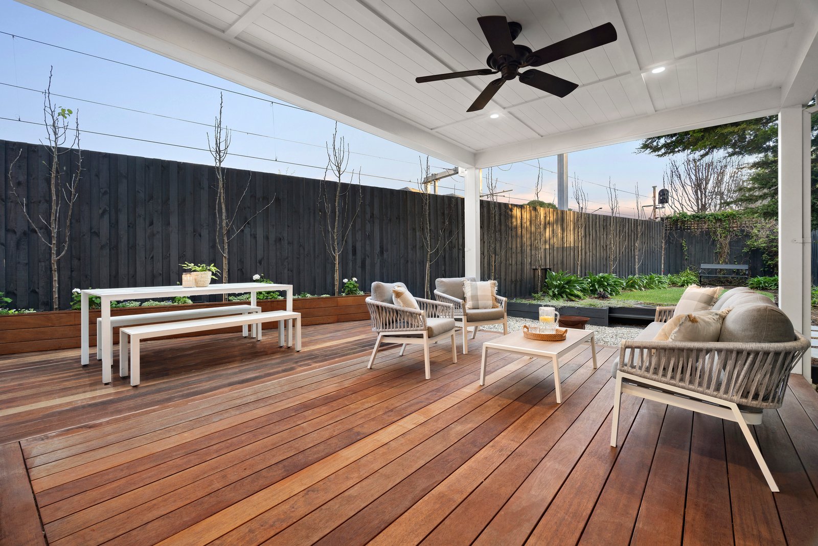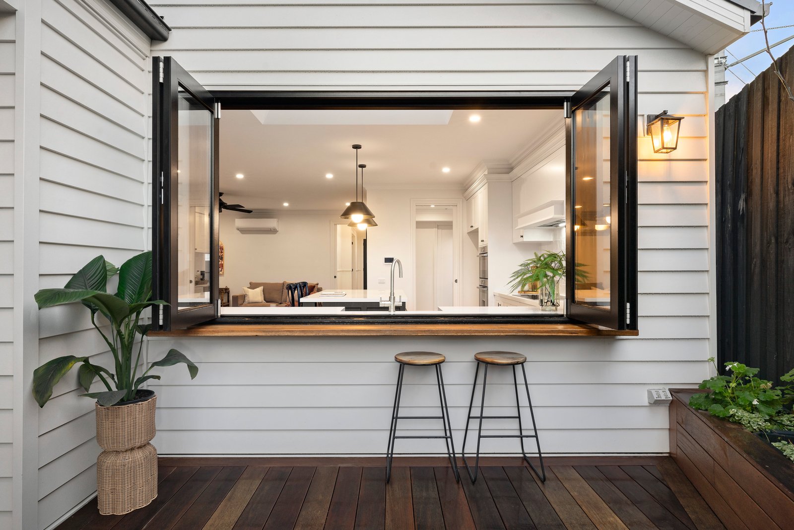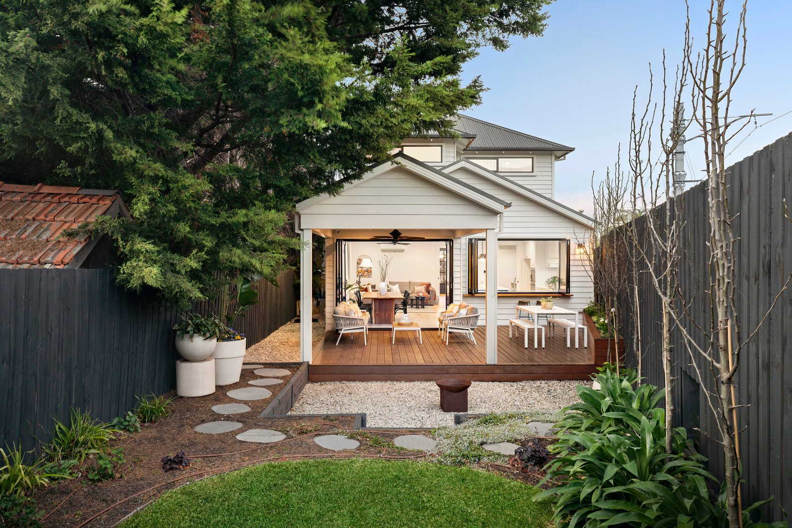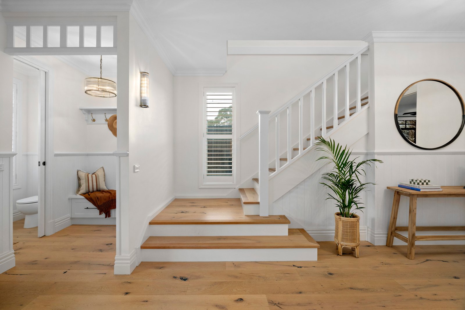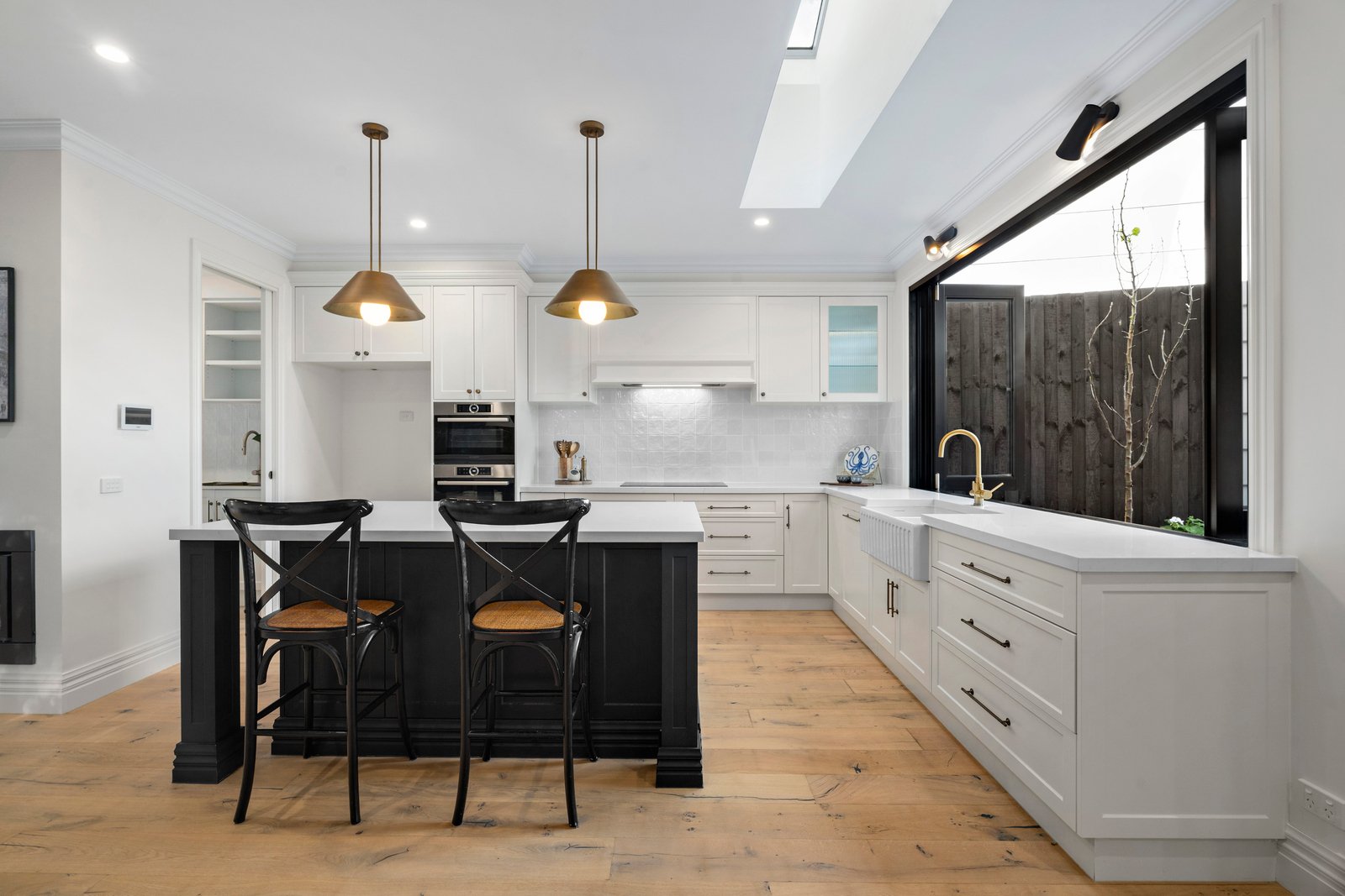 Offering privacy and security, the rear-set double-storey weatherboard-clad home is rich in timeless architectural style and traditional elegance. Inside, the generously proportioned and beautifully appointed spaces are introduced in the classic dado-panelled entry hall where engineered oak flooring flows towards the main open plan living and entertaining area with gas log fire heater, while large-format skylights draw in an abundance of natural light. Illuminated by a pair of metallic designer pendants above the gleaming island bench, the gourmet stone kitchen is equipped with top-of-range Bosch appliances including an induction cooktop, a convection oven and a combi/steamer oven, while the adjoining walk-through butler’s pantry/laundry offers fabulous storage and preparation amenity. Bi-folding double-glazed doors open to the undercover alfresco area that overlooks the private landscaped back garden, fully fenced with a lush lawn area.