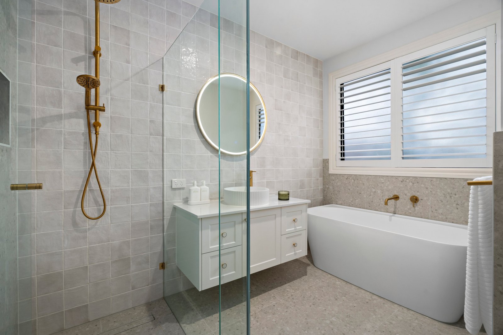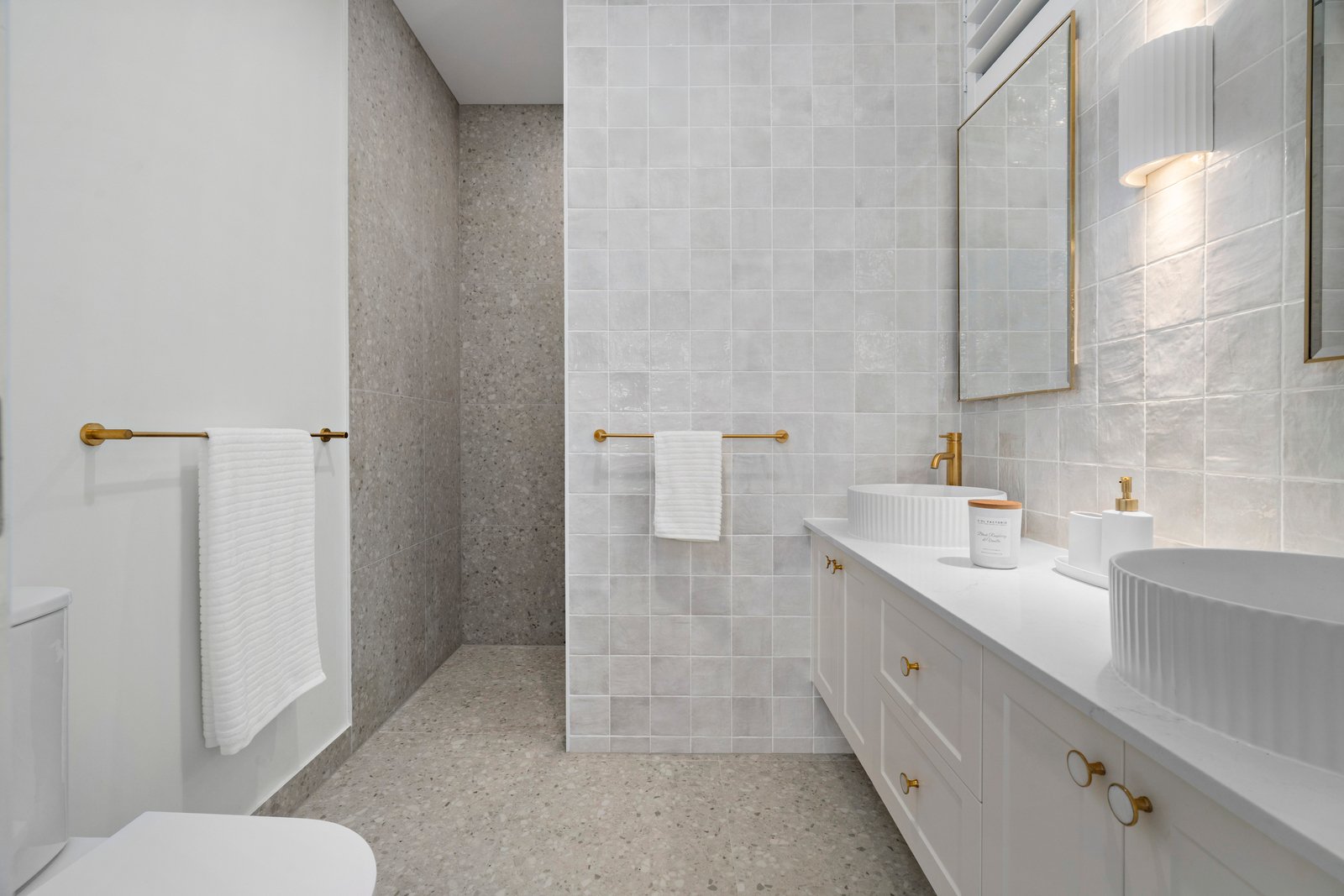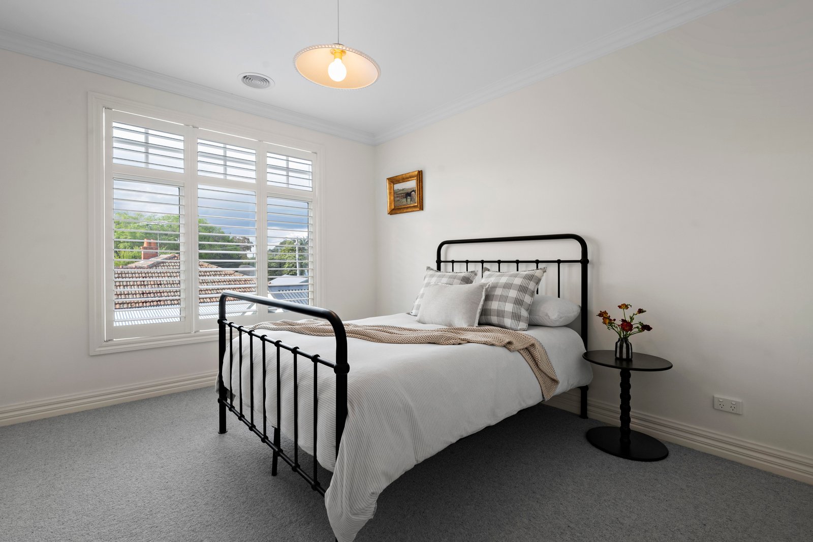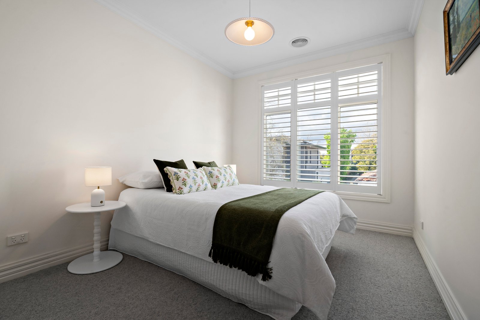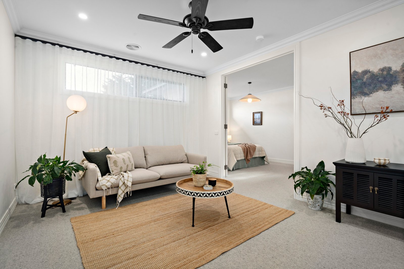 Designed for multi-generational and zoned single-level living, the main bedroom suite is positioned at the front of the home and incorporates a fitted walk-in robe and a luxe terrazzo ensuite with a walk-in dual head shower, while sumptuous loop pile carpets, a timber-panelled bed backdrop and plantation shutters enhance the classic Hamptons styling. Upstairs, the soaring dimensions and impressive appointments continue in the second living room/study, three generously sized bedrooms, and a luxe main bathroom with stone and terrazzo tiling and brushed brass tapware and fittings, all complementing the cohesive colour and materials palette used throughout. Additional features include powder rooms on both levels, a double garage with a remote door, off-street parking, rooftop solar and hot water system, split system heating and cooling and a CCTV security alarm system.