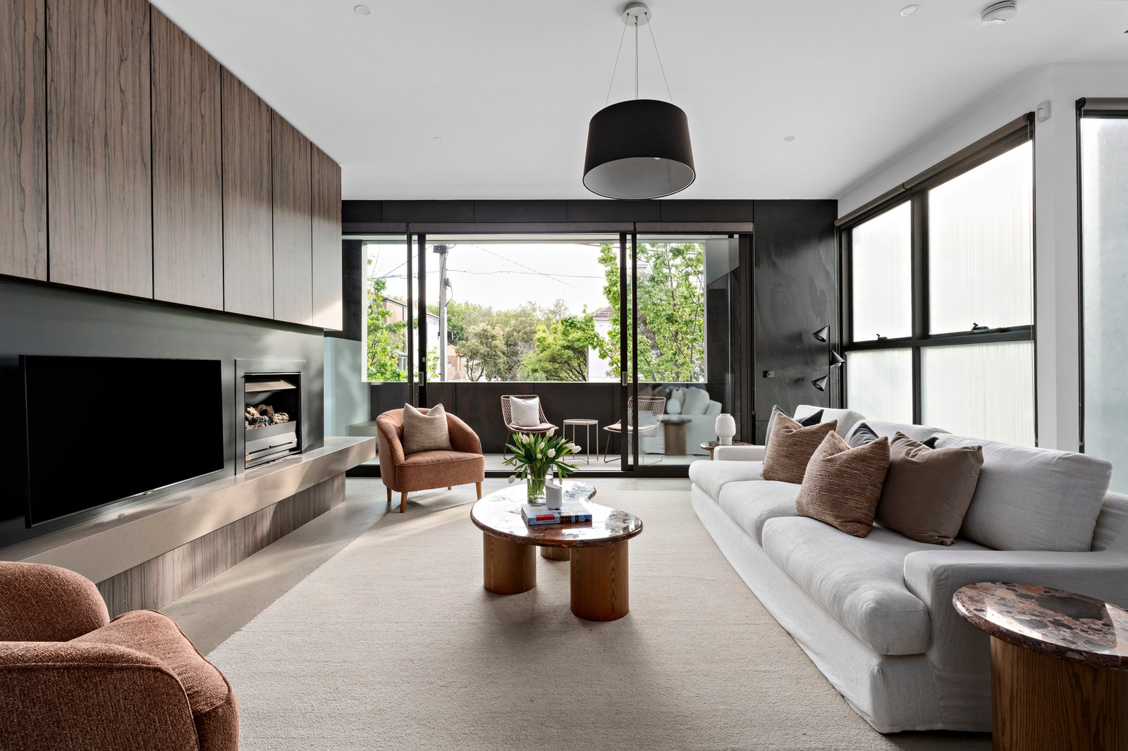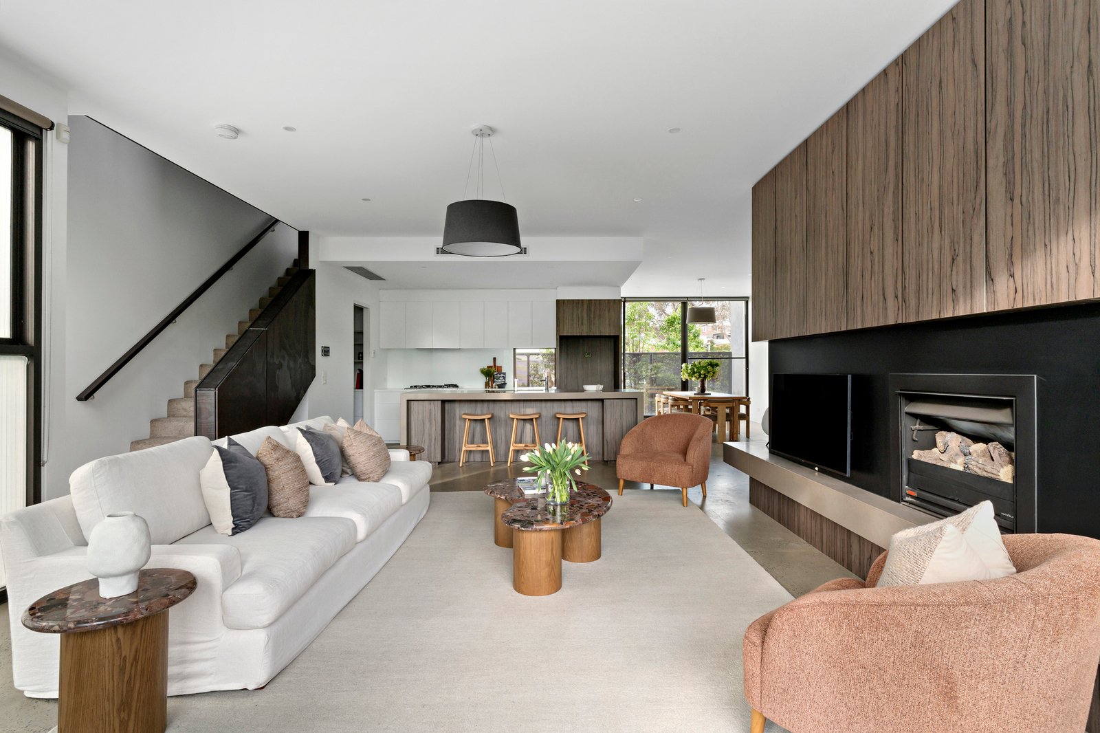 From the distinctive streamlined facade to the interior palette of polished concrete and stone, every element highlights unrivalled attention to detail. Designed to sit harmoniously within its landmark tree-lined setting, the gardens are lush and embracing, welcoming high ceilings, full-height doors, and glass panels that highlight the outlooks over three substantial levels. Elevated on the first floor, the expansive open plan living and dining areas wrap around to meet north and south-facing terraces, perfect for year-round entertaining, with a mains gas point for the BBQ to the rear. A gas fireplace keeps the atmosphere ambient and warm, supported by a premium Miele-appointed entertainer's kitchen, with a large island bench, a Ziptap and a walk-in pantry.