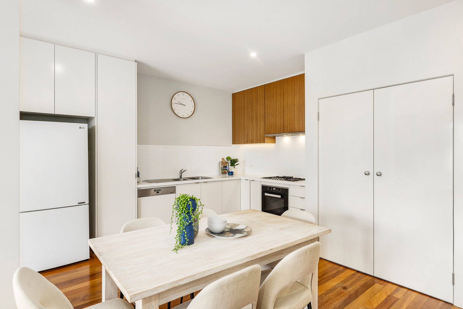 Inside, high ceilings and abundant natural light define the open-plan living and dining domain, connecting via full-height sliders to a generous and private north-facing balcony — ideal for alfresco meals and quiet retreat. The sleek kitchen is appointed with Caesarstone benchtops, a suite of Miele appliances, including a five-burner gas cooktop, oven, and semi-integrated dishwasher, all complemented by ample cabinetry.