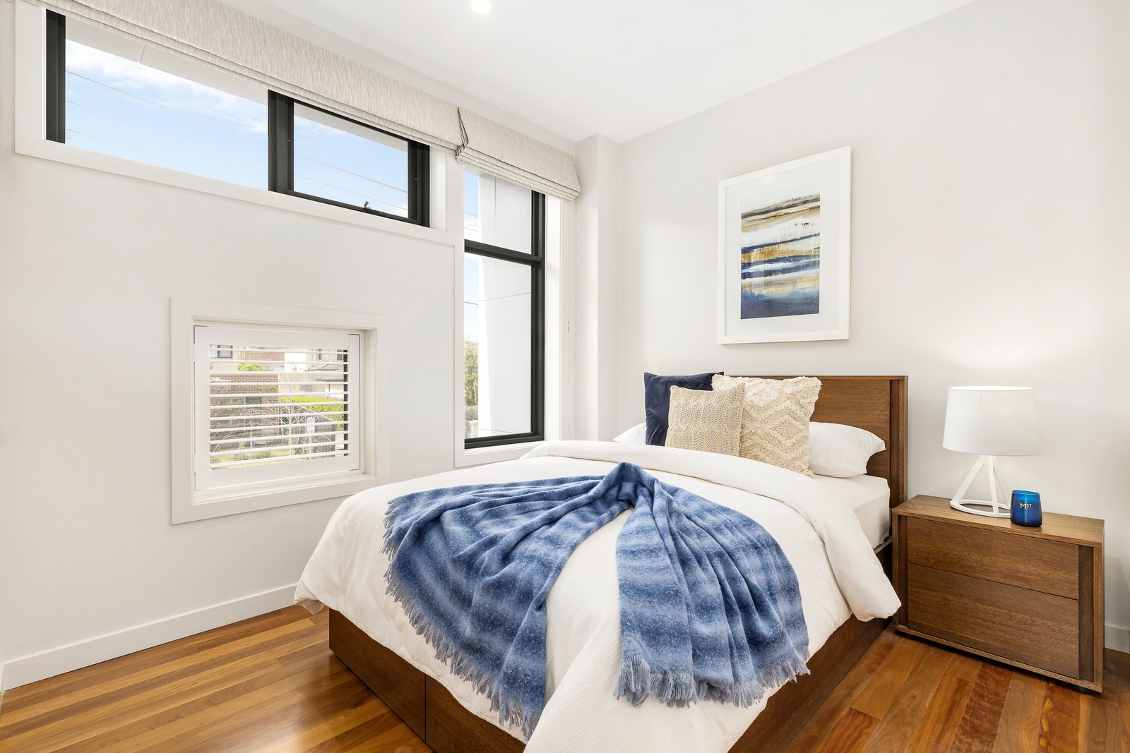 Accommodation comprises two well-zoned bedrooms: the main with built-in robes and a pristine ensuite, and a versatile second robed bedroom serviced by a central bathroom. A generous European laundry, three split-system units, double-glazed windows, polished spotted-gum timber floors and excellent storage further enhance comfort and practicality.