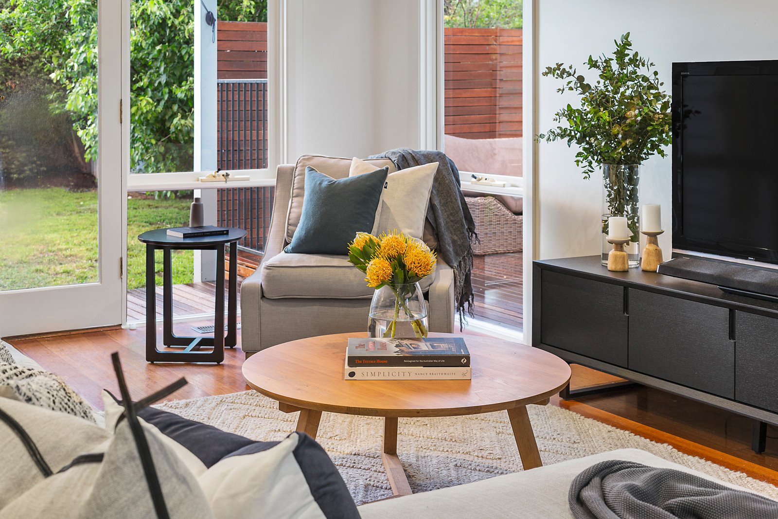 The double door entry reveals a wide hall featuring timber paneling and Baltic pine floors, a gracious sitting room with open fireplace and timber paneled walls and formal dining room with an open fireplace. Timber floors flow through the bright well appointed kitchen, sunny dining area and the expansive living room opening to a central north-facing terrace, a deck with swim-spa and the deep private northwest garden. Two double bedrooms with a modern bathroom are complemented by two additional bedrooms with built in robes and a second bathroom in a separate wing.